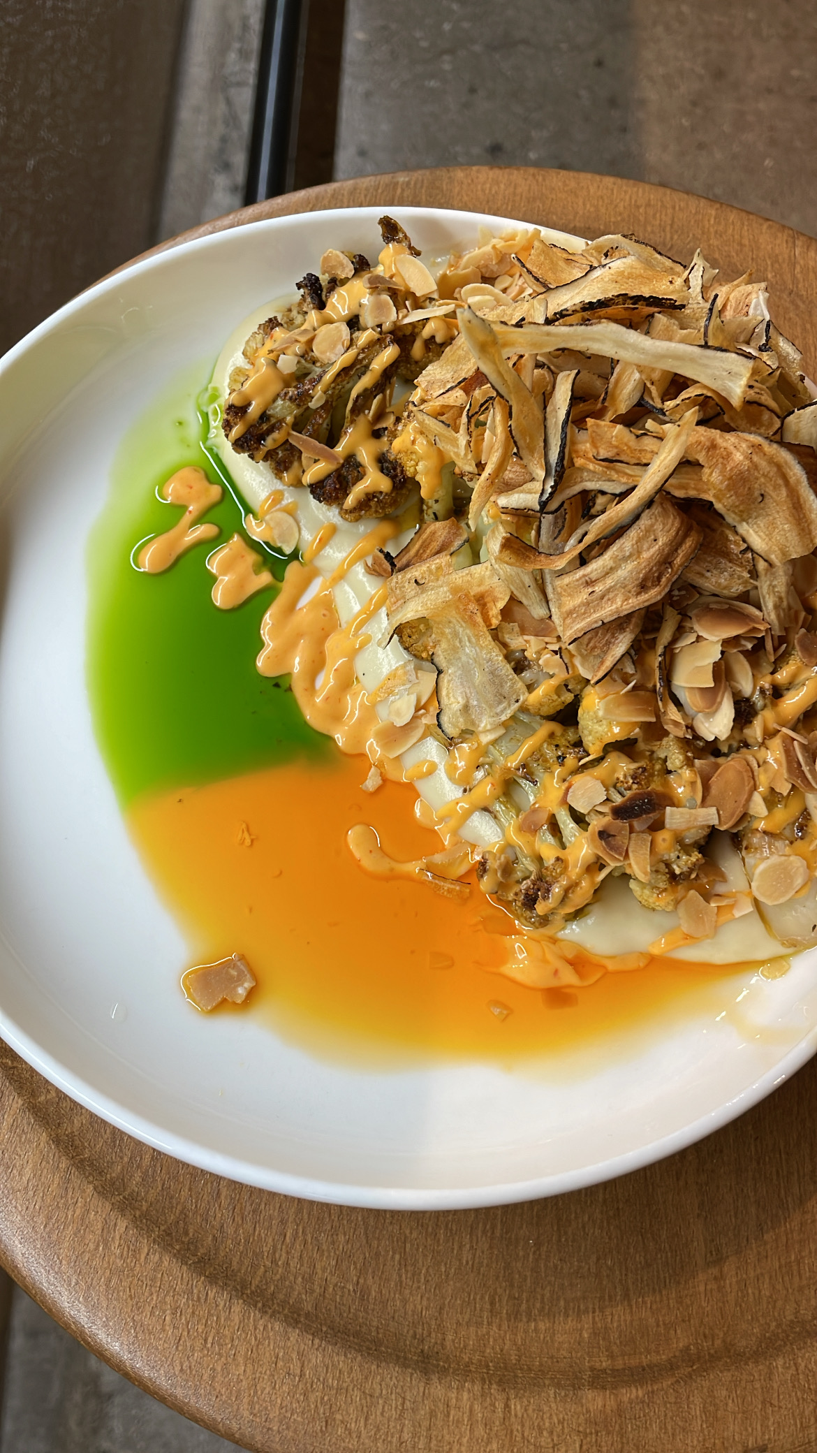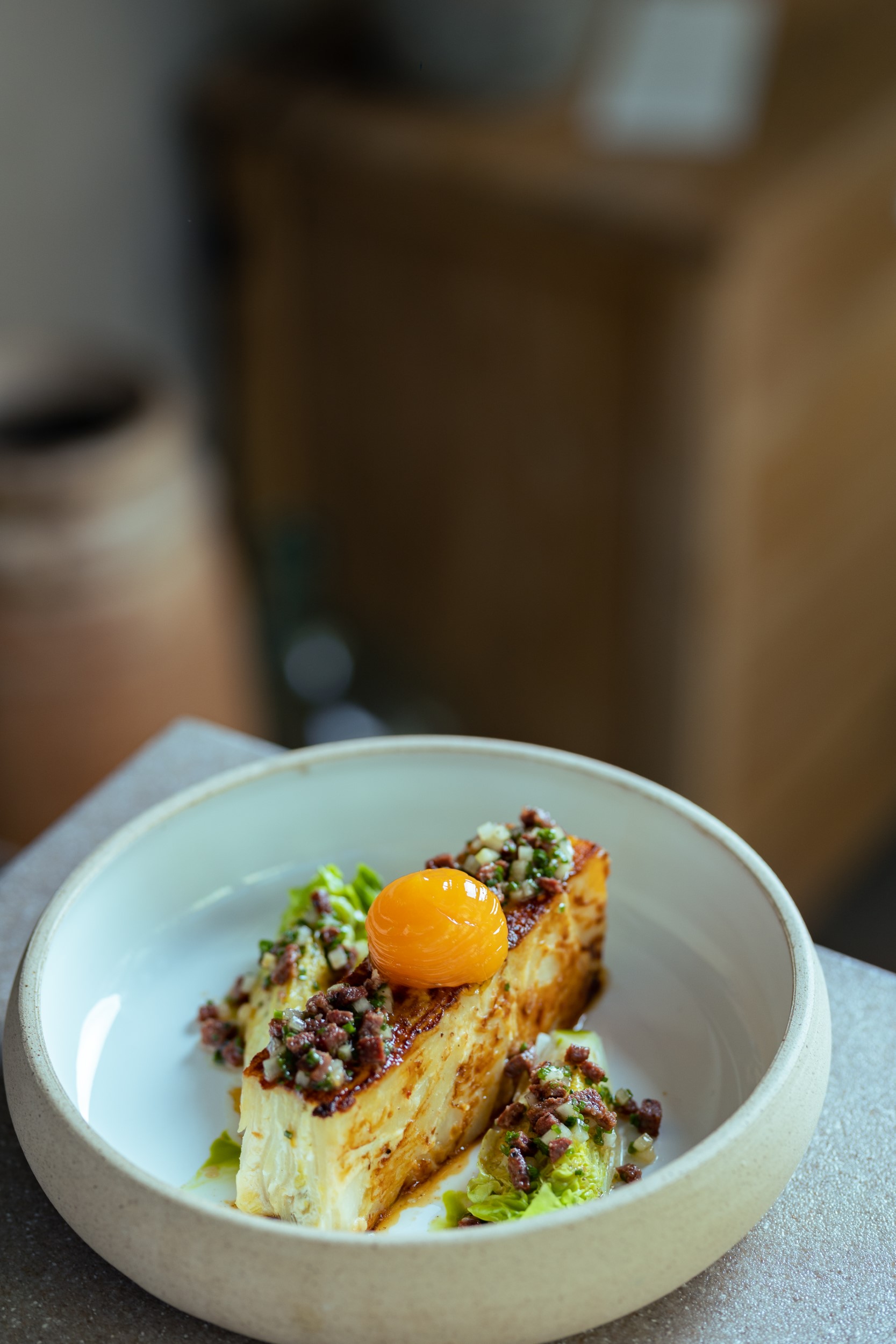 Το μενού είναι μικρό, 17 πιάτα όλα κι όλα, αλλά πιάτα δουλεμένα, με χαρακτήρα και άποψη (κάπου κάπου φλερτάρουν και με έθνικ υλικά) και που δεν σε αφήνουν να πλήξεις ούτε στιγμή. Για παράδειγμα, είναι αυτή η καταπληκτική ταραμοσαλάτα με πούδρα χαρουπιού και λάδι μυρωδικών. Μια αλοιφή αφράτη και βελούδινη με τη χαρουπόσκονη να ακούγεται κομψά και, πάνω από όλα, ένα πεντανόστιμο λάδι όλο φρεσκάδα και ένταση. Ένα έδεσμα να το φας με το κουτάλι. Πόσο μάλλον πάνω στο θεσπέσιο προζυμένιο ψωμί αργής ωρίμασης από το διάσημο φούρνο του Τριβουλίδη στη Νίκαια. Το στέικ από κουνουπίδι στη σχάρα είναι ένα πολύ νόστιμο vegan πιάτο, με ένα σωρό διαφορετικές υφές και γεύσεις που μένει στη μνήμη. Συνοδεύεται με πουρέ από κουνουπίδι και λευκή σοκολάτα, πικάντικη μαγιονέζα, φλέικς από αμύγδαλα και γαρνίρεται με λεπτοκομμένο τηγανητό λαγόχορτο (salsify) και λάδι από πάπρικα.