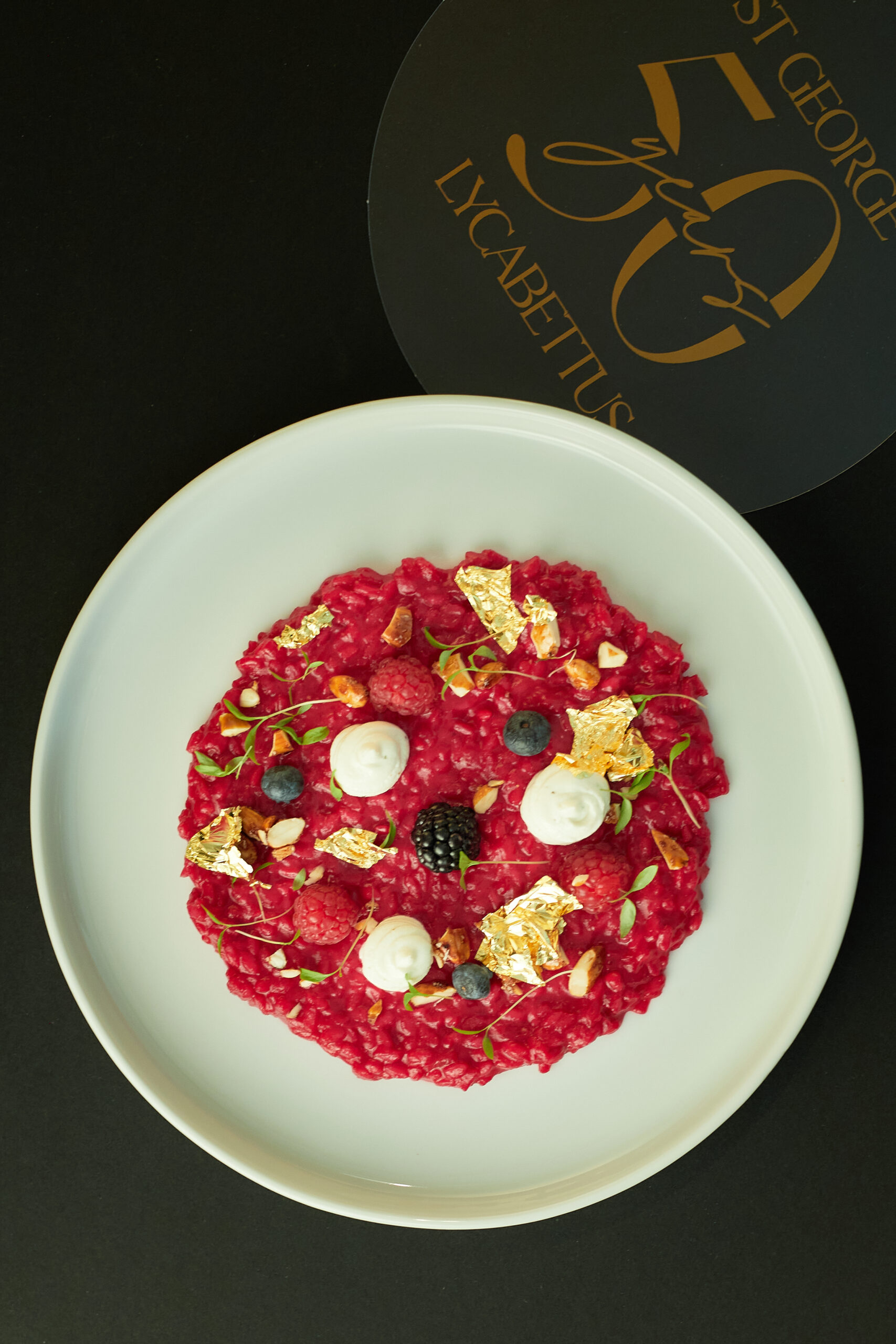 Το ριζότο με κρέμα από ψητά παντζάρια, φρούτα του δάσους, κρέμα κατσικίσιου τυριού και καραμελωμένα αμύγδαλα συμπυκνώνει οπτικά και γευστικά την άνοιξη σε ένα πιάτο. Κάποιοι από την παρέα το βρήκαν φτιαγμένο όπως πρέπει. Εμείς, το θέλαμε περισσότερο al dente και χυλωμένο.