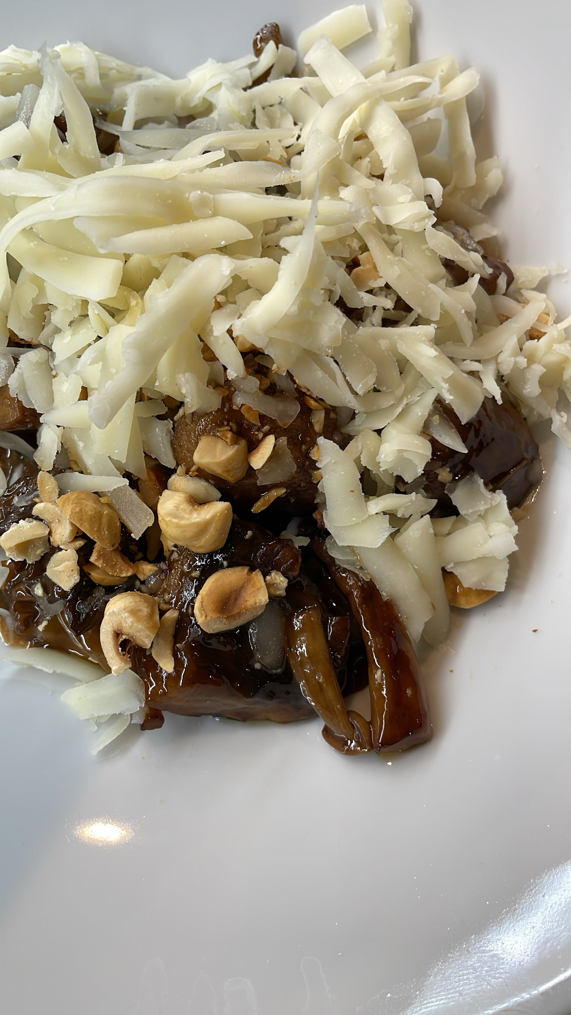 Ρουστίκ ο χαρακτήρας της τριλογίας μανιταριών (πλευρώτους, μανιτάρια Παρισιού, ασιατικά μανιτάρια shimeji). Μια «τηγανιά» που αρτύζεται με μπόλικο τυρί μετσοβόνε που του δίνει και την αναμενόμενη νοστιμιά, πραλίνα φουντουκιού που προσφέρει υφή, σε ένα, κατά τα άλλα, απλό πιάτο και ελληνικό καφέ που όμως δεν κάνει αισθητή την παρουσία του.
