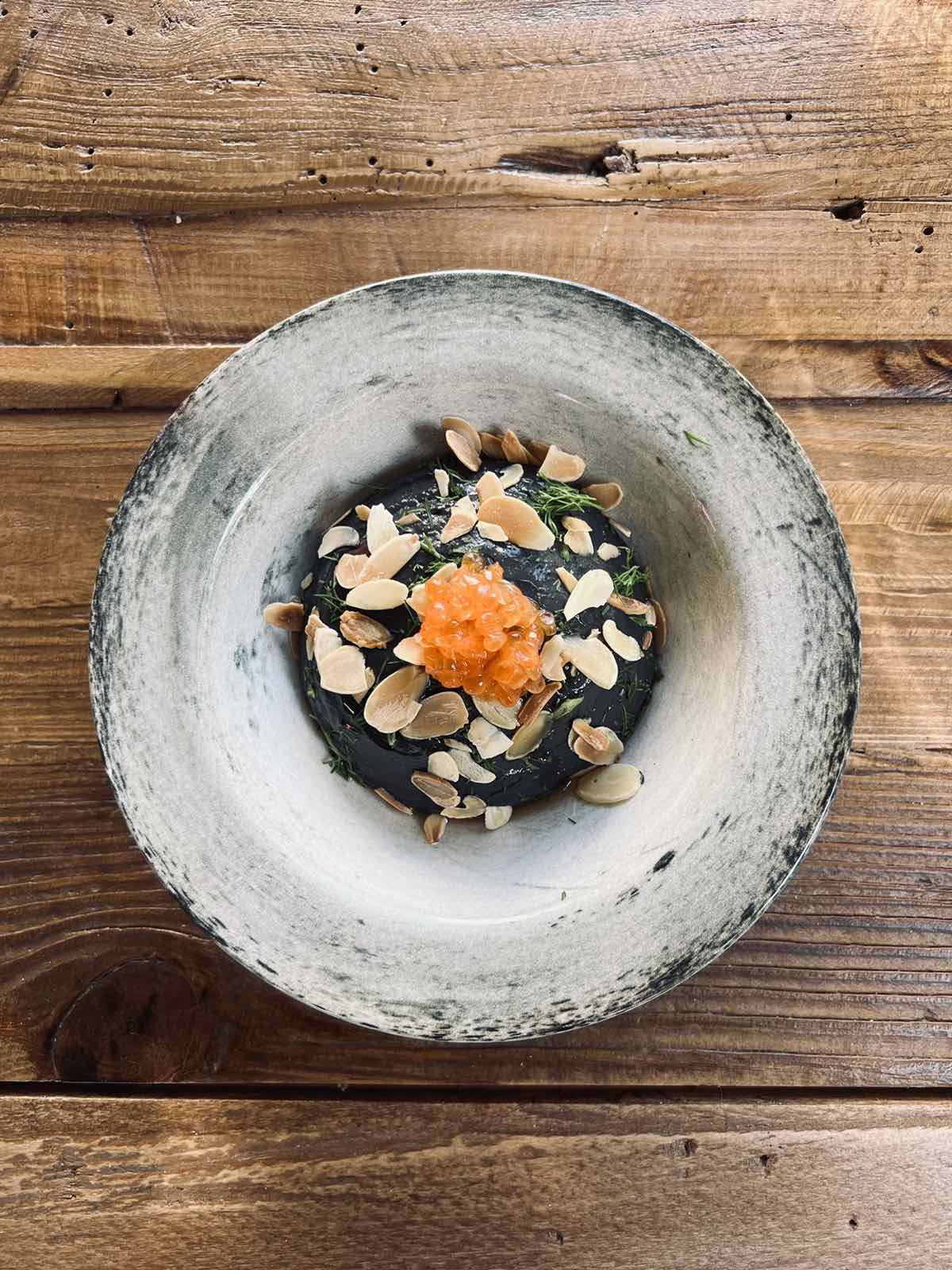 Η δημιουργική διάθεση του σεφ αποτυπώνεται εντυπωσιακά σε μια γευστικότατη και απολύτως ξεχωριστή μαύρη ταραμοσαλάτα με ρεβίθια, αμύγδαλα φιλέ και μπρικ.