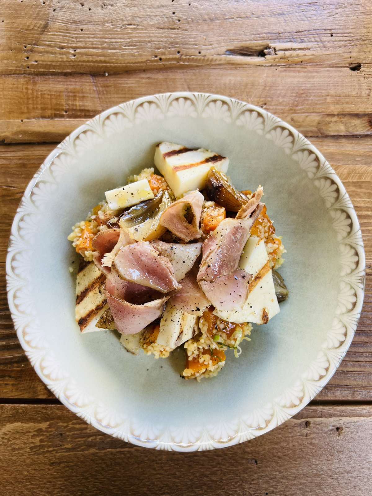 Στην ίδια διάθεση, η ψητή κολοκύθα με πλιγούρι, σύγκλινο και ταλαγάνι. Υφές, τοπικά υλικά της Μάνης και της Μεσσηνίας, σε ένα χορταστικό, ισορροπημένο γευστικά, έξυπνο στην απλότητά του πιάτο. Τέλειο το σύγκλινο που το προμηθεύονται από το παραδοσιακό κρεοπωλείο -αλλαντοποιείο Κουράκος στην Αρεόπολη.