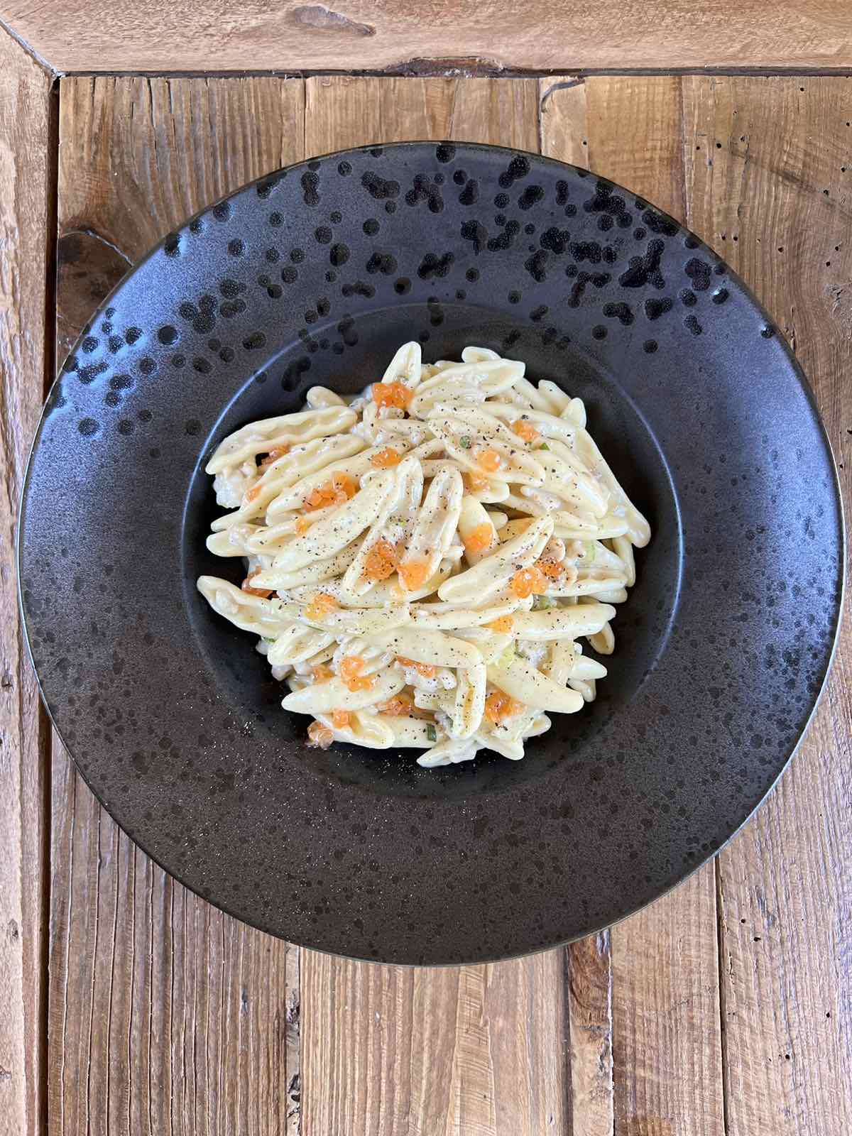 Ο σεφ έχει ιδιαίτερη ικανότητα στη δημιουργία θαυμάσιων πιάτων με ζυμαρικά και θαλασσινά. Δύο από τα καλύτερα πιάτα του είναι οι χειροποίητες μανιάτικες μακαρούνες (φτιάχνονται χωρίς αυγό) με «κιμά» από πετρόψαρα. Στιβαρό το ζυμαρικό υποδέχεται απολαυστικά τον ιωδιούχο κιμά. Το άλλο πιάτο είναι τα λιγκουίνι με φρέσκο αχινό. Ούτε αρτύματα, ούτε αρωματικά βότανα, μόνο ο αχινός που αφήνεται να αποδώσει πλήρως τα αρώματά του πάνω στο καυτό ζυμαρικό. Κάποια άλλη φορά, θα βάλουμε στο τραπέζι και γκόγκιζες (χειροποίητα ζυμαρικά) με κολοχτύπα. Μιας και βρισκόμαστε στη σωστή εποχή, απολαύσαμε και μια γερή μερίδα παχουλές σαρδέλες στη σχάρα.