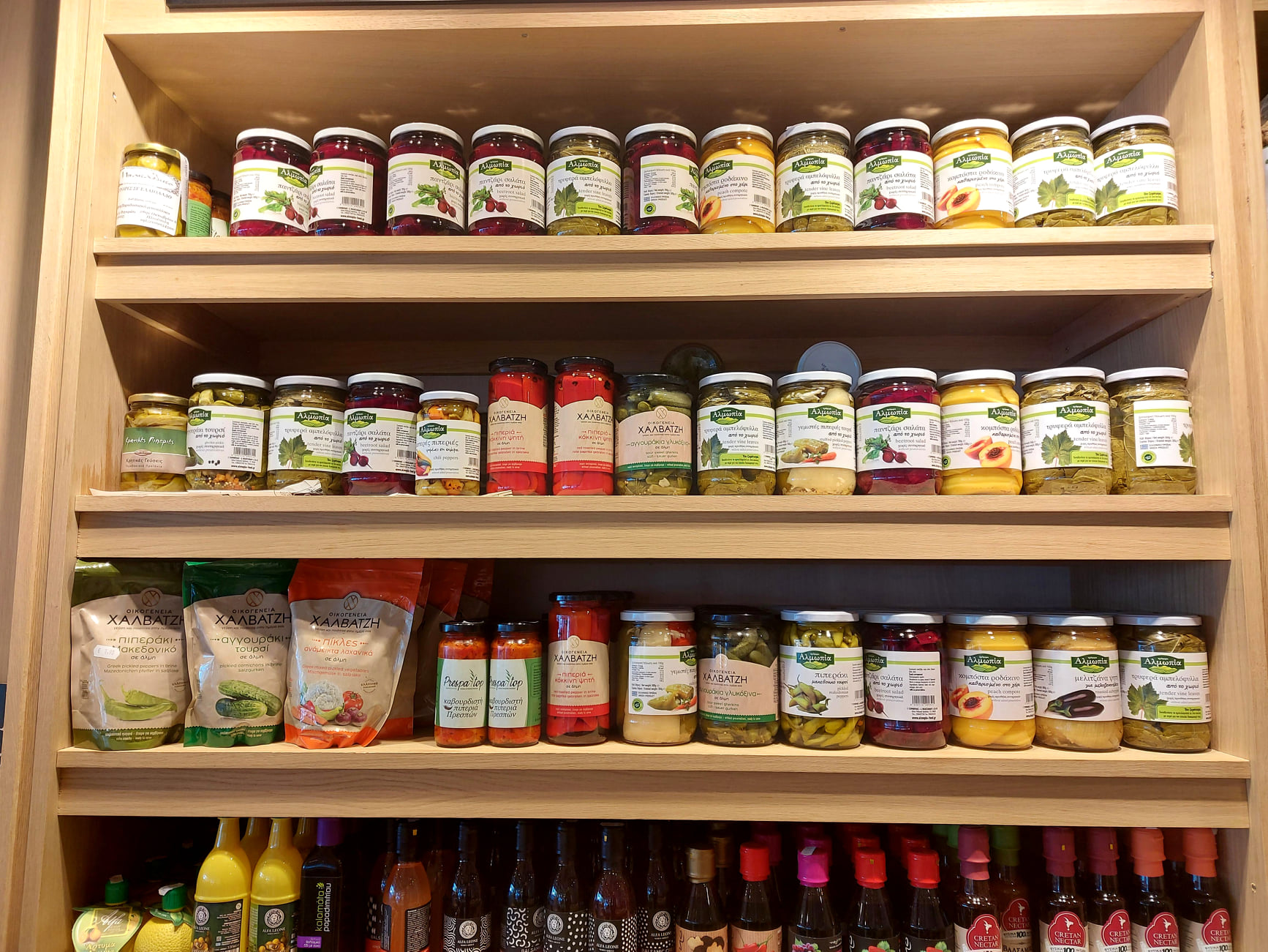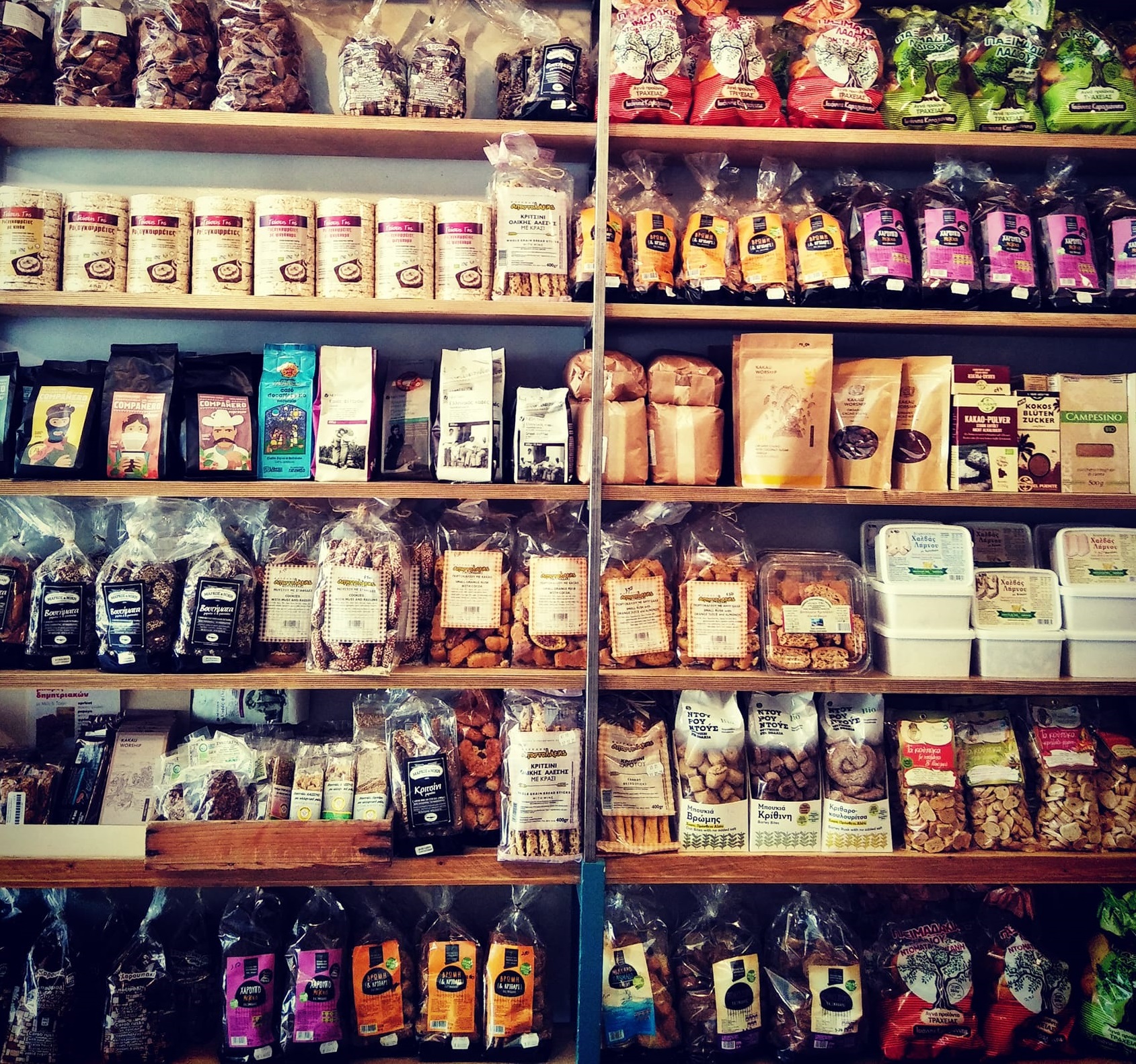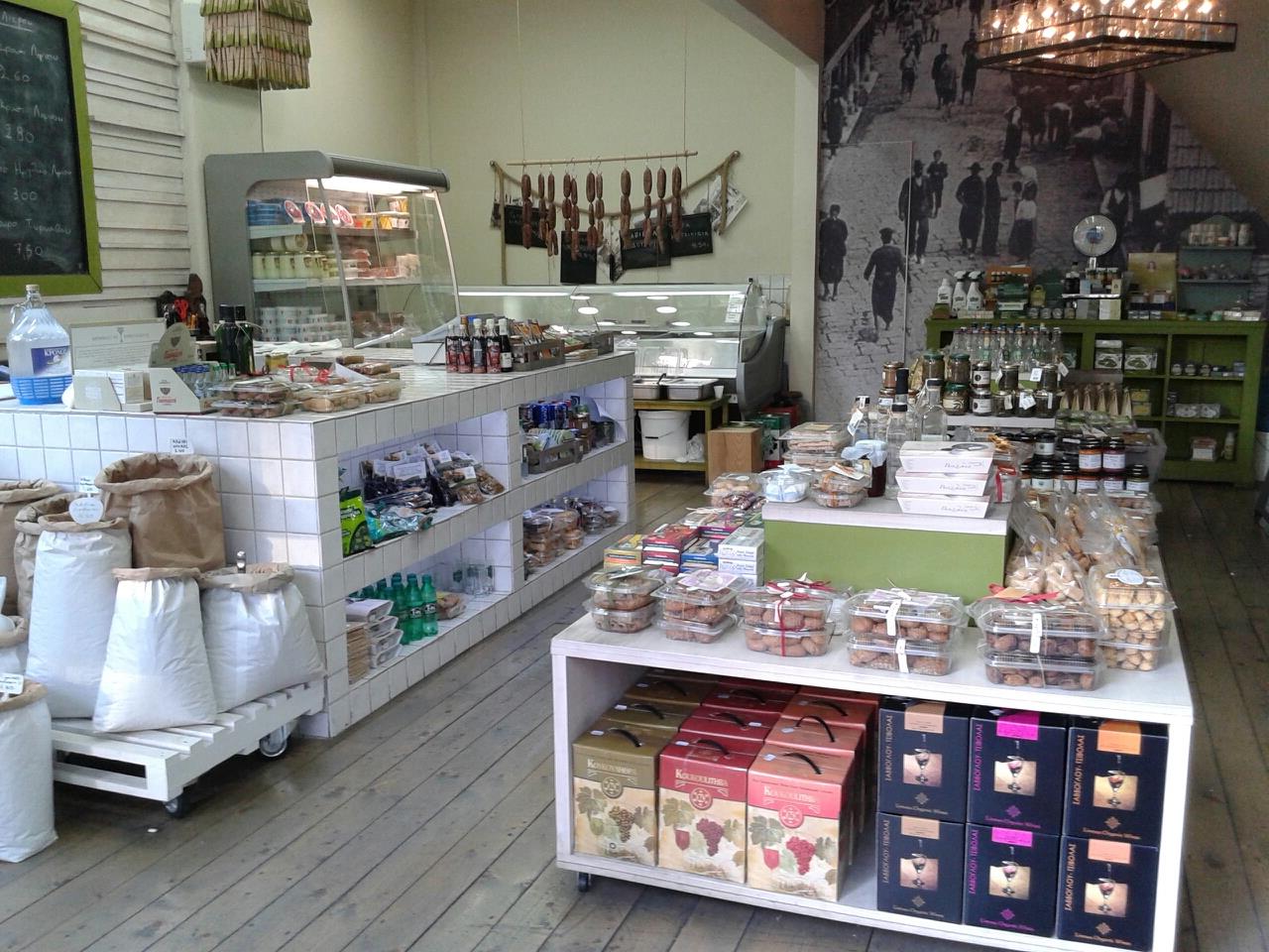 Στα ράφια του που καταλαμβάνουν κάθε σπιθαμή του καταστήματος θα βρείτε τα ποιοτικότερα προϊόντα Ελλήνων παραγωγών, τα οποία επιλέγουν προσεκτικά οι ιδιοκτήτες.