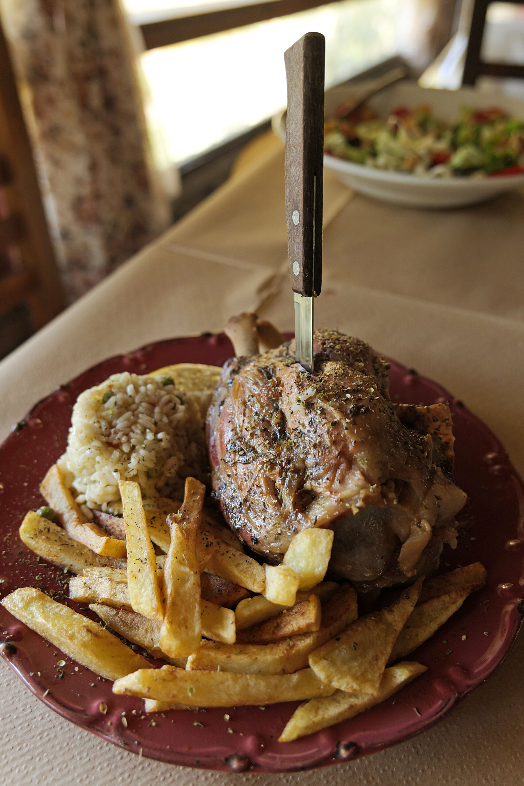 Βαθιά μέσα στο βουνό, σε ένα τοπίο που θυμίζει περισσότερο τα Μαστοροχώρια στην Κόνιτσα και λιγότερο νησί, πάνω από τους Καταρράκτες Ποταμιού, κοντά στο Καρλόβασι, όλα δείχνουν να ταιριάζουν. Η ξύλινη κατασκευή, τα μπαλκόνια μέσα στο πράσινο, ο ήχος του καταρράκτη σε συνδυασμό με τη χαμηλότερη θερμοκρασία και την απίστευτη μυρωδιά του ξυλόφουρνου, προϊδεάζουν και για την κατάλληλη γαστρονομική κατεύθυνση. Έμφαση δίδεται στο κρέας με απόλυτα σουξέ το γεμιστό κατσίκι, το χοιρινό κότσι και το κοντοσούβλι αλλά και με επιλογές σε κοτόπουλο, μπιφτέκια, πανσέτα, σεφταλιές αλλά και 1-2 μαγειρευτά τα οποία υπάρχουν πάντα μαζί με διάφορους μεζέδες, όπως το καταπληκτικό μπουγιουρντί.