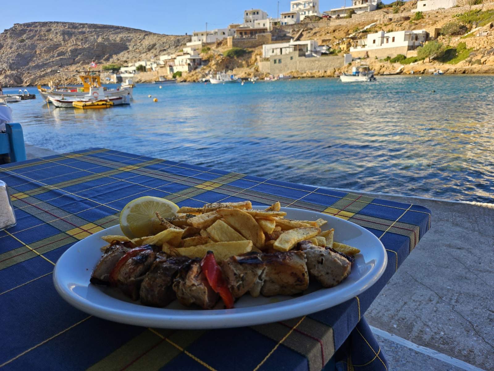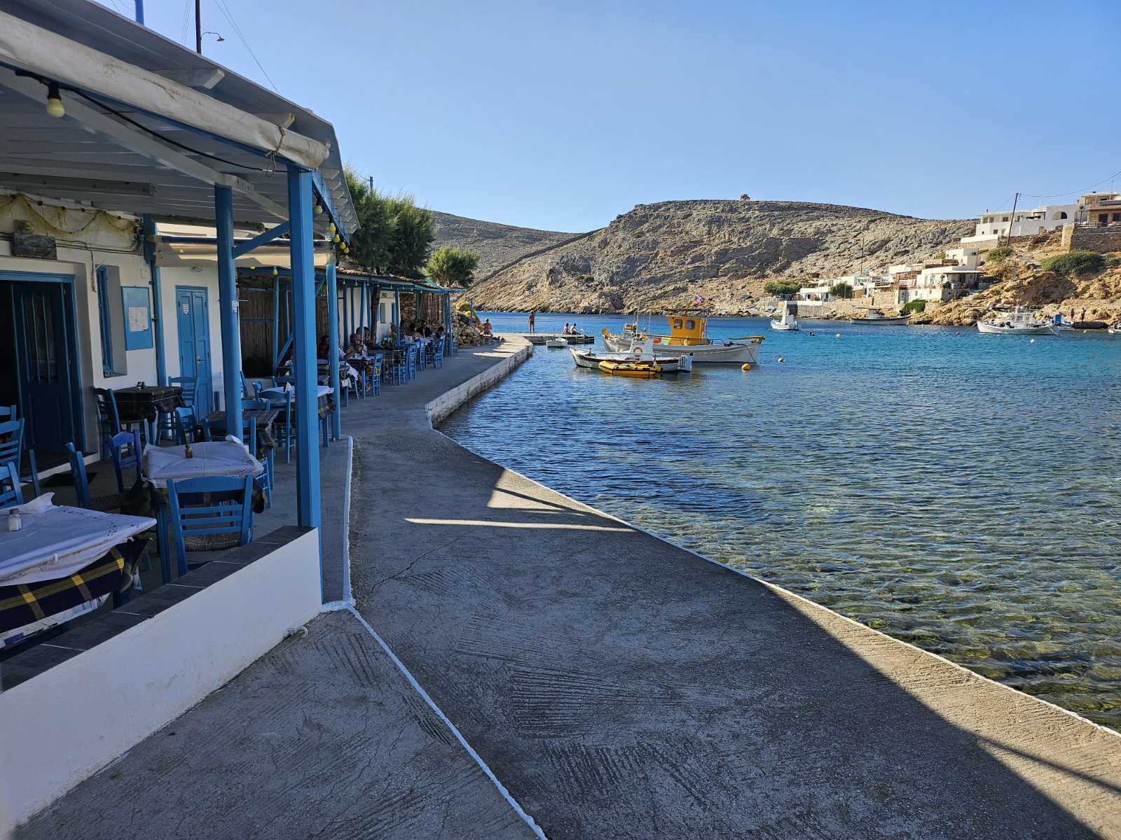 Επίσης, εδώ θα βρείτε την παραδοσιακή ρεβυθάδα. Τα τραπεζάκια, απλώνονται στον εξωτερικό χώρο προσφέροντας πανοραμική θέα στα λευκά σπίτια, που διάσπαρτα στολίζουν τον λόφο δίπλα στα γαλαζοπράσινα νερά του κόλπου.