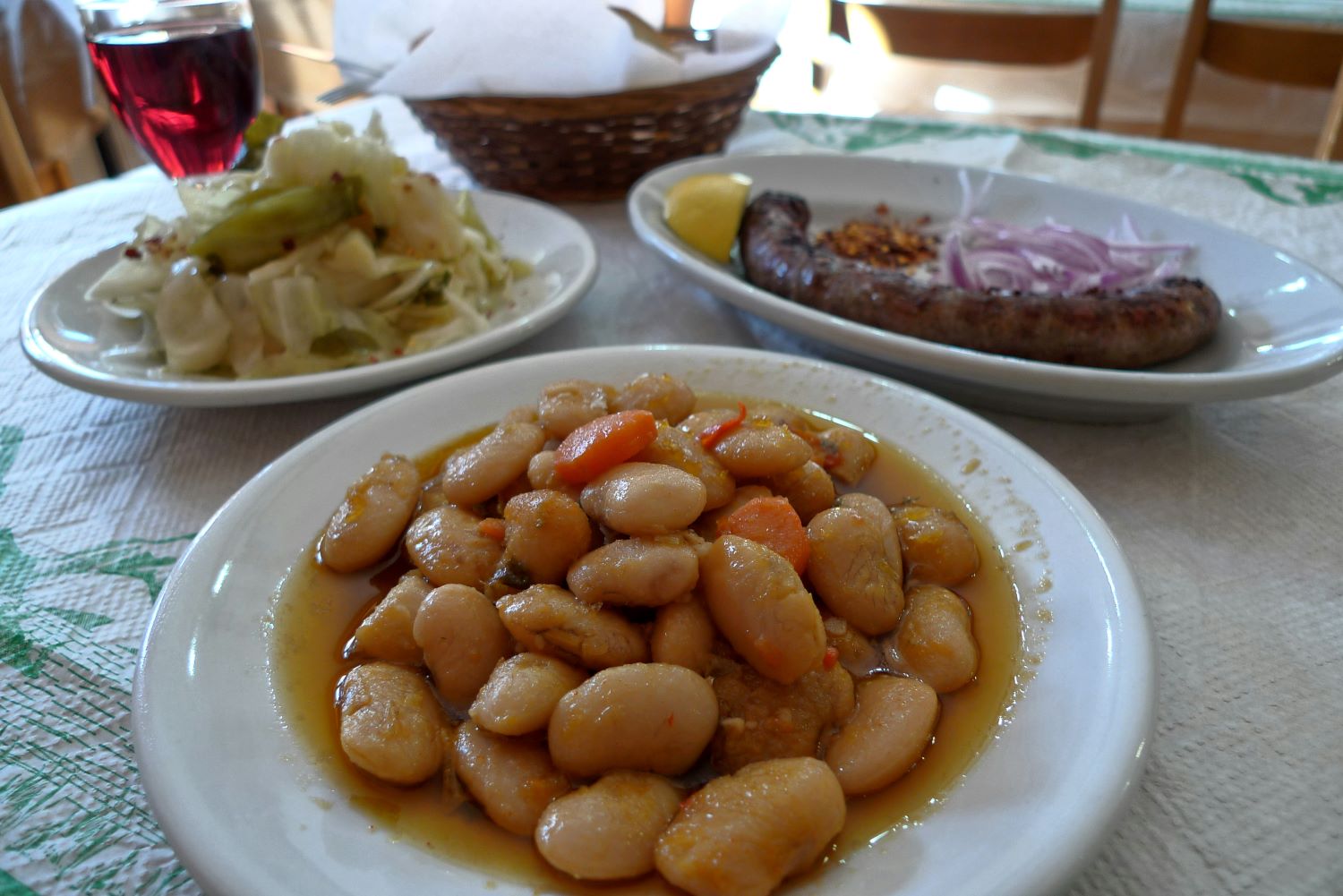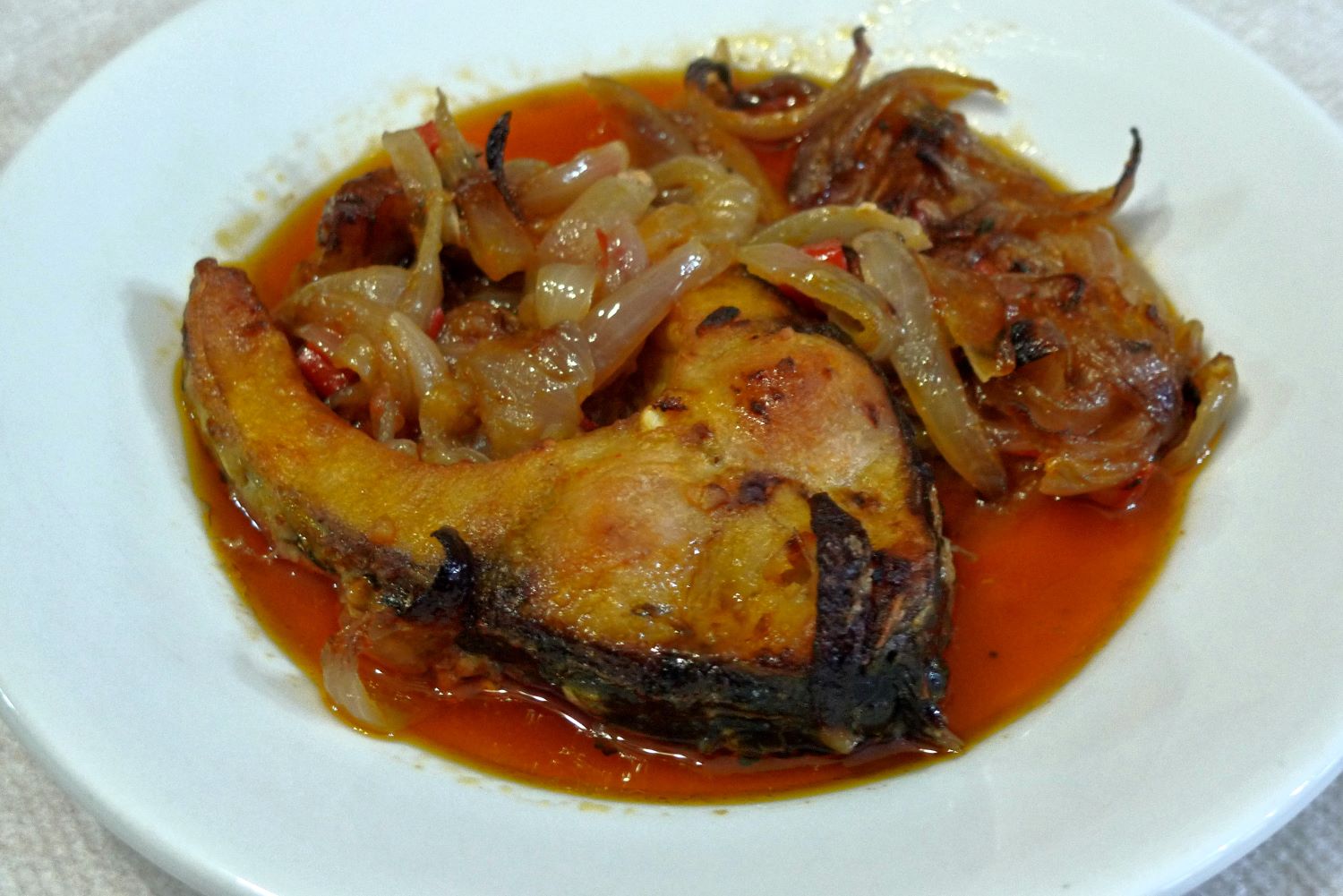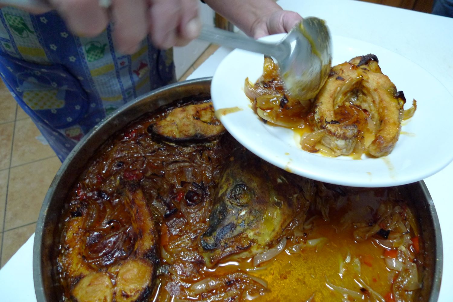 Τις αλευρώνει, τις προσθέτει στο ταψί με τα κρεμμύδια, και τις γυρίζει. Συμπληρώνει νερό και βάζει το ταψί στο φούρνο για μιάμιση με δύο ώρες μέχρι να ψηθεί καλά. Η γεύση του είναι δυνατή και πικάντικη, καθώς στο τραπέζι συναντά και άλλες «φλογισμένες» γεύσεις – όπως των φημισμένων φασολιών γιγάντων των Πρεσπών, των λαχανικών τουρσί και των ιθαγενών λουκάνικων – που ενισχύουν τη θερμοκρασία του φαγητού, απαραίτητη εδώ στα βορινά, που όλα μετουσιώνονται σε ζεστασιά.