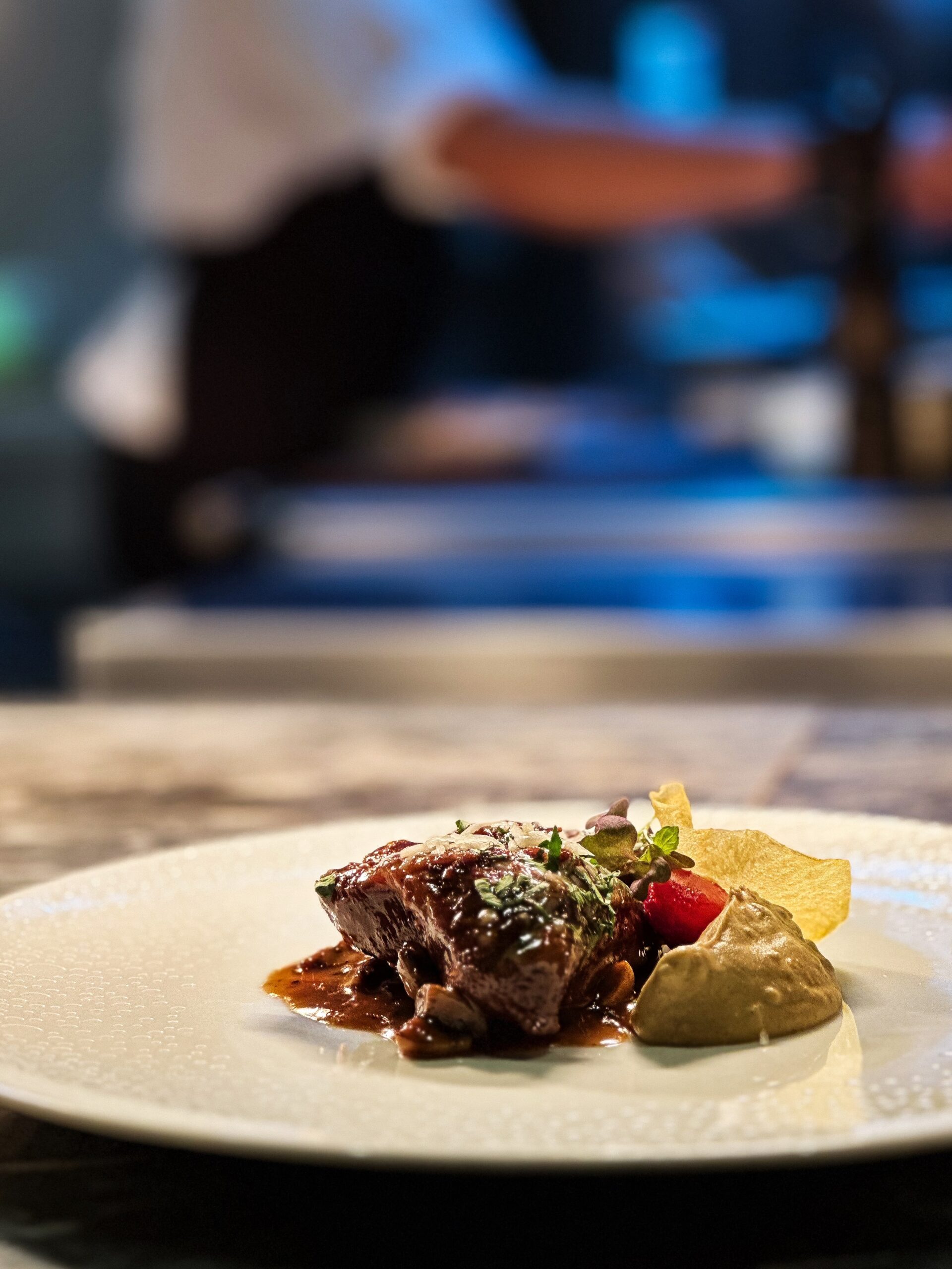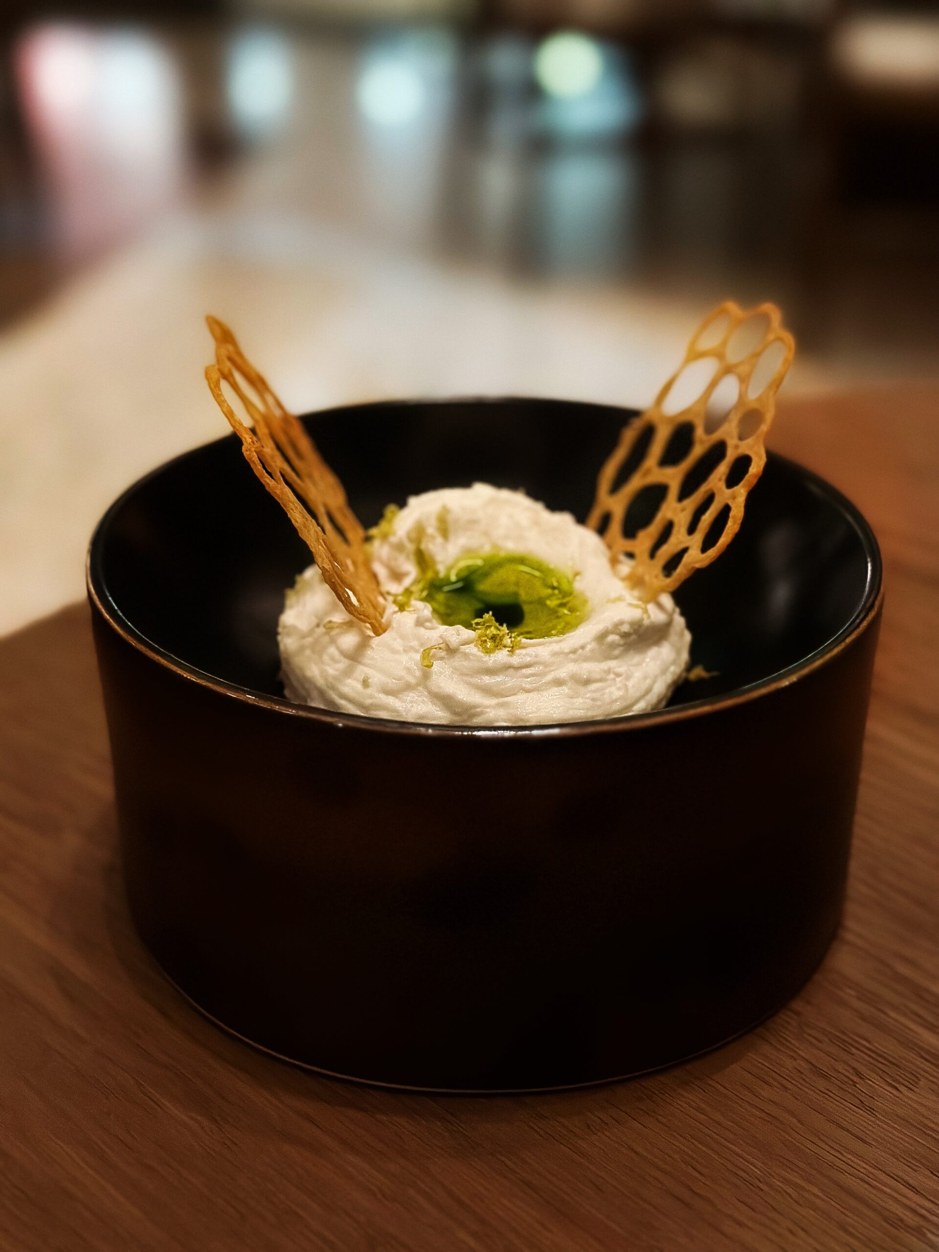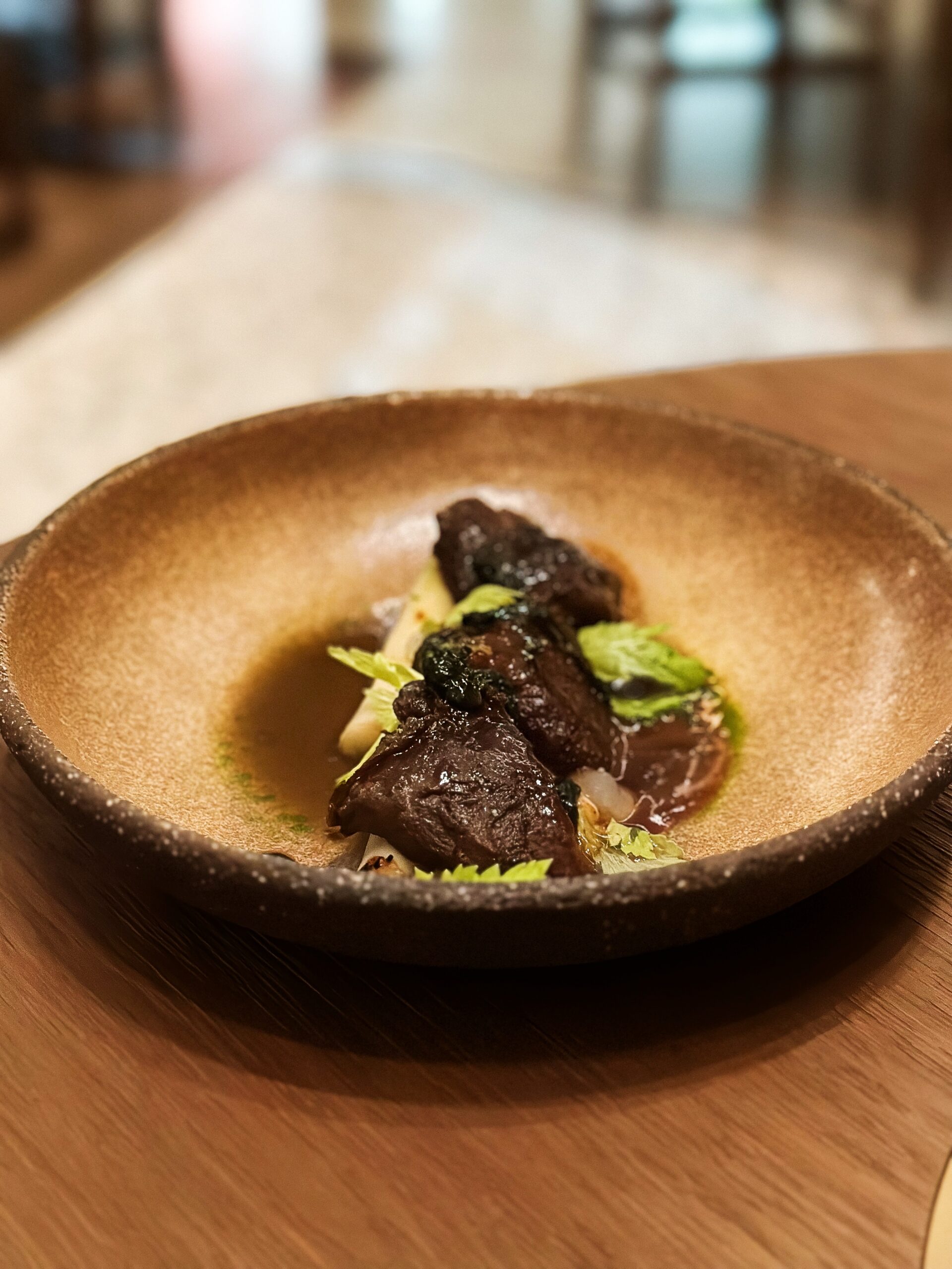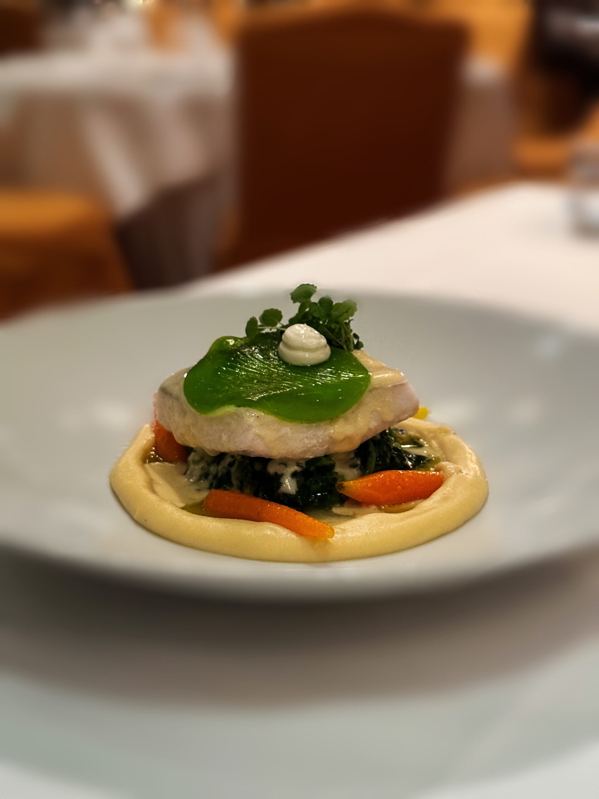 Διατηρεί τα γνωστά του αρώματα ενώ εμφανίζεται με πιο φινετσάτη γεύση και δημιουργική, ταρτάρ, όψη από μοσχαρίσιο black angus. Η οσπριάδα, αγαπημένο μοναστηριακό φαγητό, αποτελεί μείγμα οκτώ διαφορετικών οσπρίων και παρουσιάζεται ανανεωμένη με τραγανά στοιχεία από την προσθήκη φουντουκιού αλλά και εξαίσιες γλυκιές μυρωδιές από βερίκοκο και αρωματικό λαδολέμονο. Με δημιουργική ματιά αποδίδεται και ο αγιορείτικος μπακαλιάρος με καρότα, τραγανές αγκινάρες, πουρέ από καραμελωμένα κρεμμύδια και τζελ χλωροφύλλης που προσθέτει στο πιάτο βοτανικότητα. Άκρως ιδιαίτερα και νόστιμα τα τρυφερά μάγουλα μαύρου χοίρου με καμένα πράσα, ζωμό από σέσκουλα, πουρέ σελινόριζας και τραγανά φύλλα από σέλερι. Ένα καθαρό σε γεύση πιάτο με ισορροπημένες εντάσεις και φρεσκάδα. Η beata, με εξαιρετικές υφές και φινετσάτη πολυπλοκότητα, έκλεισε υπέροχα το γεύμα μας. Bitter σοκολάτα, κόκκινο κρασί, σύκο και σάλτσα από ταχίνι, χωρίς προσθήκη ζάχαρης, λακτόζης, ή γλουτένης, συνθέτουν ένα επιδόρπιο υψηλών προδιαγραφών που, δυστυχώς, σπάνια συναντάμε σε εστιατόρια. Η λίστα κρασιών, από τον ελληνικό κυρίως αμπελώνα, συνοδεύουν όμορφα ένα καθόλα εξαίσιο γεύμα.