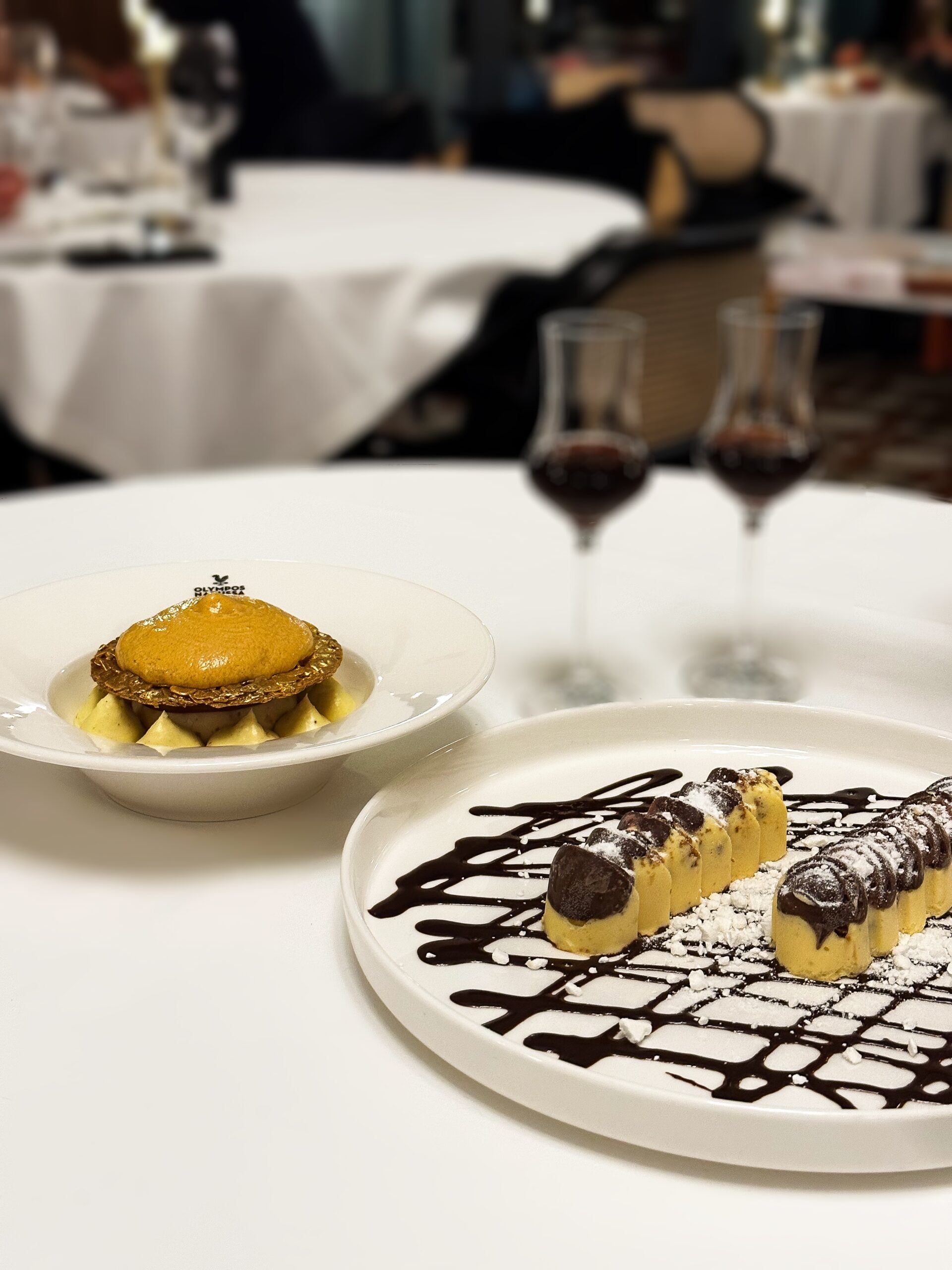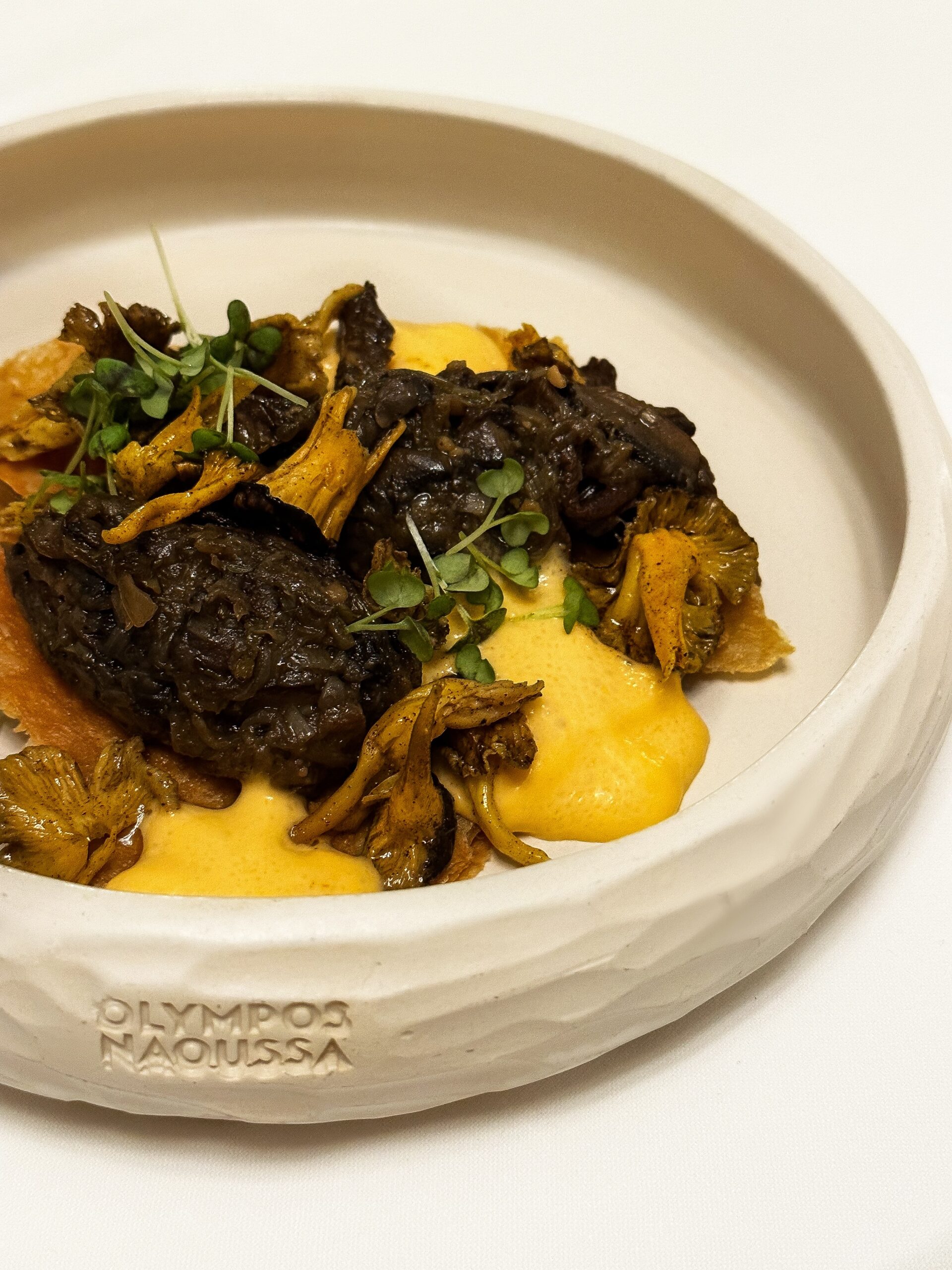 Η δικιά μας ξενάγηση στις γεύσεις του Όλυμπος Νάουσα ξεκίνησε με την αγιορείτικη μελιτζανοσαλάτα. Διατηρεί τα μοναστηριακά καπνιστά της στοιχεία από το ψήσιμο της μελιτζάνας στα κάρβουνα αλλά και το υγρό ζελέ ψητής πιπεριάς ενώ δροσιά χαρίζει η προσθήκη γιαουρτιού με δυόσμο και καρύδι. Αποδομημένη παρουσιάστηκε η μανιταρόπιτα Γρεβενών με τάρτα χωριάτικου φύλλου, κρέμα καπνιστού τυριού Γρεβενών και μανιτάρια από την Πίνδο. Στα ντολμαδάκια, το παραδοσιακό αυγολέμονο αντικαταστάθηκε από αφρό αυγολέμονου ενώ στο χουνκιάρ μπεγιεντί, το κρέας μόσχου ήταν από μοσχαρίσιο μάγουλο και η κρέμα ψητής μελιτζάνας, που συνόδευε το πιάτο, από μελιτζάνα βγαλμένη από σιφόν, κάτι που την έκανε να είναι πιο αέρινη. Στο πληθωρικό γιουβέτσι θαλασσινών, με φρέσκες γαρίδες και ζωμό καραβίδας, γλυκιές νότες έδινε το κρασί Σάμου ενώ οι φλούδες από παρμεζάνα Μετσόβου πρόσθεταν ένταση στο πιάτο. Στα επιδόρπια ξεχώρισαν το αρμενοβίλ με θεσσαλονικιώτικο σεμιφρέντο, τραγανή μαρέγκα, κροκάν αμυγδάλου και γκανάζ σοκολάτας καθώς και η αποδομημένη νουγκατίνα με καραμελωμένα αμύγδαλα, κρέμα βανίλιας Μαδαγασκάρης και αλμυρή καραμέλα. Στη λίστα κρασιών βρήκαμε καλές επιλογές από τον ελληνικό και το διεθνή αμπελώνα. Το γεύμα σε ένα χώρο υψηλής αισθητικής, όπως είναι αυτός του Όλυμπος Νάουσα, προσφέρει μια όμορφη εμπειρία.