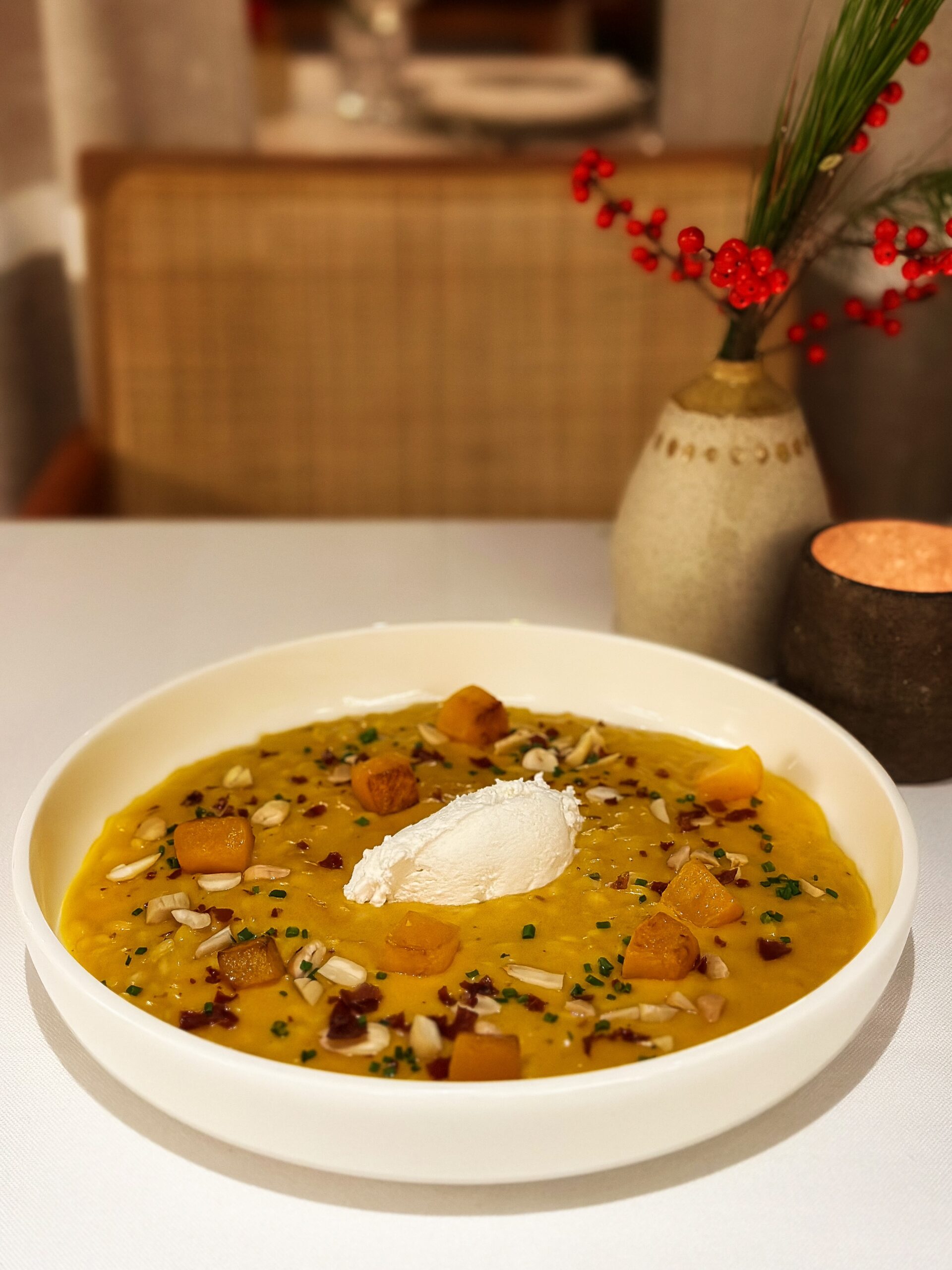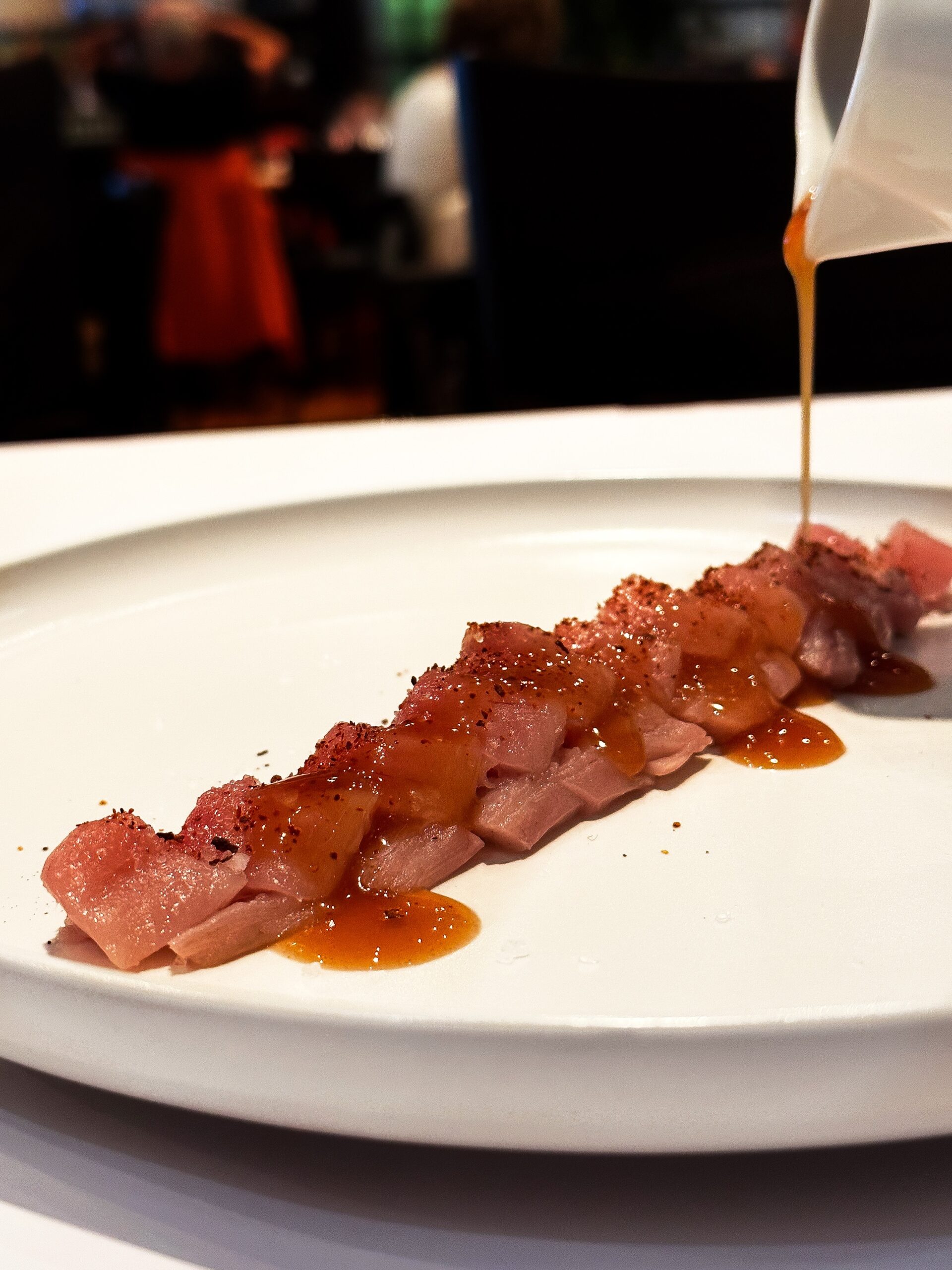 Τα αρώματα και η ποιότητα των υλικών γίνονται εύκολα αντιληπτά στα πιάτα και δηλώνουν με σαφήνεια τον πρωταγωνιστικό ρόλο της πρώτης ύλης στην κουζίνα του Duck. Στα εξαίσια εδέσματα που γευθήκαμε συμπεριλαμβάνονται και το μεστό ριζότο κολοκύθας με ανεβατό Γρεβενών, προσούτο και αμύγδαλα, η αλμυρή τάρτα με σπανάκι και κατσικίσιο τυρί, η δροσερή σαλάτα με πολύχρωμα παντζάρια, φουντούκια, σαλάμι Λευκάδος, γιαούρτι και βαλεριάνα καθώς και η πλούσια πάπια με σπανάκι, πουρέ καρότο και σάλτσα σύκο. Εξαιρετικό, επίσης, το σουφλέ σοκολάτας με παγωτό βανίλια ενώ τα κρασιά, από τον ελληνικό και το διεθνή αμπελώνα, συνοδεύουν άψογα τα πιάτα του γευστικού γαστρονομικού ταξιδιού που προσφέρει το Duck.