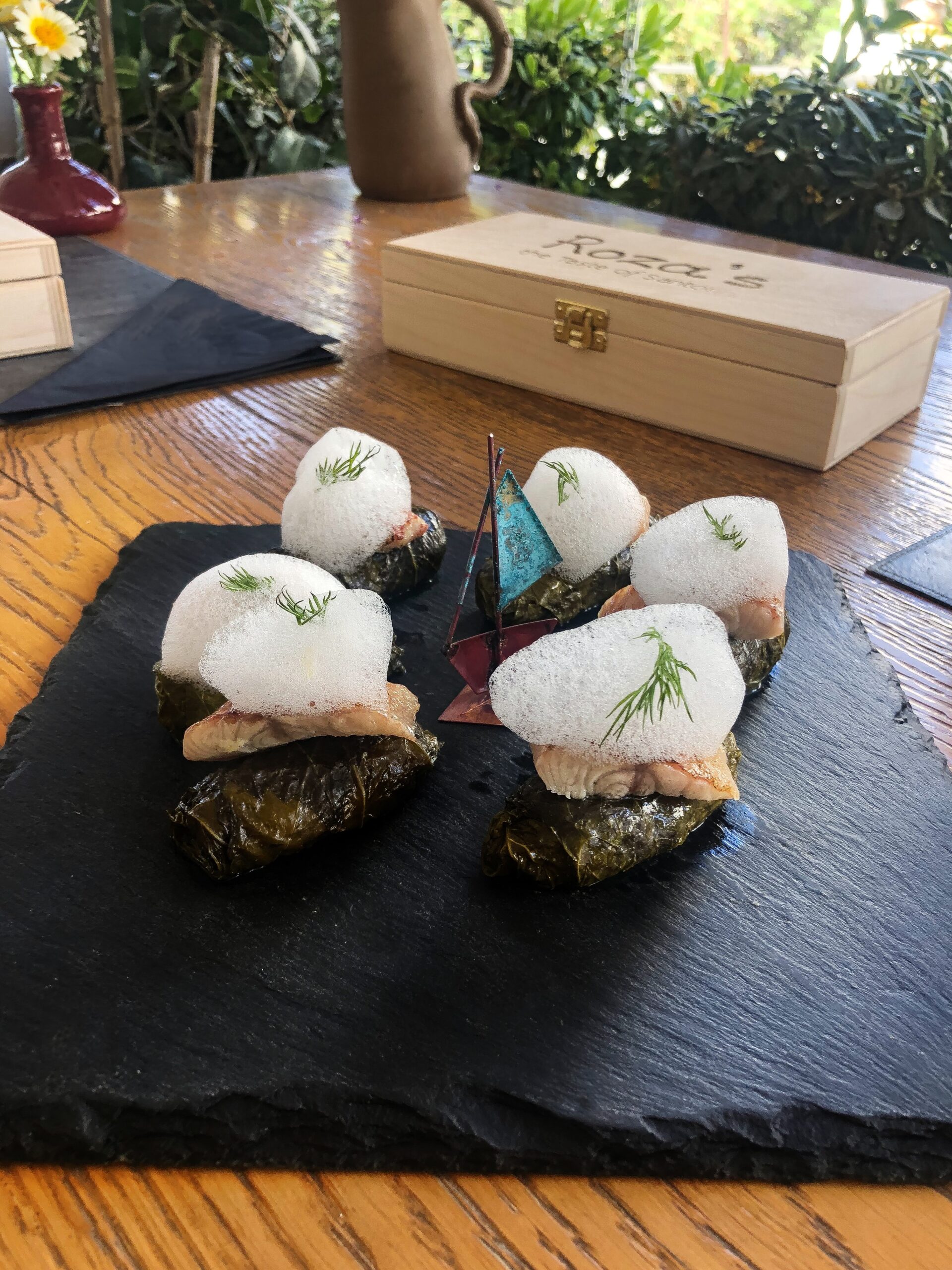 Fusion κουζίνα υψηλού επιπέδου που συνταιριάζει αρμονικά στοιχεία από τη γαλλική και την ιαπωνική γαστρονομία σε συνδυασμό με ελληνικά προϊόντα και γεύσεις. Μενού a la carte με επιλογές σε ψάρια, θαλασσινά και κρέας καθώς και vegan και gluten free πιάτα. Σχεδόν τα πάντα φτιάχνονται στο εστιατόριο, όπως το προζυμένιο ψωμί που δημιουργείται από προζύμι ηλικίας 11 ετών. Σωστά δομημένη Wine list. Ρομαντικό σκηνικό, καταπληκτική θέα στην Kαλντέρα και την ολόλευκη Οία.