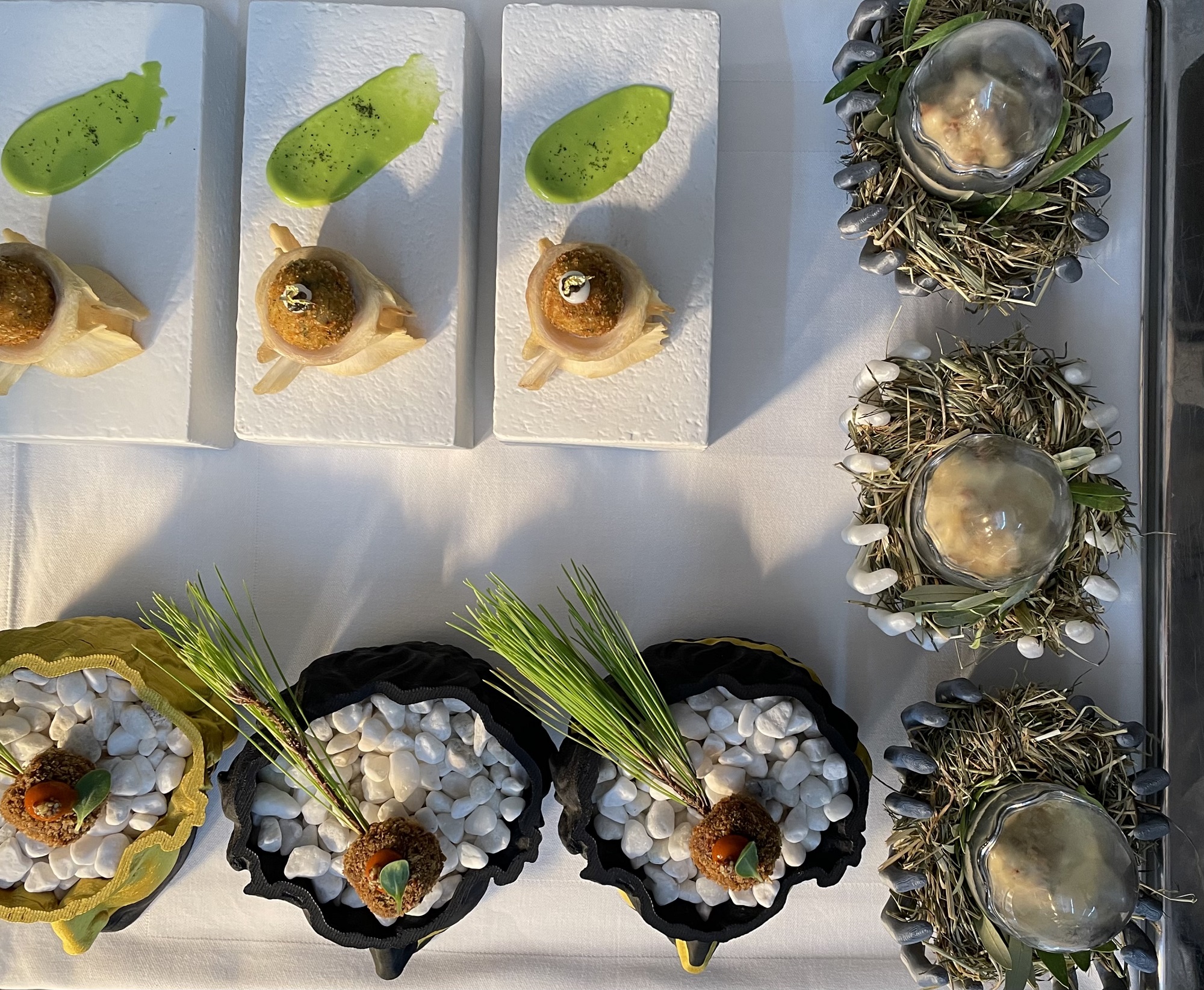 Ο σεφ Παναγιώτης Πεταλάς και η ομάδα του ετοιμάζουν μια ολόκληρη σειρά από ευφάνταστα πιάτα με φρέσκα υλικά, όπου τα ψαρικά συνδυάζονται με όσπρια και λαχανικά, παράγοντας ένα αποτέλεσμα πολύ ενδιαφέρον γευστικά: Φασολάδα με αστακό, σπανάκι και αφρό αντζούγιας, λαχανοντολμάδες, λόπια (φασόλια) Κατταβιάς ΠΟΠ με καλαμάρι, γαρίδα και σκόρδο, κλπ. Ακόμα, ροφό με λιγκουίνι, γίδα με σκληπενό ριζότο (φτιάχνεται με καπνιστό κριθαράκι και είναι καταπληκτικό), κόκορα με κρέμα από πιπεριές Φλωρίνης γιαούρτι και αμπελοβλάσταρα, ρεβίθια με σκορπίνα, φρέσκα ψάρια στη σχάρα και στο τηγάνι. Για γλυκό, τέλος, θα επιλέξετε γαλατόπιτα με γλυκό του κουταλιού.