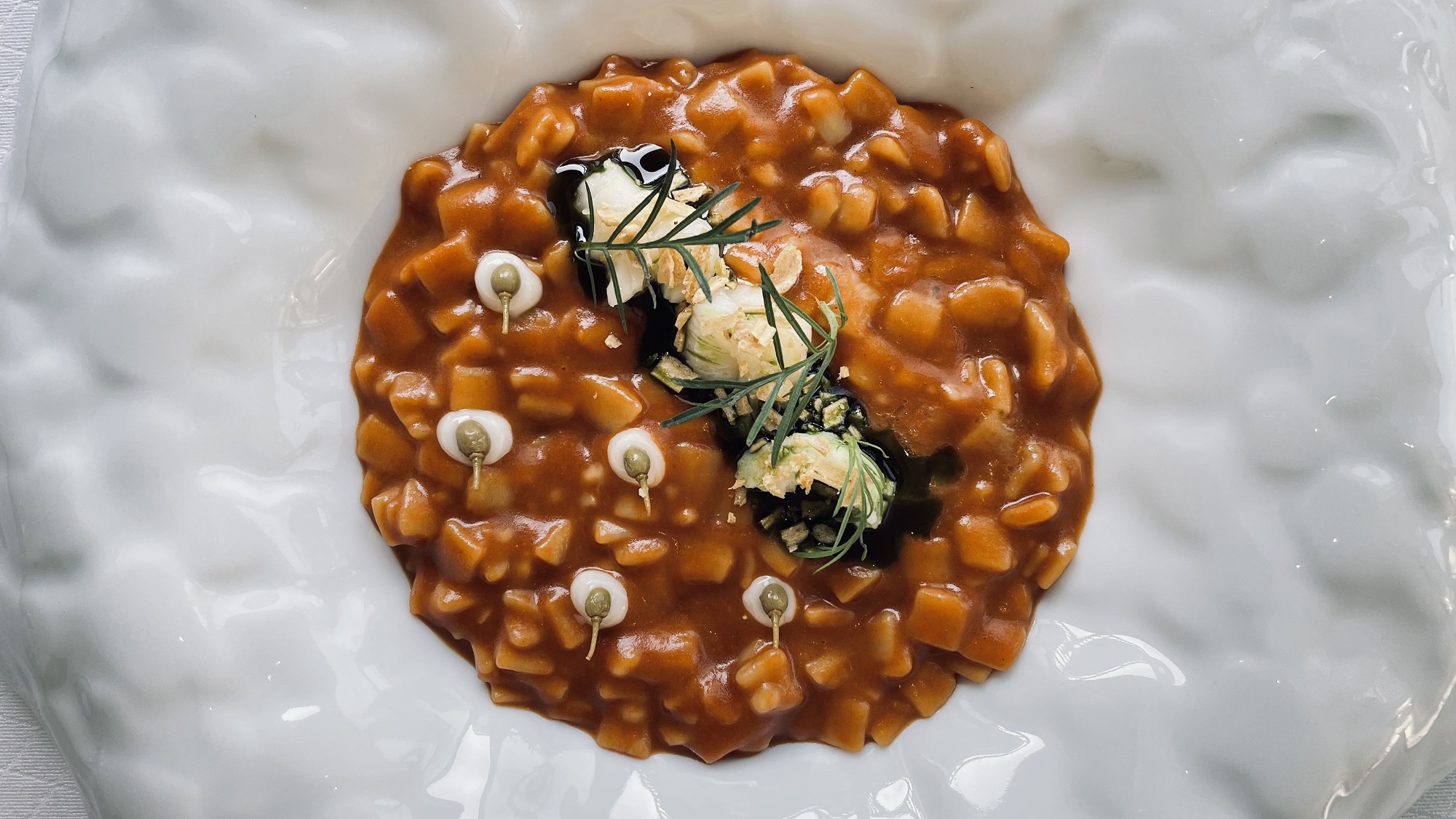 Πιάτα που ξεχωρίζουν, το φαγκρί μαρινάτο ημίπαστο με πίκλα μπάμιας συν σορμπέ από κρίταμο και νερό από χωριάτικη σαλάτα, χουρμά και φιστίκι Αιγίνης: φαγητό τολμηρό, νόστιμο και απροσδόκητα ισορροπημένο. Η κακαβιά (κρεμμυδοντολμάς με ψάρι, καβούρι, κρέμα πατάτας με σκόρδο και σούπα από ζωμό ψαριού) είναι κι αυτή ένα μοναδικής γεύσης και λεπτότητας πιάτο, το οποίο εμπεριέχει όλη τη φρεσκάδα της θάλασσας.