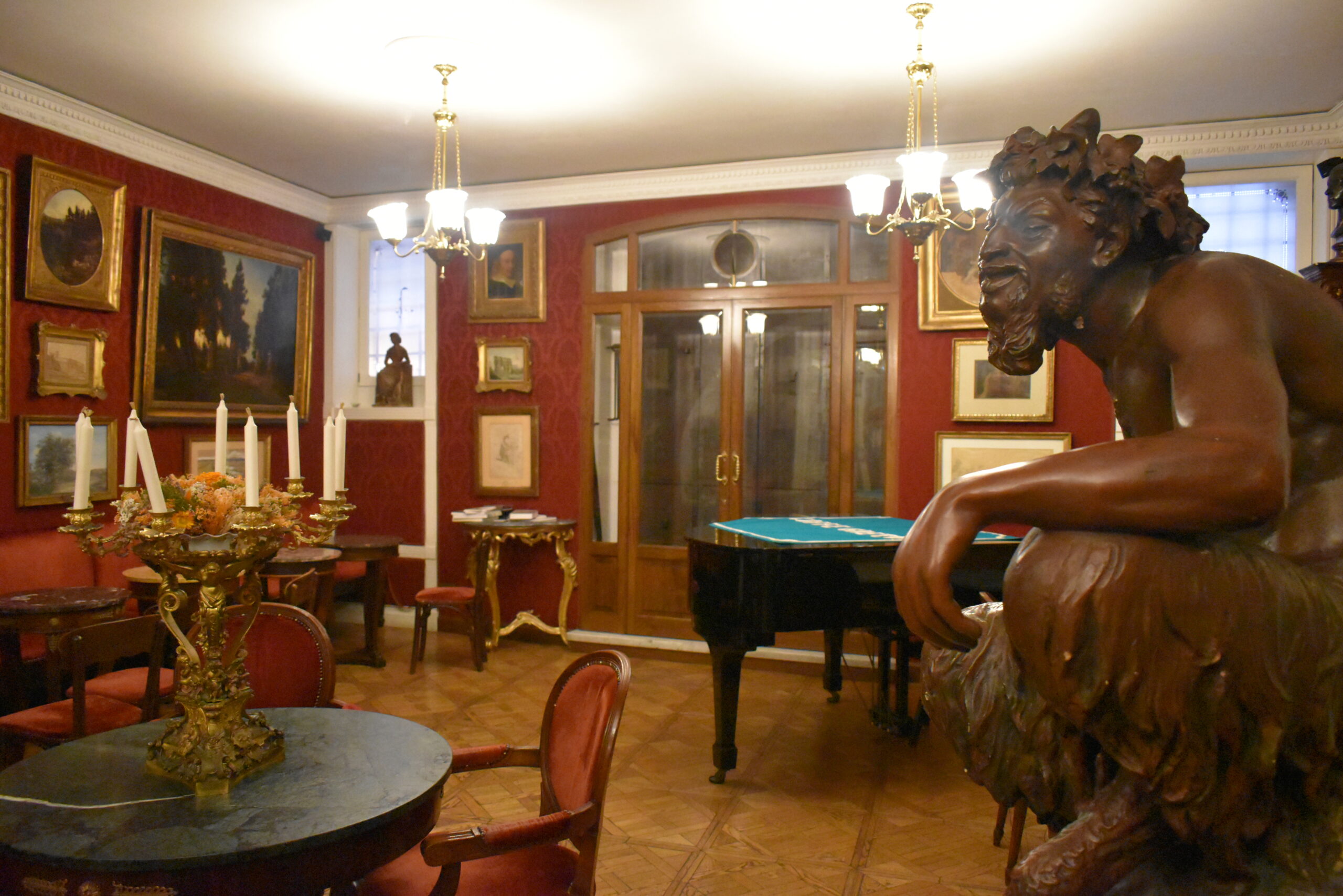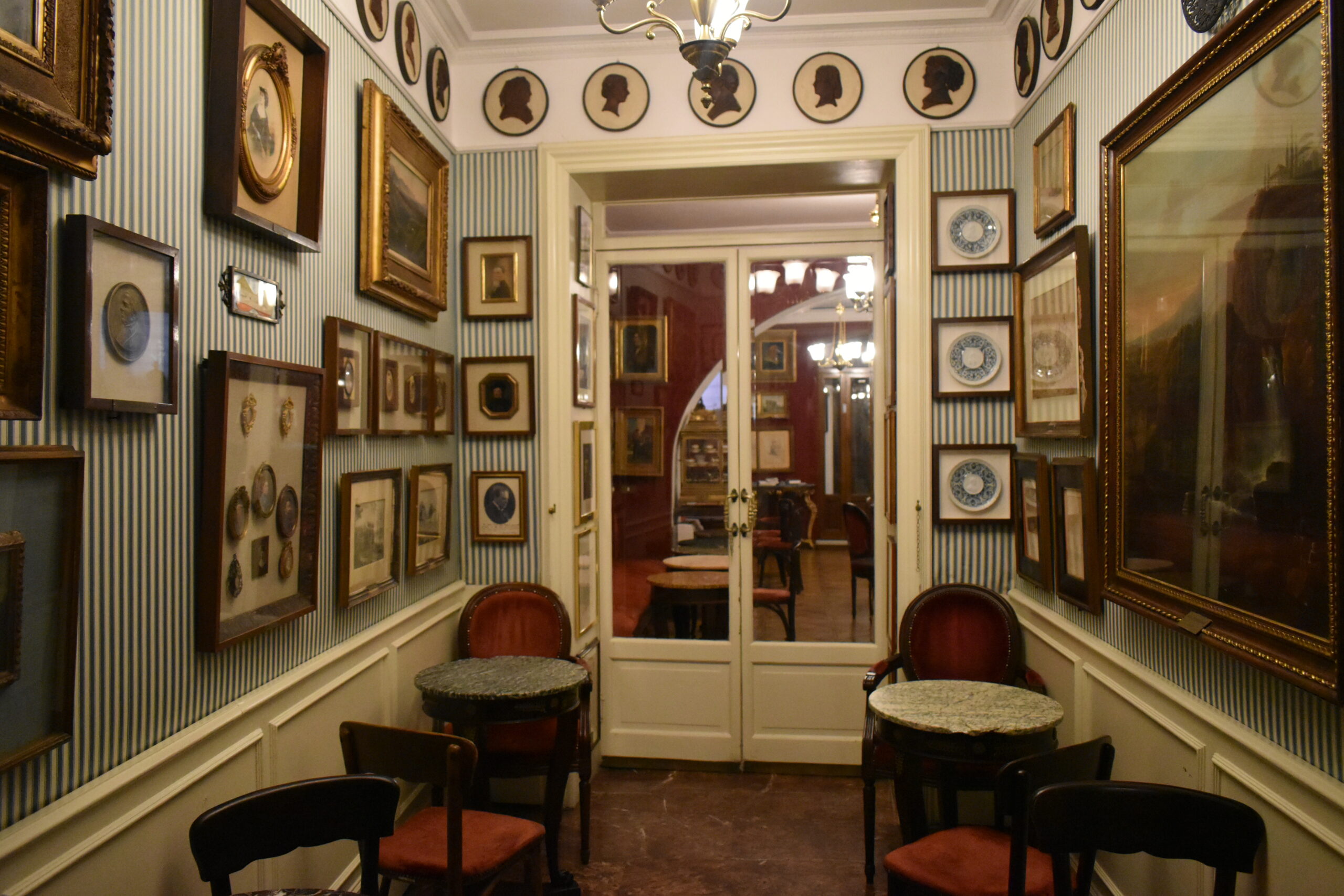 Κι αν και περιβάλλεται από τις πιο σύγχρονες τάσεις της διεθνούς μόδας, ο επισκέπτης που περνά το κατώφλι του νιώθει ότι μπαίνει σε κάποιο μουσείο που τον μεταφέρει στην πιο κομψή περίοδο μιας αλλοτινής εποχής. Ταπισερί σε κόκκινους και πράσινους τόνους καλύπτουν του τοίχους, αψίδες οδηγούν από το ένα σαλονάκι στο άλλο, τους καναπέδες και τις πολυθρόνες ντύνει βελούδο σε κόκκινους τόνους και ο καφές σερβίρεται σε μικρά μαρμάρινα τραπέζια. Απλίκες απλώνουν ένα ζεστό φως γύρω από καθρέφτες και δεκάδες αυθεντικούς πίνακες με χρυσές κορνίζες και μπρούτζινα γλυπτά πλαισιώνουν τις γωνίες. Η πιο εκθαμβωτική αίθουσα βρίσκεται στο βάθος, όπου δεσπόζει το παλιό πιάνο με ουρά, οι ροτόντες με τα χρυσά ροκοκό κηροπήγια και η παλιά βιβλιοθήκη. Δεν είναι πάντα ανοιχτή, αλλά αν το ζητήστε ευγενικά ίσως σας επιτραπεί η είσοδος για λίγο.