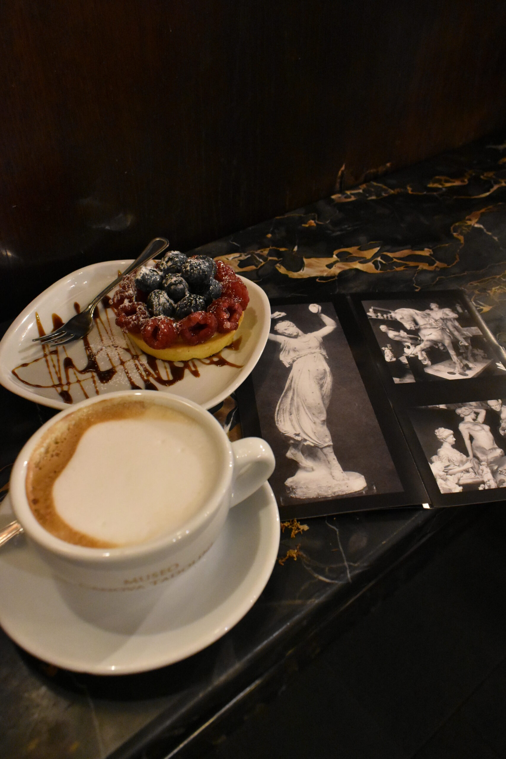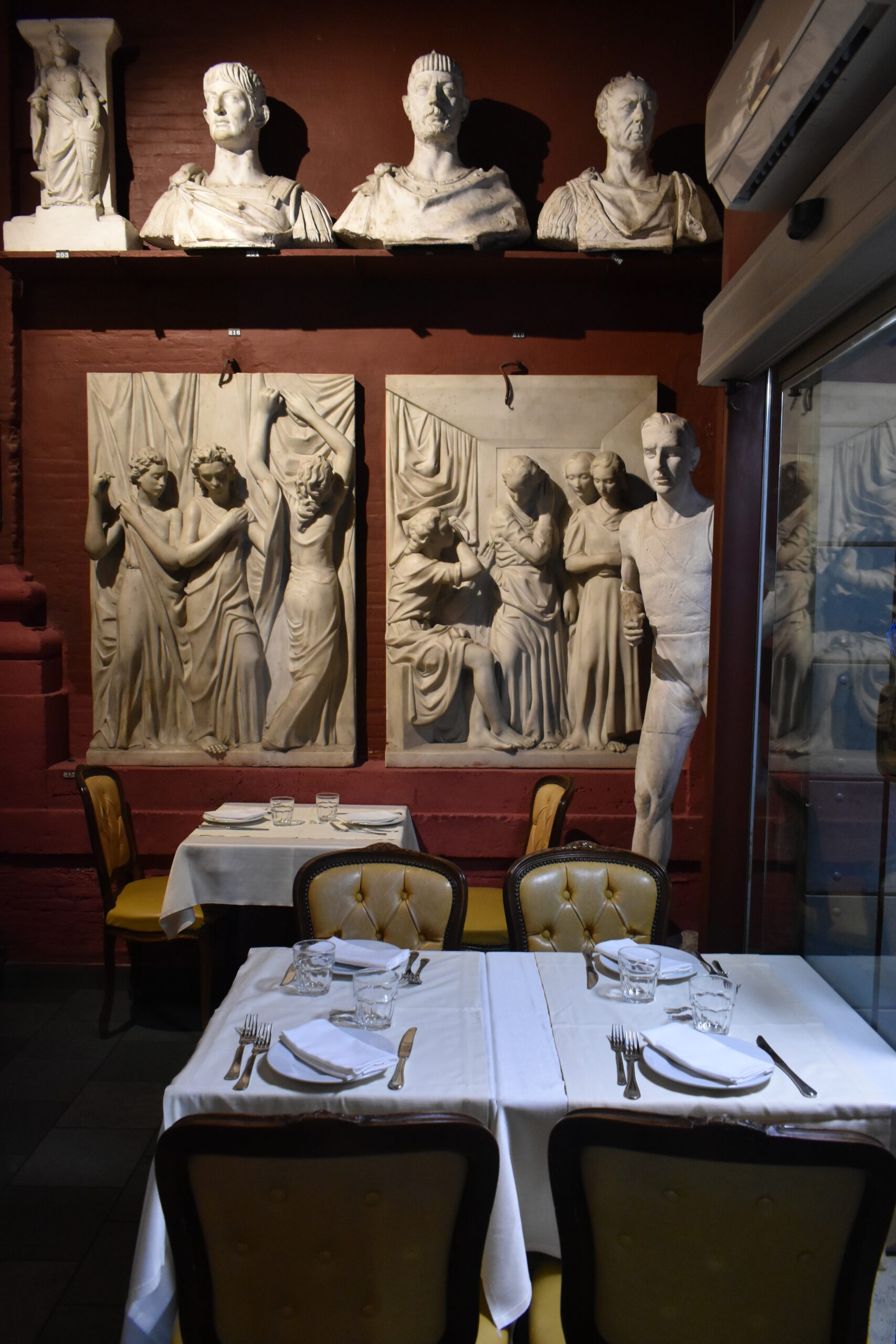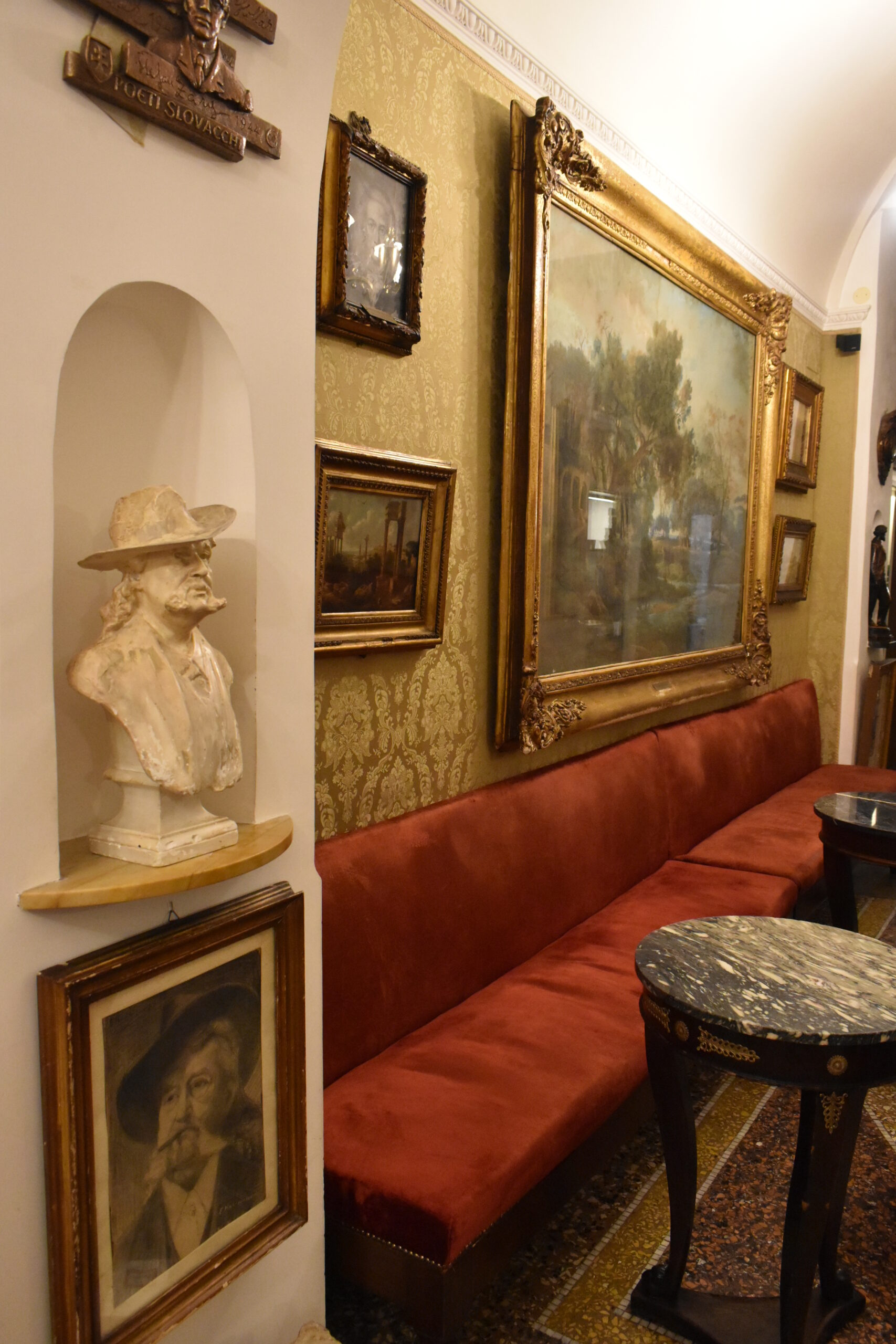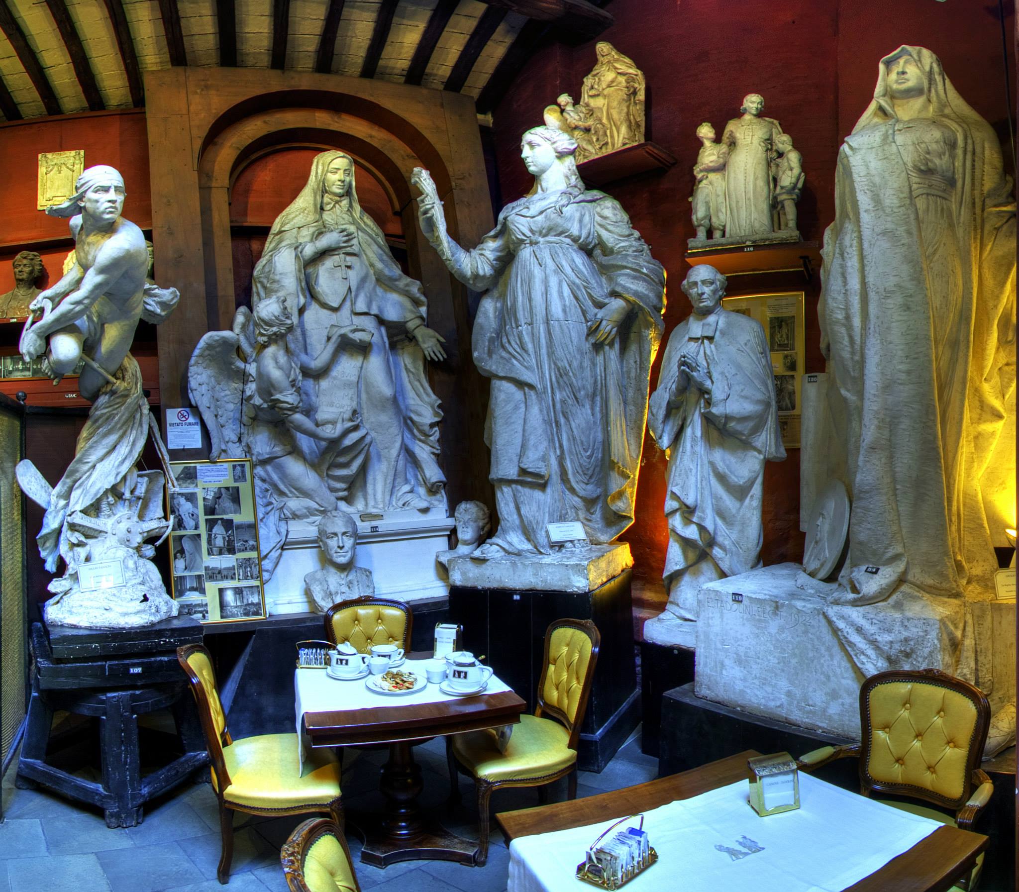 Η διάταξη μάλιστα παραμένει άτακτη, σχεδόν απαράλλαχτη από την εποχή εκείνη, με έργα μεγάλων διαστάσεων να βρίσκονται δίπλα σε προτομές και κυριολεκτικά ανάμεσά τους τα τραπέζια του καφέ και του εστιατορίου που επίσης λειτουργεί εδώ. Ακόμη και οι αποχρώσεις των τοίχων έχουν αποκατασταθεί προσεκτικά κι έτσι ο επισκέπτης σήμερα πραγματικά μεταφέρεται σε μια άλλη εποχή καθώς απολαμβάνει τον καφέ του μαζί με μια από τις εξαιρετικές τάρτες που σερβίρονται εδώ, ένα aperitivo, ακόμη κι ένα γεύμα σε μοναδικό περιβάλλον. Οι εξοικειωμένοι με την εμπειρία Ρωμαίοι προτιμούν τα λιγοστά εξωτερικά τραπέζια για χάζι στον εμπορικό δρόμο, αλλά για να βιώσετε τη μοναδική αίσθηση τριγυρισμένοι από τέχνη, επιλέξτε μία από τις ιστορικές κόκκινες ή επενδεδυμένες με ξύλο αίθουσες.