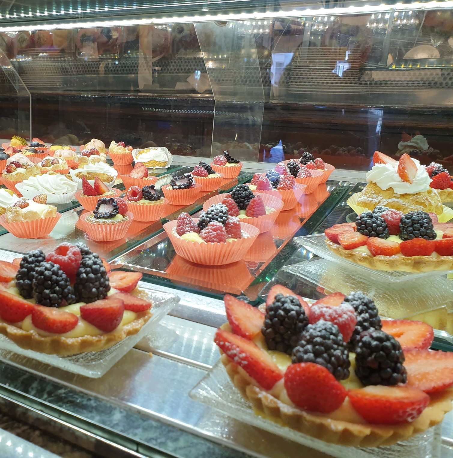 Στο εντυπωσιακό εσωτερικό, το κλασσικό μπαρ στολισμένο με περίτεχνα ψηλά βάζα με λουλούδια και γεμάτο από φρεσκότατους γλυκούς, μικρούς και μεγάλους πειρασμούς, είναι αυτό που προτιμούν οι ντόπιοι για ένα πρωινό καφέ που συνήθως συνοδεύουν με ένα κρουασάν με κρεμ πατισερί και φρέσκες φράουλες.