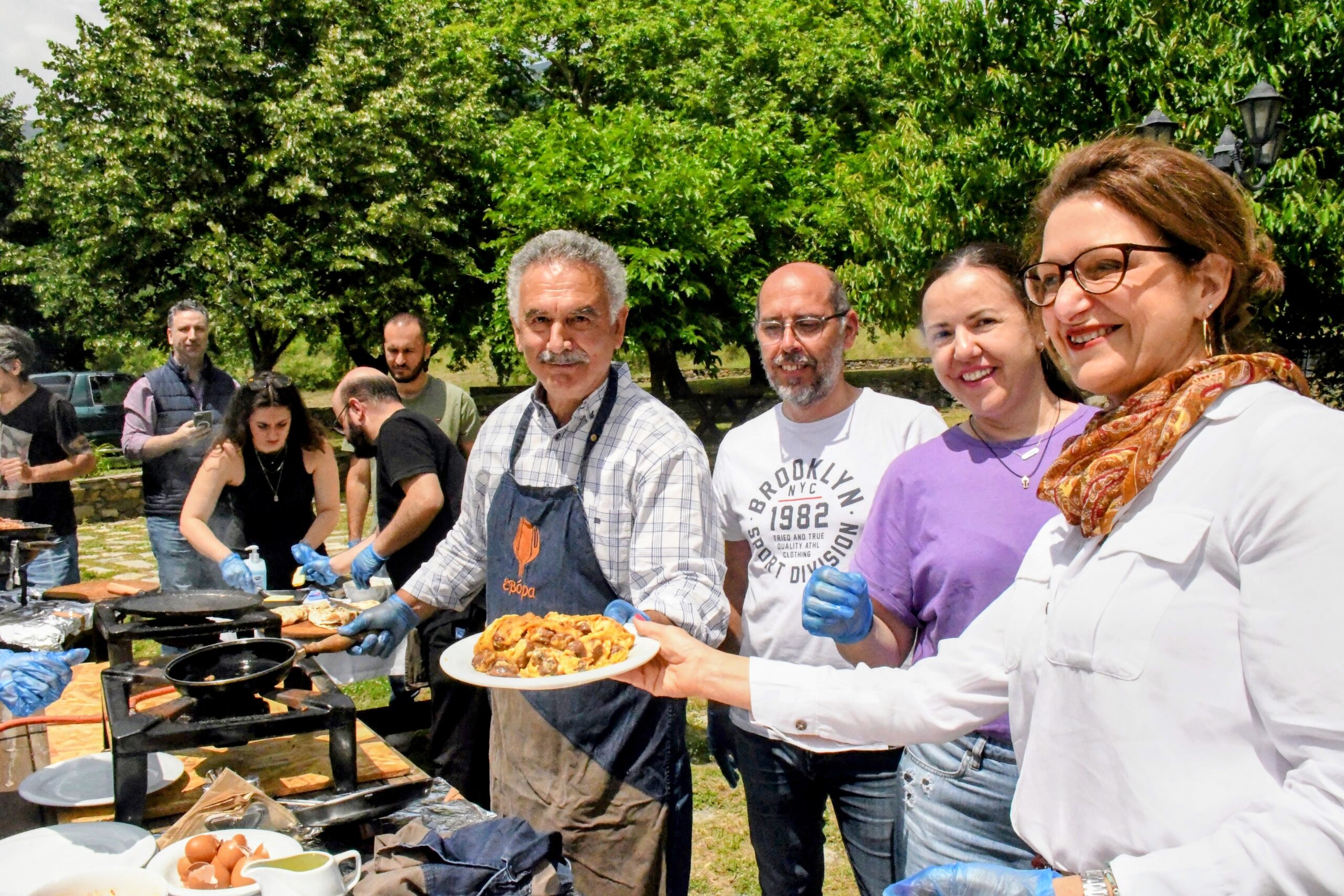 Στο τέλος, όλες οι ομάδες κάθισαν γύρω από το κοινό τραπέζι. Εκεί, στη σκιά του Μπέλλες και μέσα στα αρώματα της αυλής της Εβόρα, οι συμμετέχοντες μοιράστηκαν τις γεύσεις που δημιούργησαν μαζί. Ήταν ένα απλό, ουσιαστικό κλείσιμο σε μια μέρα γεμάτη ιδέες, συνεργασία και χαμόγελα. Μέσα από αυτή τη βιωματική εμπειρία, η σερραϊκή κουζίνα αναδείχθηκε ως ζωντανό κομμάτι της καθημερινότητας, με ρίζες στην παράδοση και θέση στο σήμερα. Μια κουζίνα που συνεχίζει να εμπνέει, να ενώνει και να μας θυμίζει πως η αξία βρίσκεται στο τοπικό, το ουσιαστικό, το αληθινό.