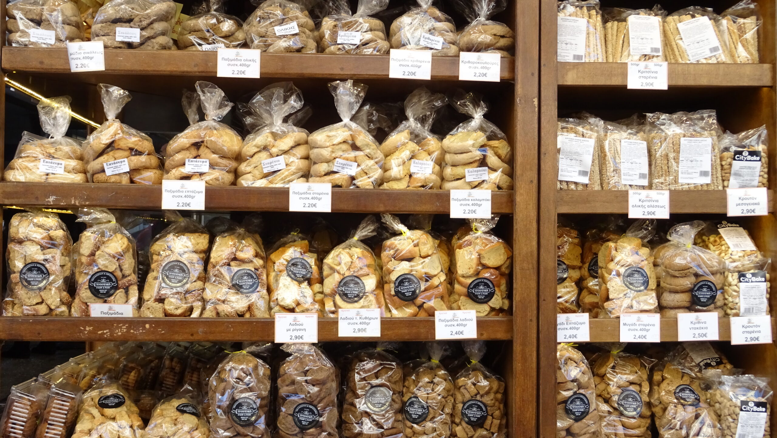 «Σπιτικό» (2109573571) Πολλά ψωμιά -ο κόσμος ζητάει το δίκιλο προζυμένιο ζυμωτό. Πολλά παξιμάδια ανάμεσά τους 4 είδη κριθαροπαξιμαδα, συν κριθαροκουλούρες, παξιμάδια από χαρούπι και παξιμάδια από σίκαλη. Εξαιρετικό σταφιδόψωμο με λάδι.