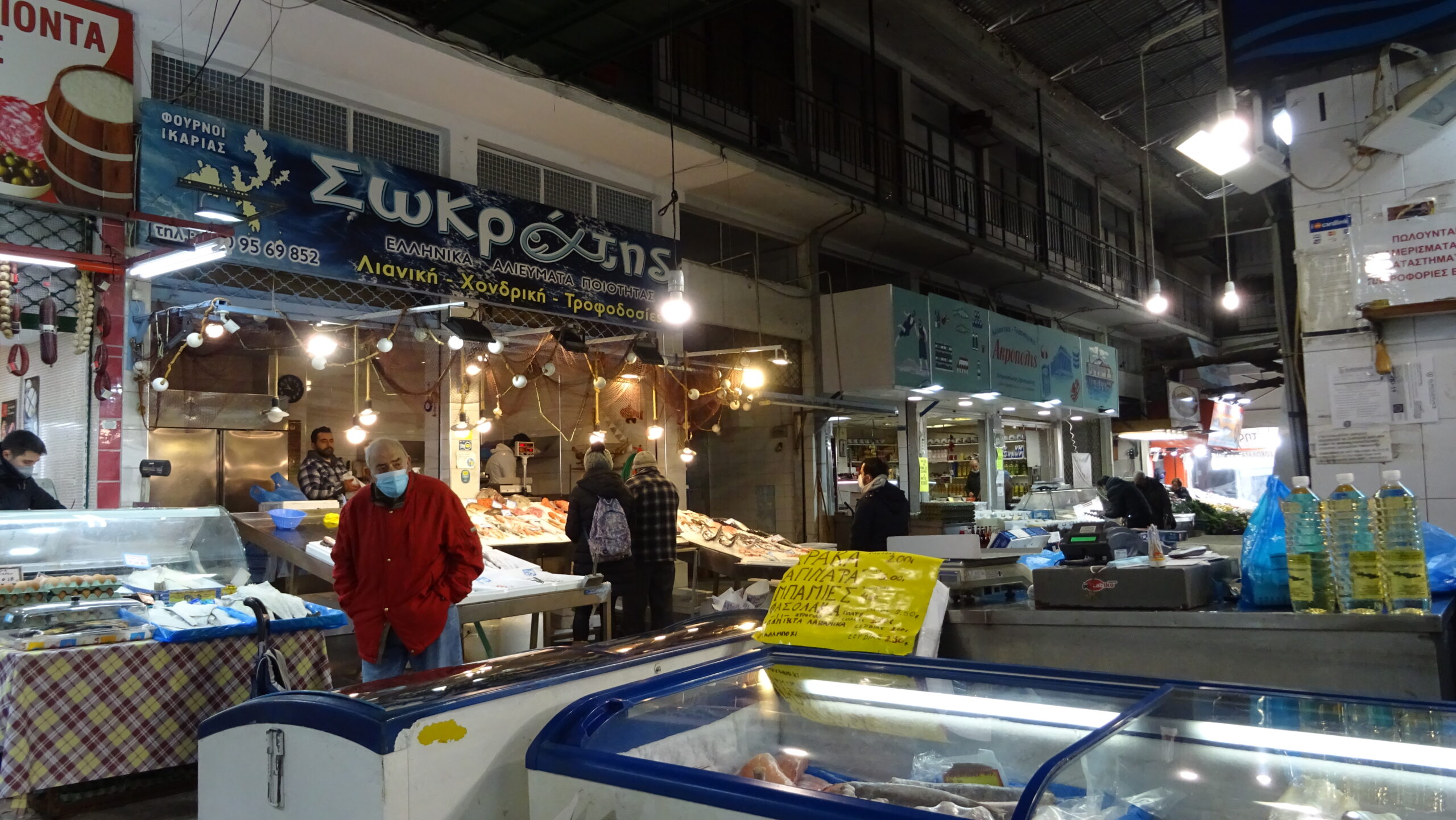 «Σωκράτης» (2109569852). Φρέσκα ψάρια με τα δικά τους αλιευτικά από τους Φούρνους Ικαρίας. Θα βρείτε εκτός από τα συνηθισμένα και ψάρια όπως χειλούδες και χάνους, κάποιες φορές πελαγίσια μυλοκόπια και αυγά ψαριών.