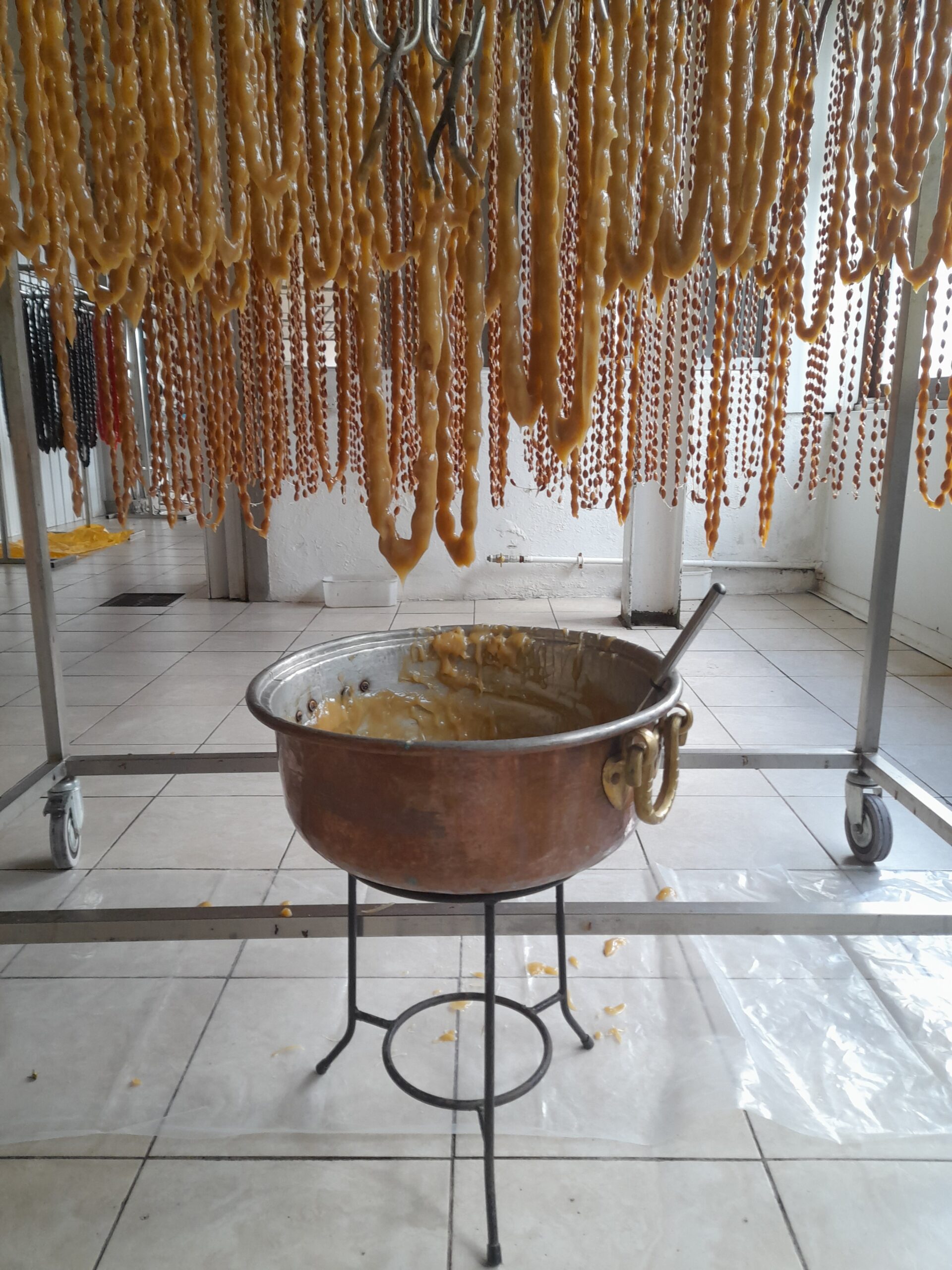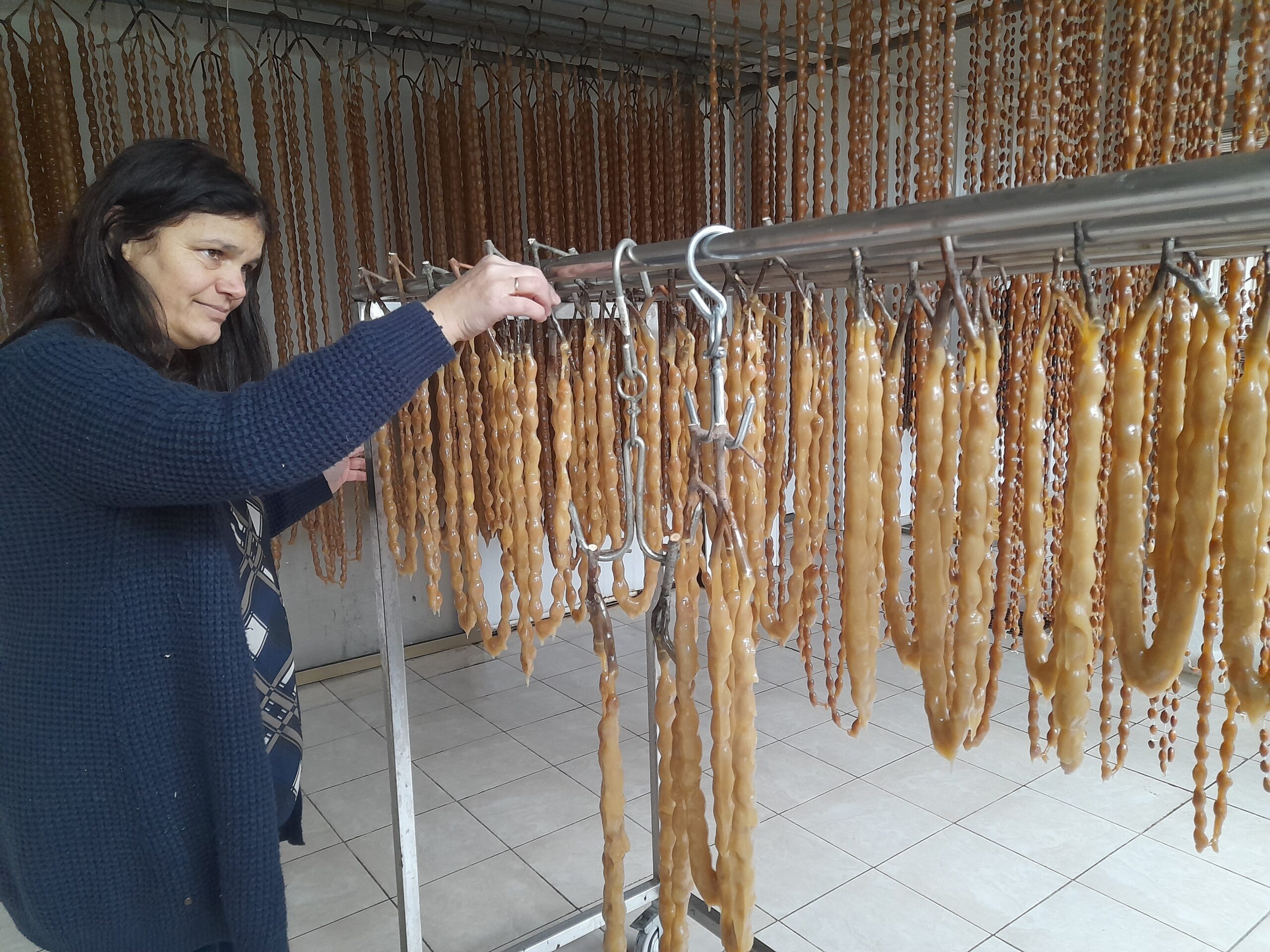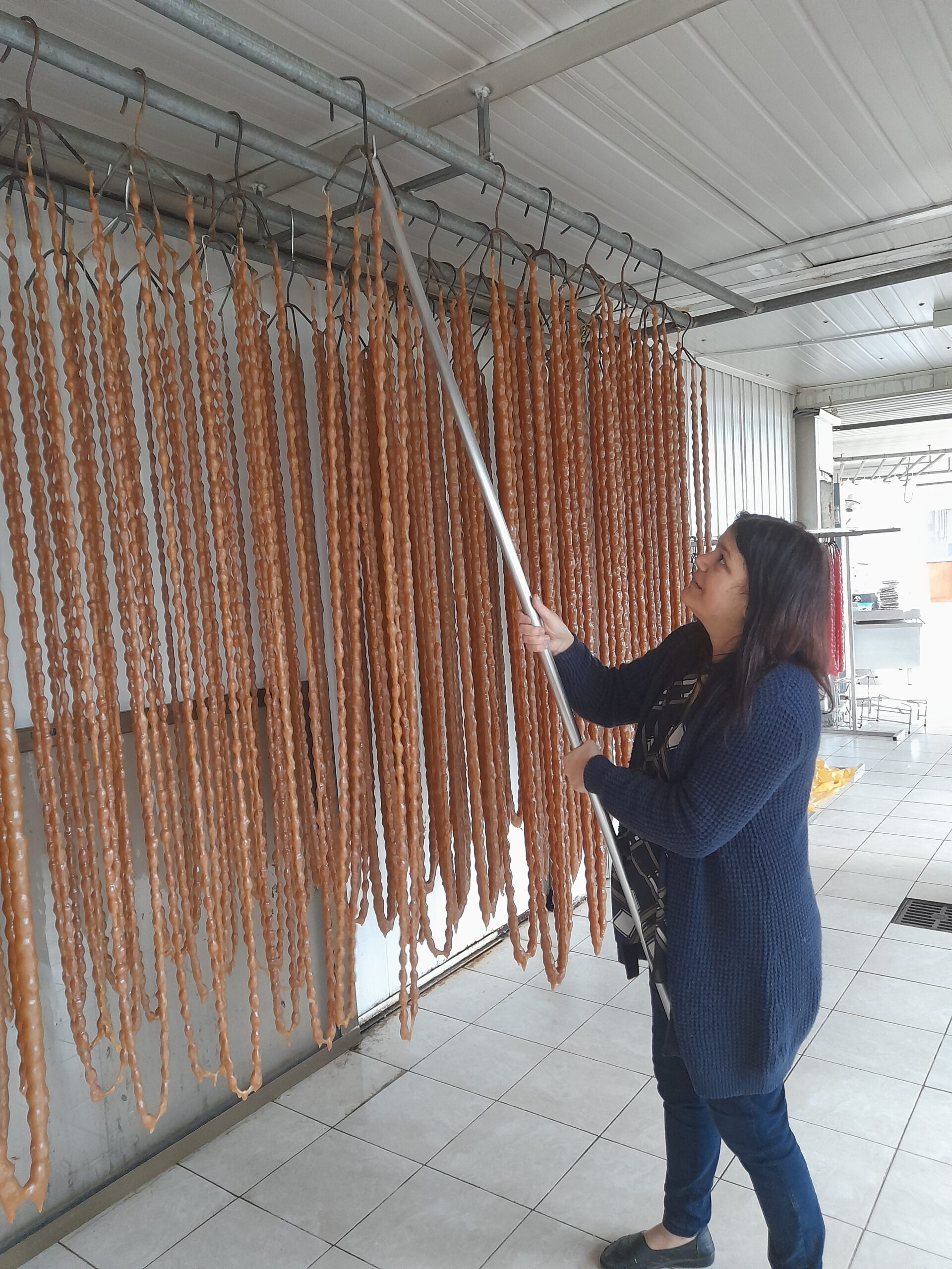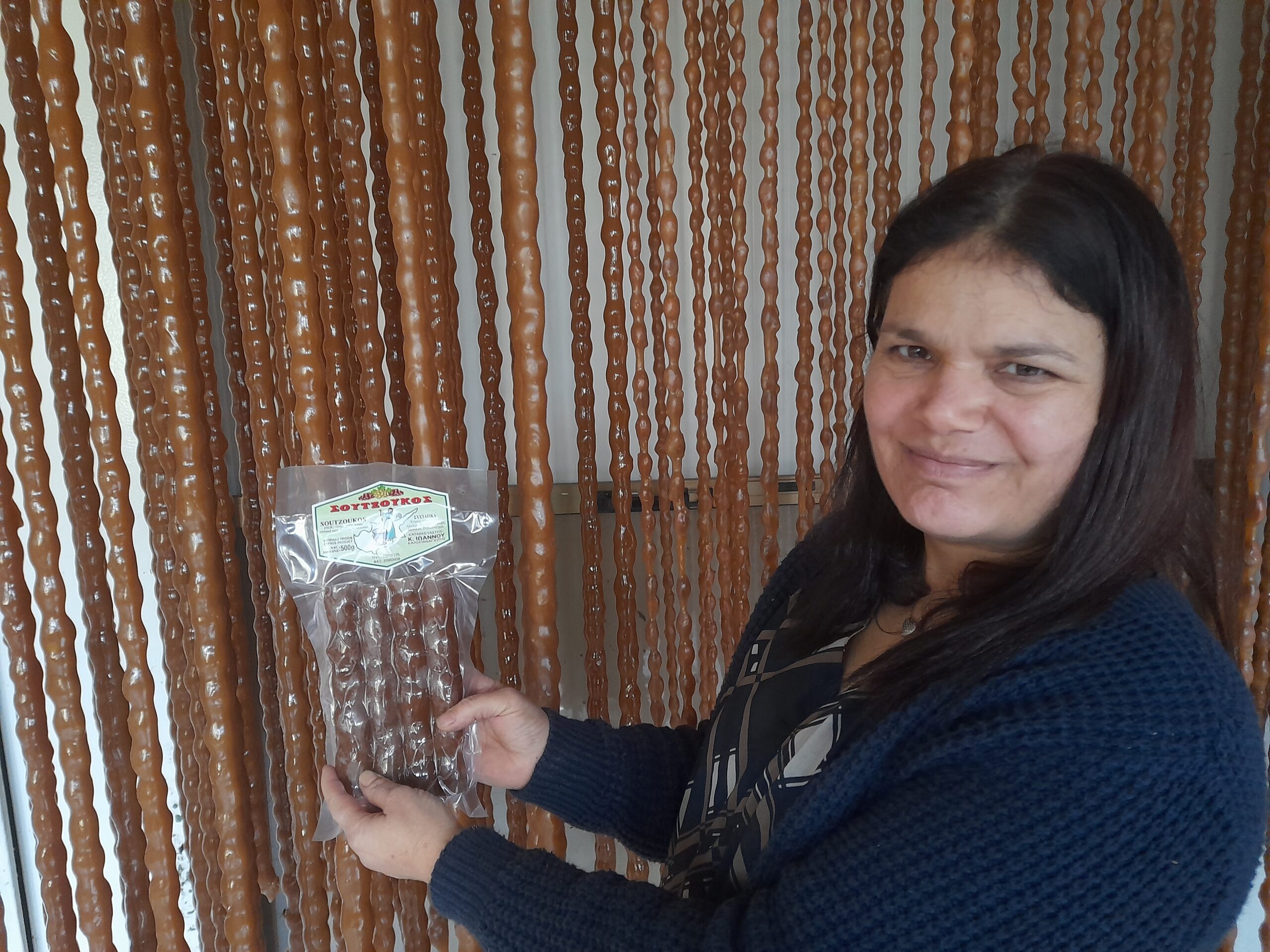 Βρεθήκαμε στο γραφικό χωριό και στο παραδοσιακό εργαστήριο της κυρίας Ιωάννου και «βυθιστήκαμε» στις γεύσεις και στα αρώματα, ανάμεσα σε δεκάδες κρεμασμένα αμυγδαλωτά «κολιέ» που περιμένουν υπομονετικά να στεγνώσουν ώστε να κοπούν και στη συνέχεια να συσκευαστούν ως γλυκά «sujuk». Δοκιμάσαμε μαραθέφτικο σουτζούκο, παλουζέ με κομματάκια καρυδόψιχας και, βέβαια, ήπιαμε ζιβανία μαζί με κεφτέρια και καρύδια.