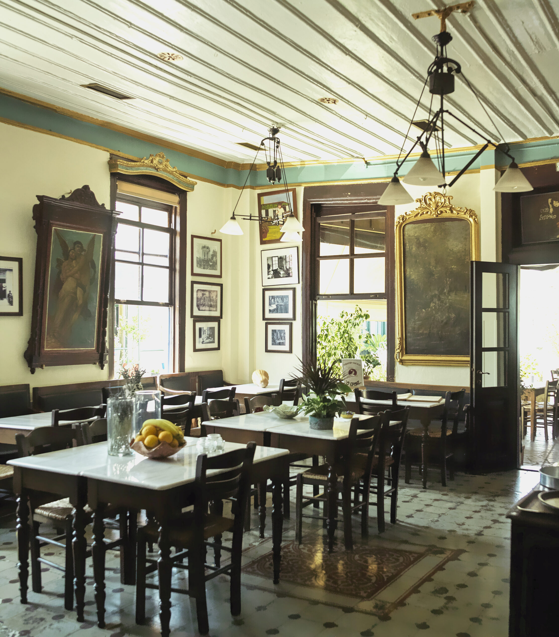 Είναι ένα από τα πιο ιστορικά καφενεία του νησιού, αφού λειτουργεί σχεδόν από το 1800 και από το 1922 με αυτή την επωνυμία. Οι ιδιοκτήτες διατήρησαν την ατμόσφαιρα, τα μαρμάρινα τραπέζια, τους πίνακες, μέχρι και τον ελληνικό καφέ ακόμα στη χόβολη τον ετοιμάζουν. Όσον αφορά το φαγητό και εδώ τιμάται η παράδοση: κολοκυθολούλουδα γεμιστά με ρύζι, χταπόδι κρασάτο, ντολμαδάκια γιαλαντζί τυλιγμένα στο χέρι, παστά μικρόψαρα. Δοκιμάστε και τα τοπικά σουγάνια (κρεμμυδοντολμάδες με γέμιση από κιμά και αρώματα κύμινου και κανέλας). Μεγάλη επιλογή σε ούζα και φιλικότατο σέρβις.