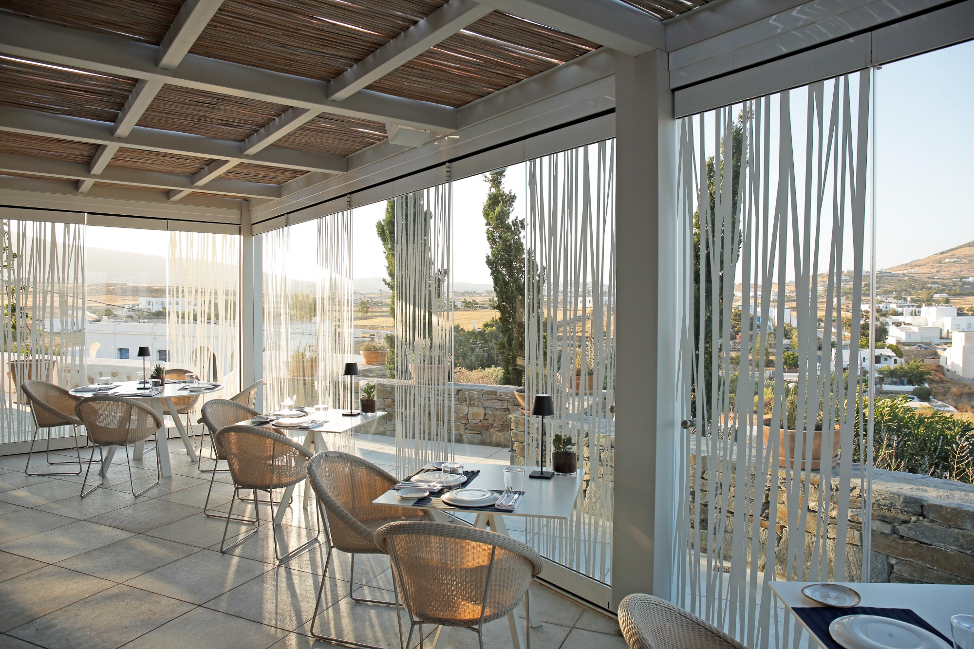 Το εστιατόριο με τους χτιστούς καναπέδες, τις αναπαυτικές μαξιλάρες και το μεγάλο μπαρ απλώνεται κάτω από την ημισκεπαστή με καλάμια στέγη. Η αισθητική του ακολουθεί τη γοητευτική αισθητική του Boutique resort Cove Paros που το φιλοξενεί. Καθαρές λιτές γραμμές, πέτρα, τσιμεντοκονία σε γήινα χρώματα, απόλυτη εναρμόνιση με το κυκλαδίτικο τοπίο -σαν να αναδύεται μέσα από τη γη. Η διατήρηση της φυσικής βλάστησης, χαμηλοί θάμνοι που αντέχουν στο μελτέμι, καλαμιές αρμυρίκια, ελίτσες, δίνουν μια σχεδόν συγκινητική αθωότητα στο χώρο.