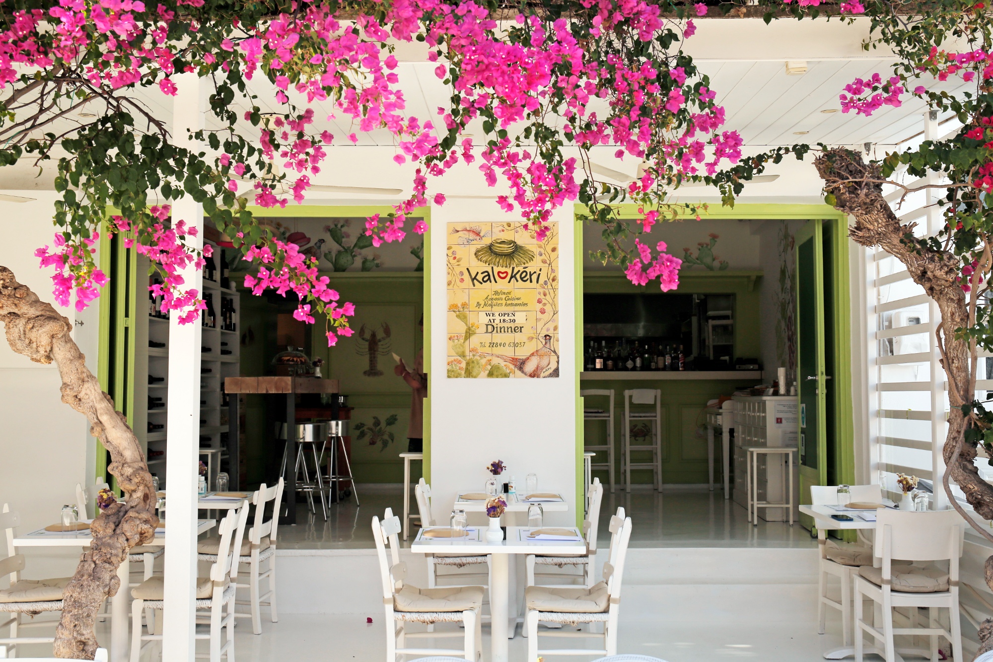 Πάνω στον κεντρικό πεζόδρομο της Χώρας, πνιγμένο στις μπουκαμβίλιες το εστιατόριο είναι ένα από τα καλύτερα spot για να βλέπετε και να σας βλέπουν, καθώς σερβίρει στην υπερυψωμένη βεραντούλα και βγάζει τραπεζάκια στο πεζοδρόμιο.