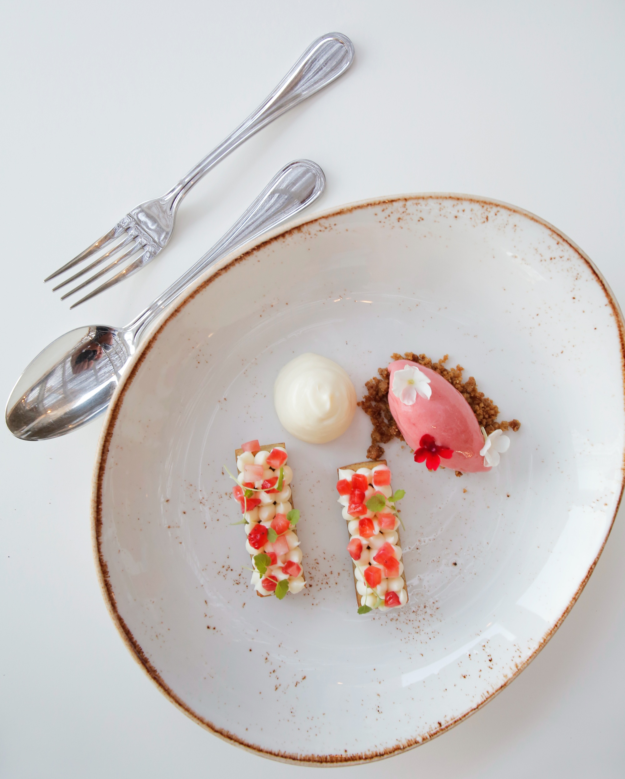 Το εξαιρετικό δείπνο κερδίζει πόντους από τα ανάλαφρα επιδόρπια: Μους λευκής σοκολάτας αρωματισμένη με μοσχολέμονο, κέικ από φιστίκι Αιγίνης, μπισκότο εστραγκόν και σορμπέ φράουλας και Ναμελάκα σοκολάτας με αφρό καραμέλας, μπισκότα σοκολάτας και παγωτό εσπρέσο. Προσεγμένη art de la table.