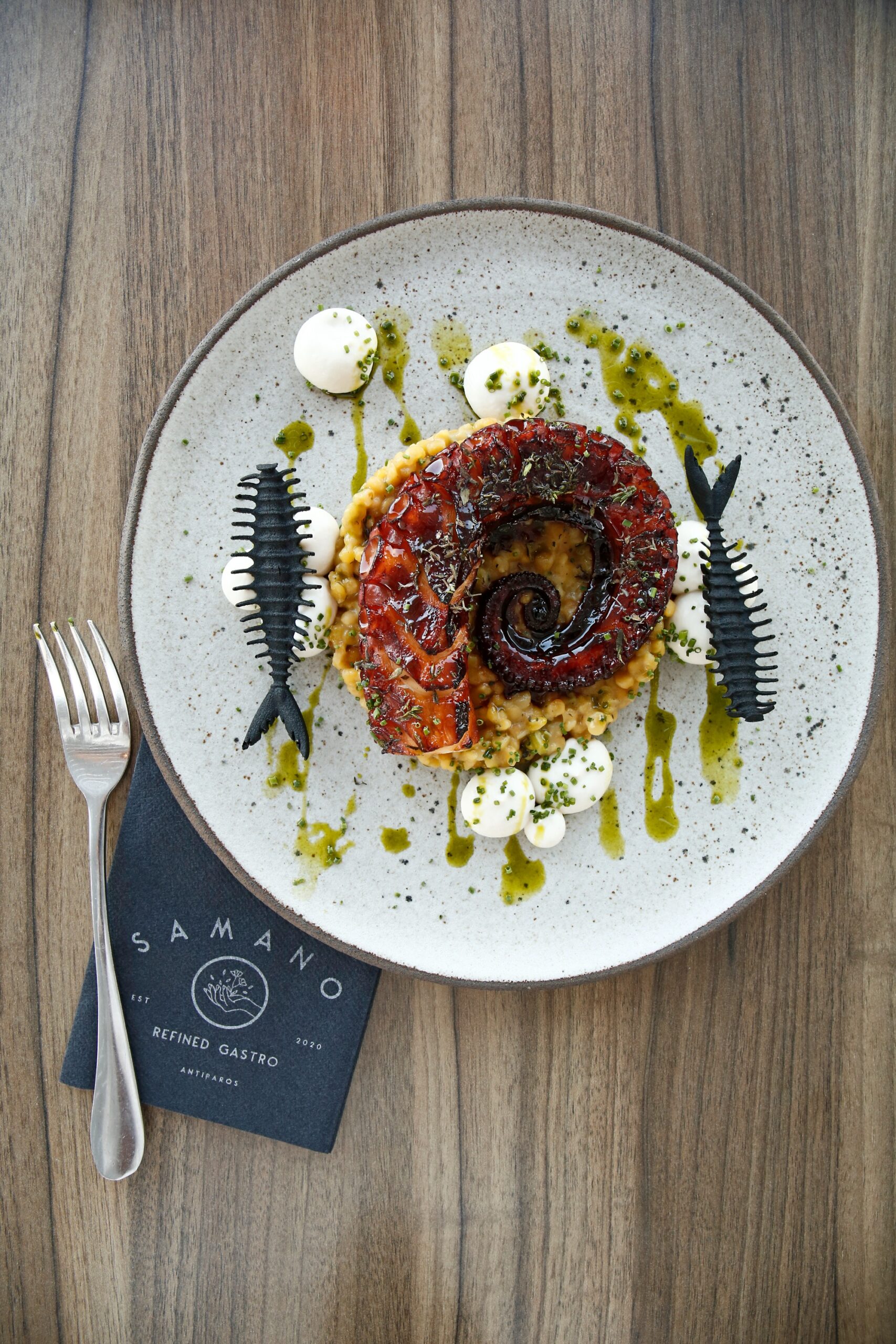 Θα απολαύσετε το Μπαρμπούνι σαβόρο με λευκή μελιτζάνα και καπνιστό λάδι από νεροκρέμμυδο και το Βιολογικό κόκορα με παλαιωμένο κρασί, κρέμα καλαμποκιού και εσαλότ με πετιμέζι. Θα σας μείνει αξέχαστη η Αιγαιοπελαγίτικη ψαρόσουπα με πετρόψαρα και λαχανικά με σαφράν και βασιλικό.