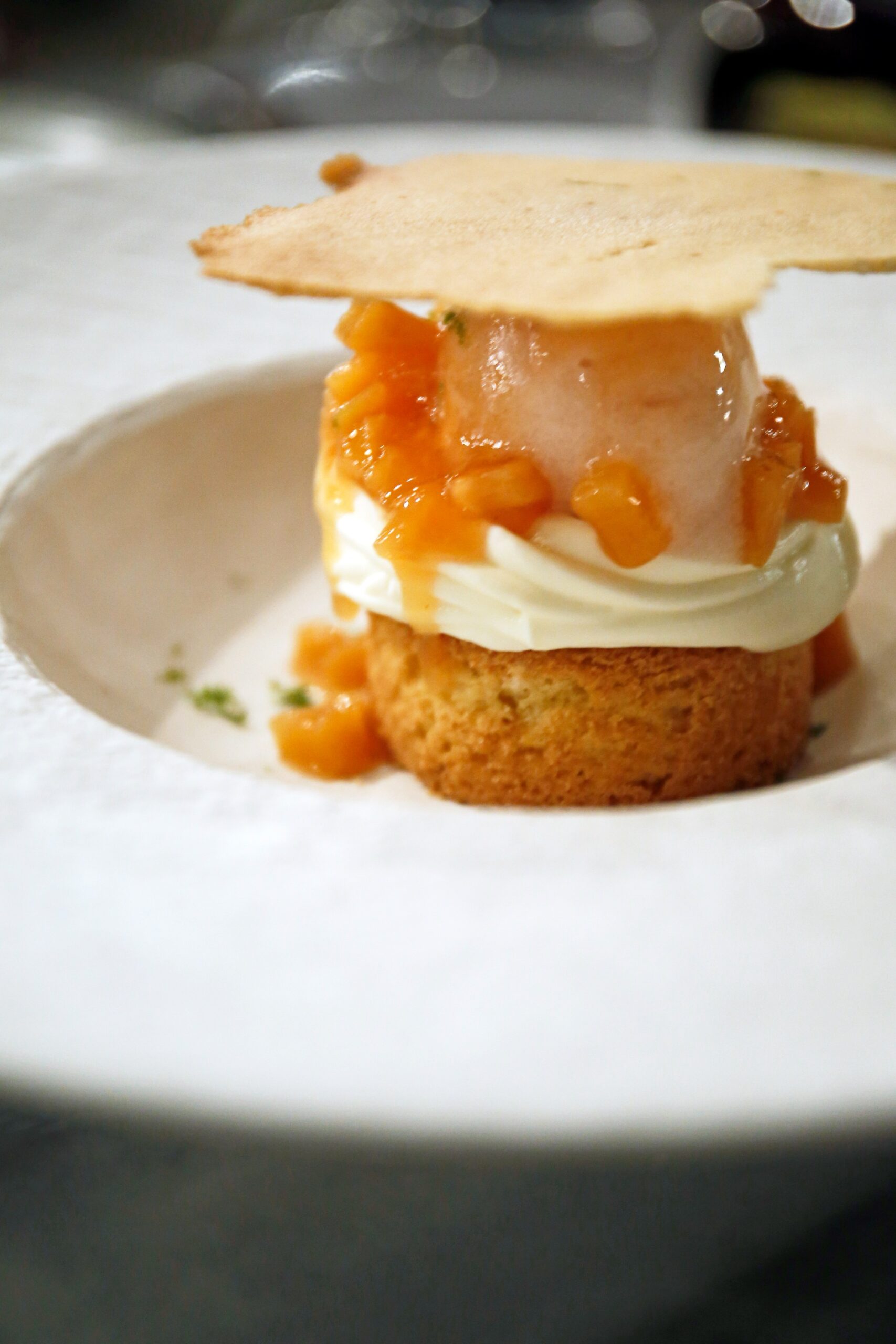 Πραγματικό επιδόρπιο, δροσερό και αρωματικό το Ροδάκινο σε βάση από σαμπλέ, μους γιούρτι, κομπόστ ροδάκινου παγωτό ροδάκινο και τούιγ με λάιμ και βανίλια.
