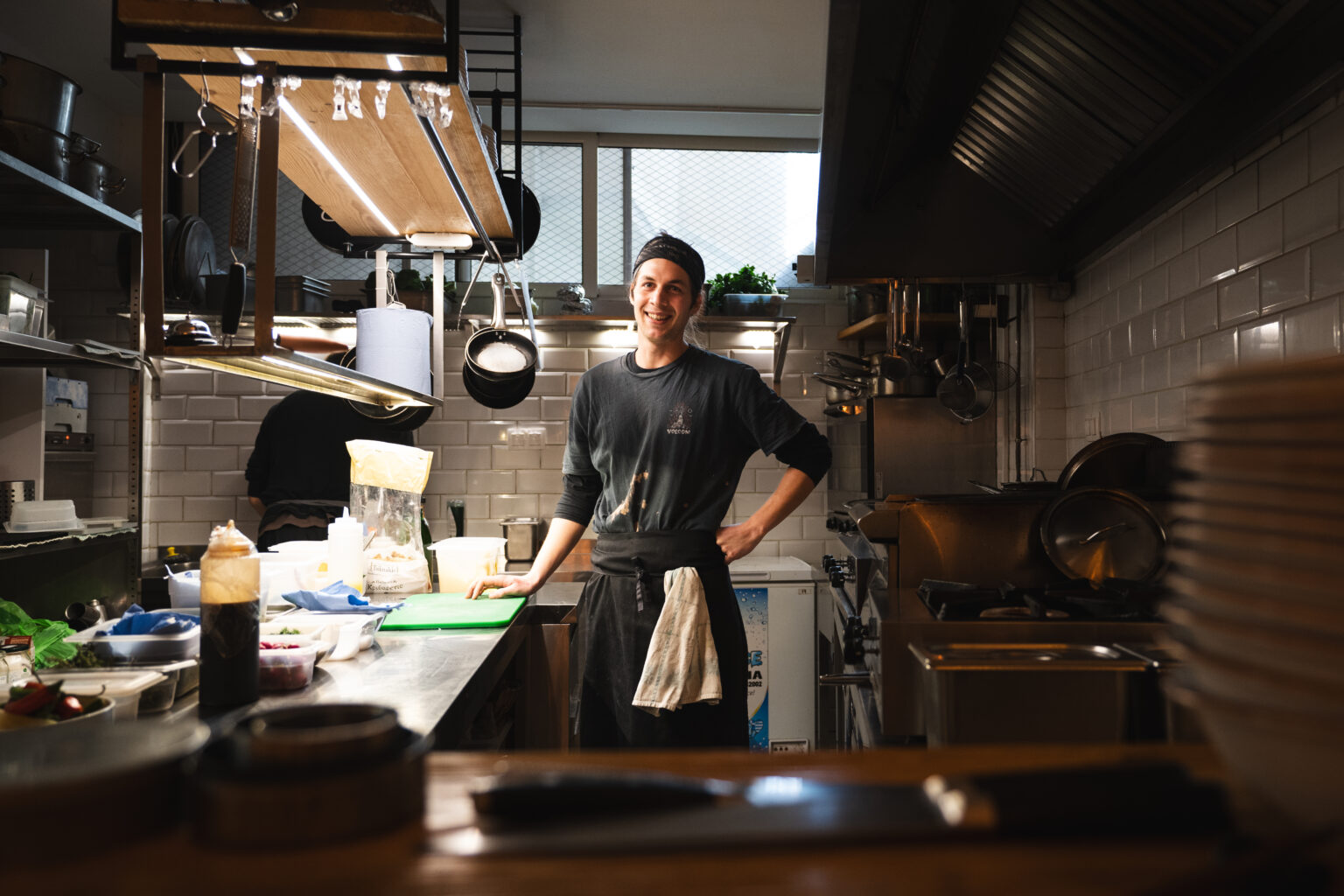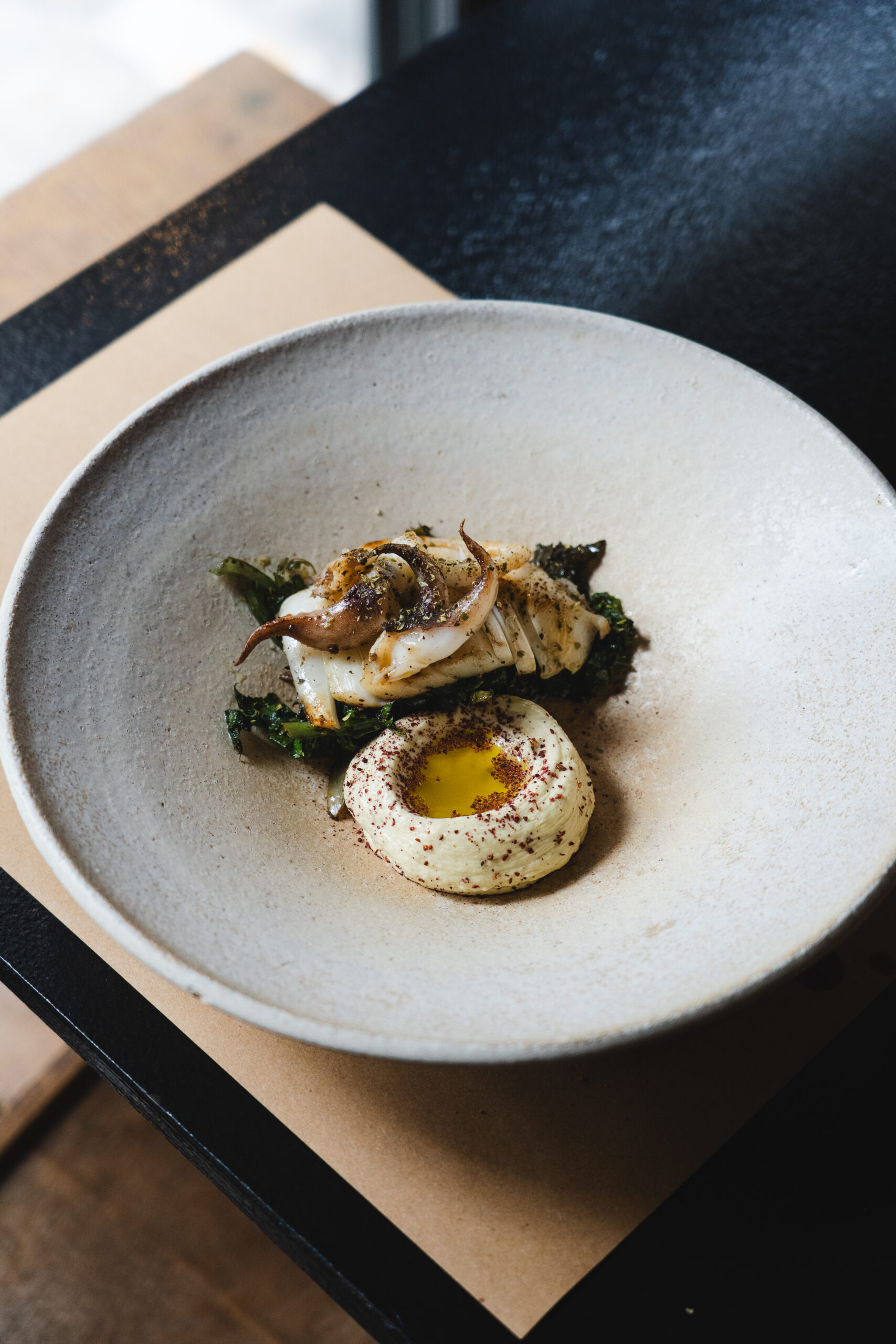 Στην πιο νόστιμη γειτονιά της πόλης, (γειτονάκι με το κρητικό Χαρούπι του Παπουτσάκη και το ψαρομάγαζο του Σούσουρα) μέσα στα ξακουστά Λαδάδικα, το μαγαζί κινείται στο δικό του χωροχρόνο. Πήγαμε μεσημέρι, με ψιλόβροχο, πριν ανοίξει το μαγαζί και καθίσαμε στα ψηλά σκαμνιά έξω, κάνοντας χάζι την ανοιχτή κουζίνα με το λευκό μαρμάρινο πάγκο και μια στόφα με μεταλλικό απορροφητήρα. Οι μάγειρες κινούνται ενορχηστρωμένα και τελετουργικά, αμίλητοι και συγκεντρωμένοι. Ψωμί χειροποίητο προζυμένιο από βιολογικά ελληνικά άλευρα, σταρένιο και αλεύρι από ζέα, μαλακό κατσικίσιο τυράκι με εξαιρετικό παρθένο ελαιόλαδο και ρίγανη. Μετά, το αγαπημένο μας πιάτο: «σουπιά ψητή στο μαντέμι με ζεματιστούς ζοχούς και λευκό ταραμά φτιαγμένο με ψωμί και γαρνιρισμένο με σουμάκ». Ονειρεμένο το άρωμα της σουπιάς από το ψήσιμο στο μαντέμι που τελικά, ναι, είναι μοναδικό.