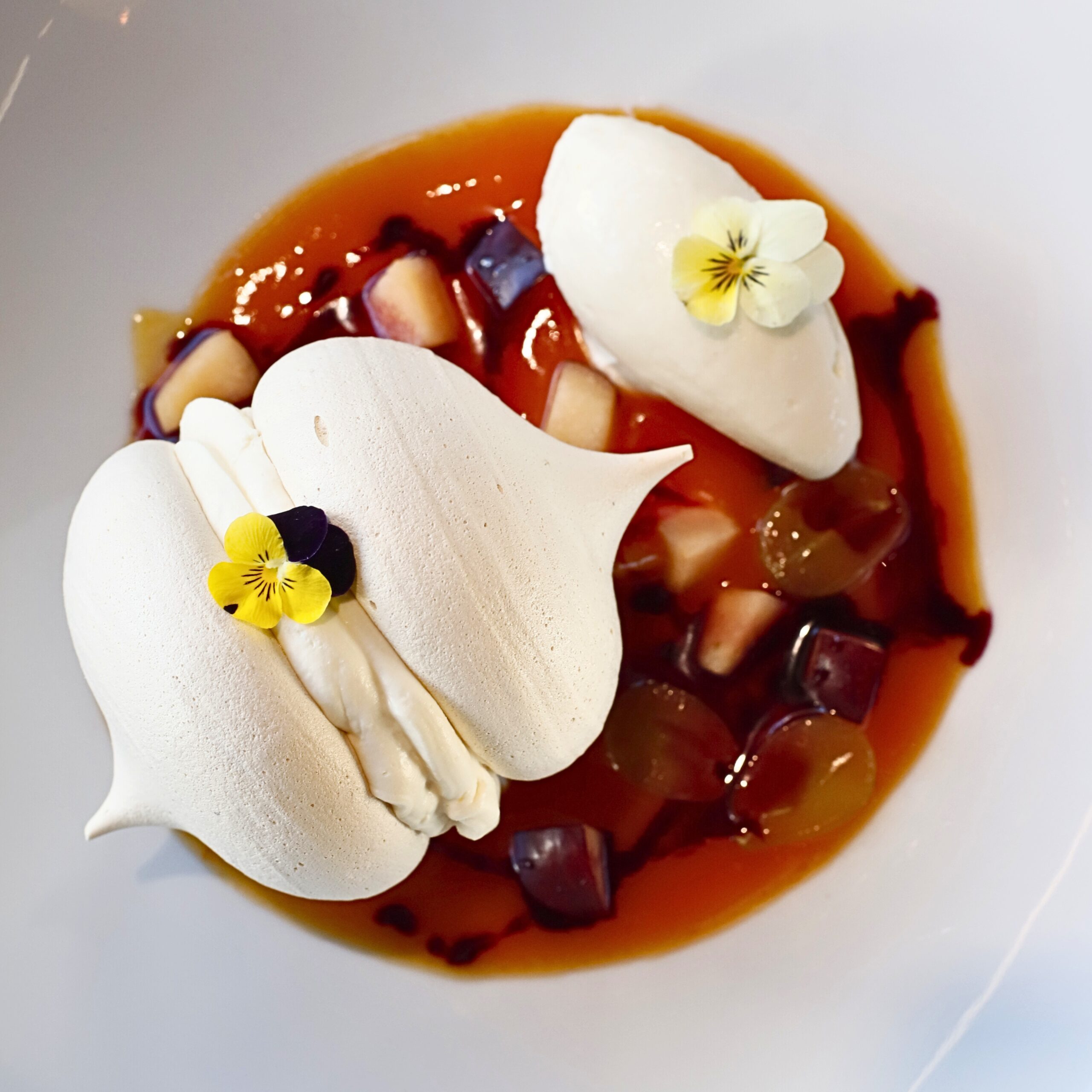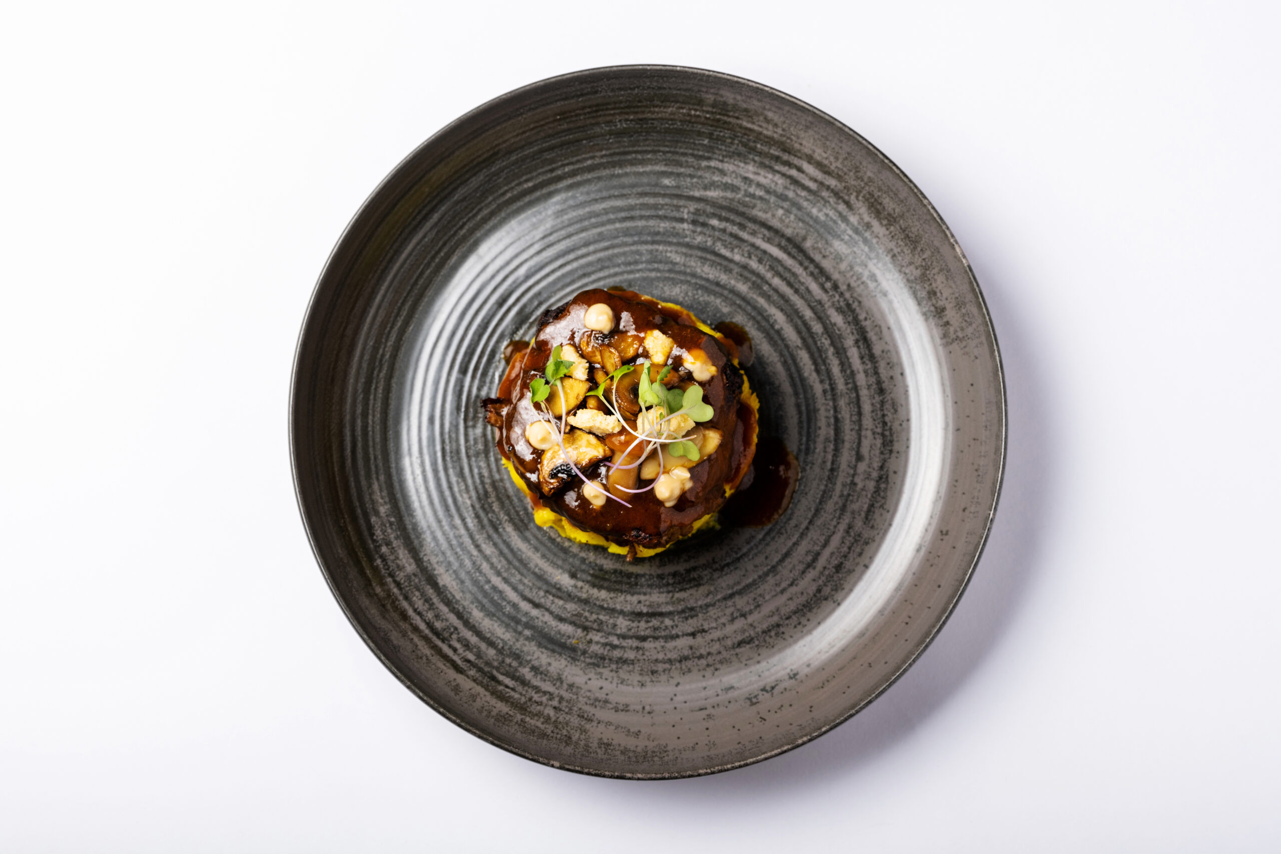 Ο κρόκος είναι ακριβώς μελάτος στο πιάτο «μελάτοι κρόκοι με κρέμα στάκας, τσιπς απάκι, αλμυρή μαρέγκα, καβουρδισμένα αμύγδαλα και τρούφα» -μία αλά Παπουτσάκης απόδοση της διάσημης κρητικής νοστιμιάς αυγά με τη στάκα. Σκάνδαλο τα αμύγδαλα, σκάνδαλο η αλμυρή μαρέγκα, αλλά τόσο ηδονικά. Ιδού ο εξευγενισμός που γράφουμε παραπάνω. Ο κοσμαγάπητος διεθνώς ντάκος, γίνεται ένα «ταρτάκι κρούστας με κρέμα κρητικών τυριών, τοματίνια και ρίγανη». Η λεπτότατη δαντελωτή κρούστα φτιάχνεται από χυλό, η ρίγανη σκάει στο τέλος θριαμβευτική. Εξακολουθεί να είναι ντάκος; Ναι, ασφαλώς. Απλώς, ο σεφ το μετατρέπει σε ορεκτικό περιωπής για καλό εστιατόριο. Το τσιγαριαστό αρνί στιφάδο, με σκιουφιχτά (κρητικά ζυμαρικά) από χαρούπια, γραβιέρα και κρέμα στάκας είναι να κλαις από τη νοστιμάδα.