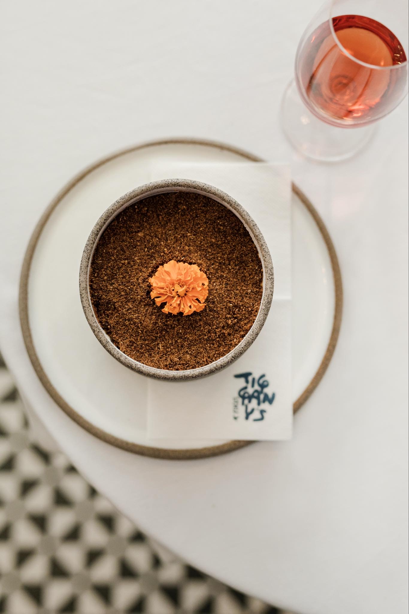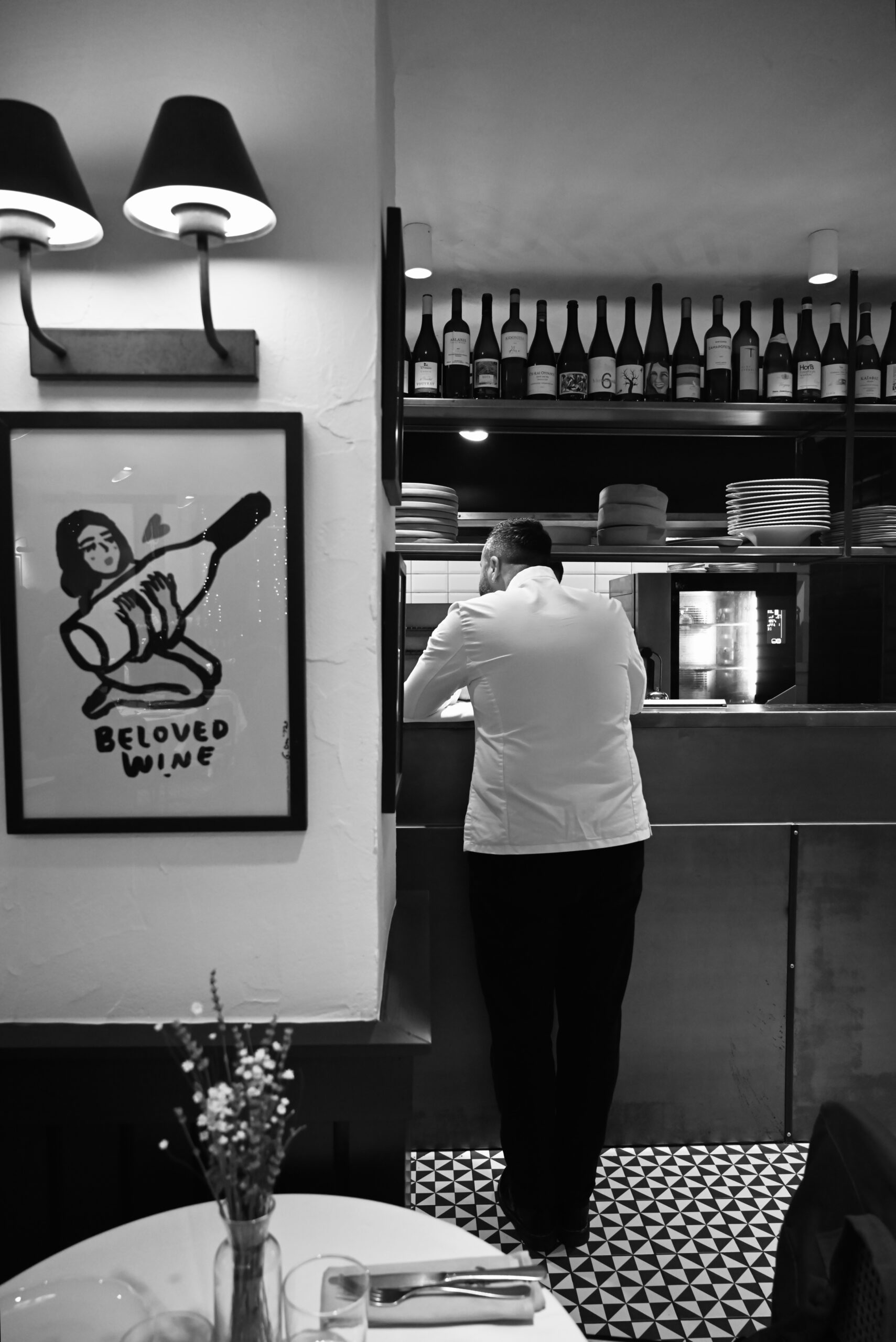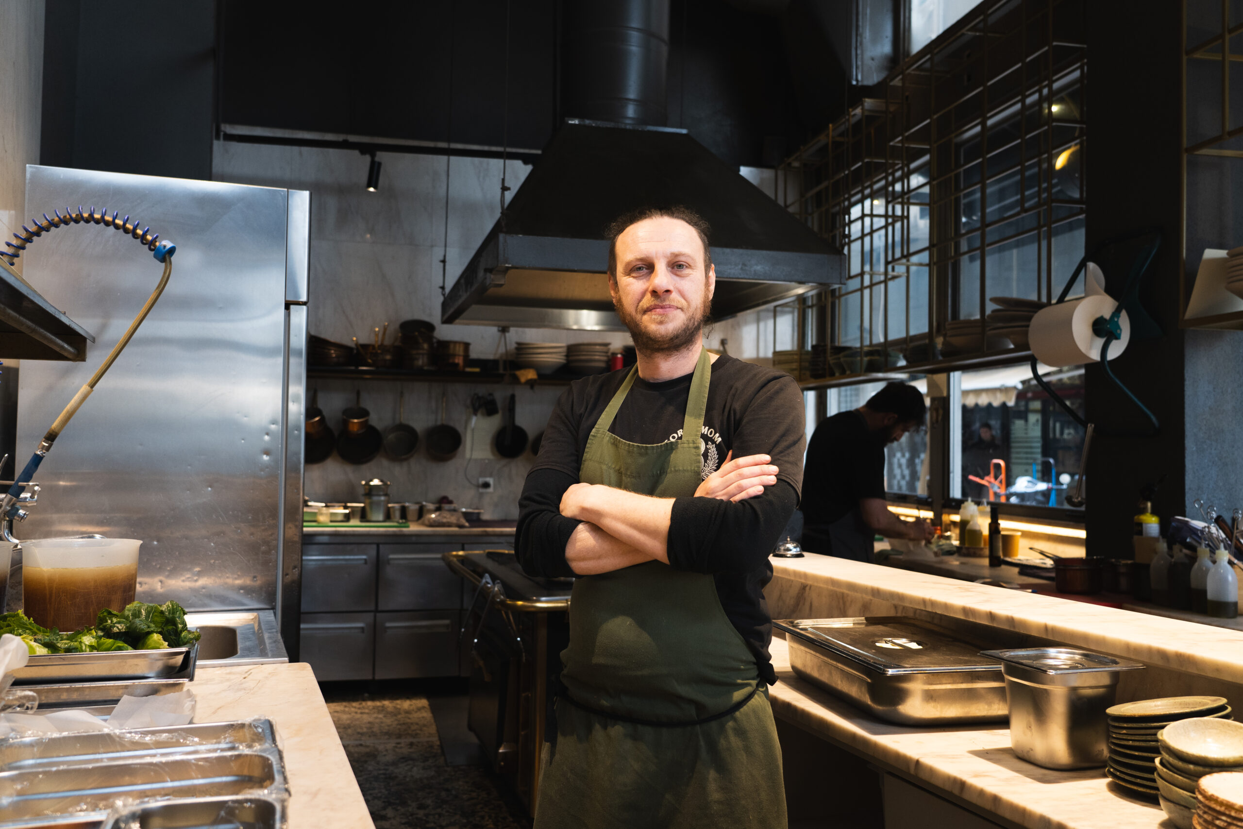 Στην πιο νόστιμη γειτονιά της πόλης, (γειτονάκι με το κρητικό Χαρούπι του Παπουτσάκη και το ψαρομάγαζο του Σούσουρα) μέσα στα ξακουστά Λαδάδικα, το μαγαζί κινείται στο δικό του χωροχρόνο. Πήγαμε μεσημέρι, με ψιλόβροχο, πριν ανοίξει το μαγαζί και καθίσαμε στα ψηλά σκαμνιά έξω, κάνοντας χάζι την ανοιχτή κουζίνα με το λευκό μαρμάρινο πάγκο και μια στόφα με μεταλλικό απορροφητήρα. Οι μάγειρες κινούνται ενορχηστρωμένα και τελετουργικά, αμίλητοι και συγκεντρωμένοι. Ψωμί χειροποίητο προζυμένιο από βιολογικά ελληνικά άλευρα, σταρένιο και αλεύρι από ζέα, μαλακό κατσικίσιο τυράκι με εξαιρετικό παρθένο ελαιόλαδο και ρίγανη. Μετά, το αγαπημένο μας πιάτο: «σουπιά ψητή στο μαντέμι με ζεματιστούς ζοχούς και λευκό ταραμά φτιαγμένο με ψωμί και γαρνιρισμένο με σουμάκ». Ονειρεμένο το άρωμα της σουπιάς από το ψήσιμο στο μαντέμι που τελικά, ναι, είναι μοναδικό.