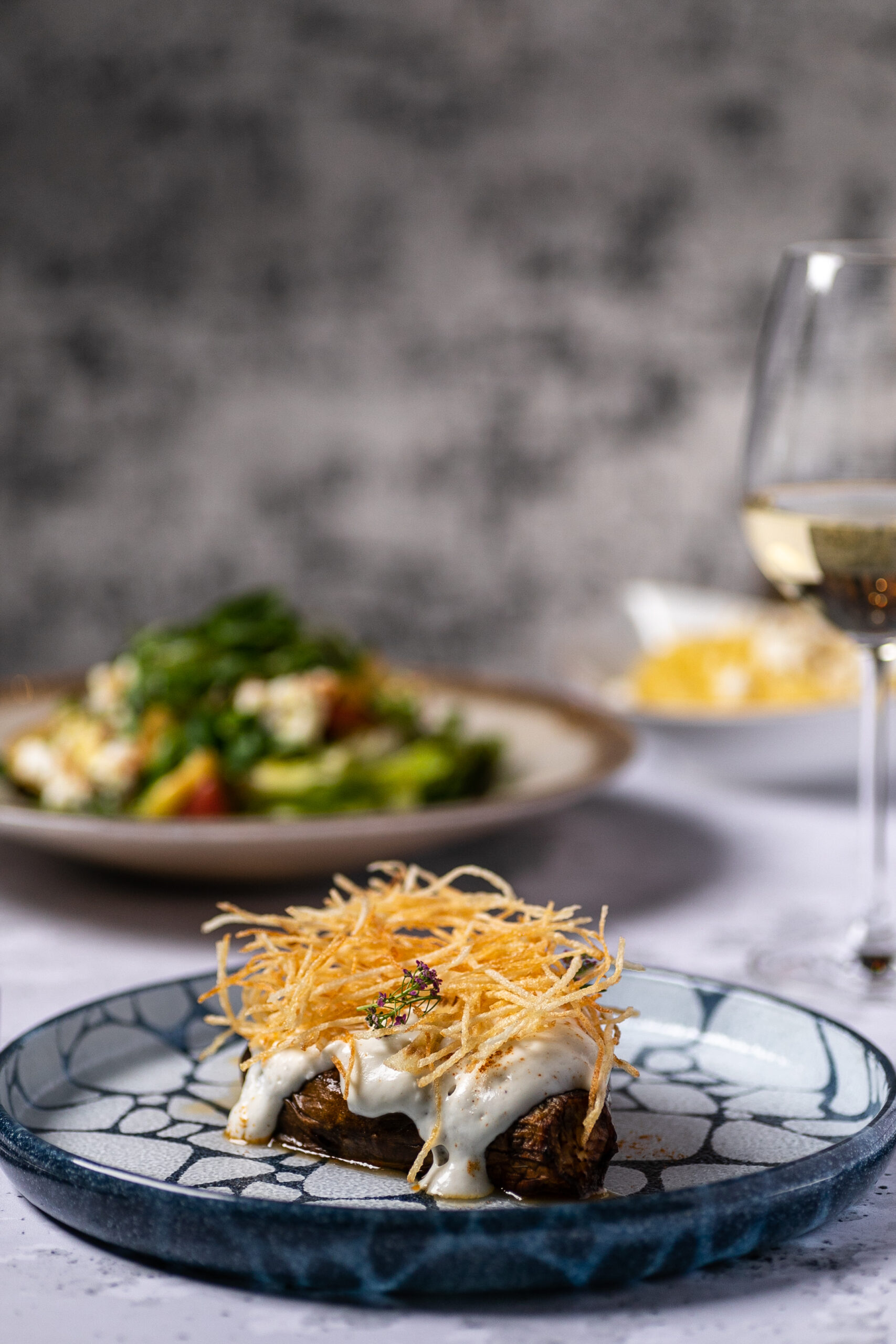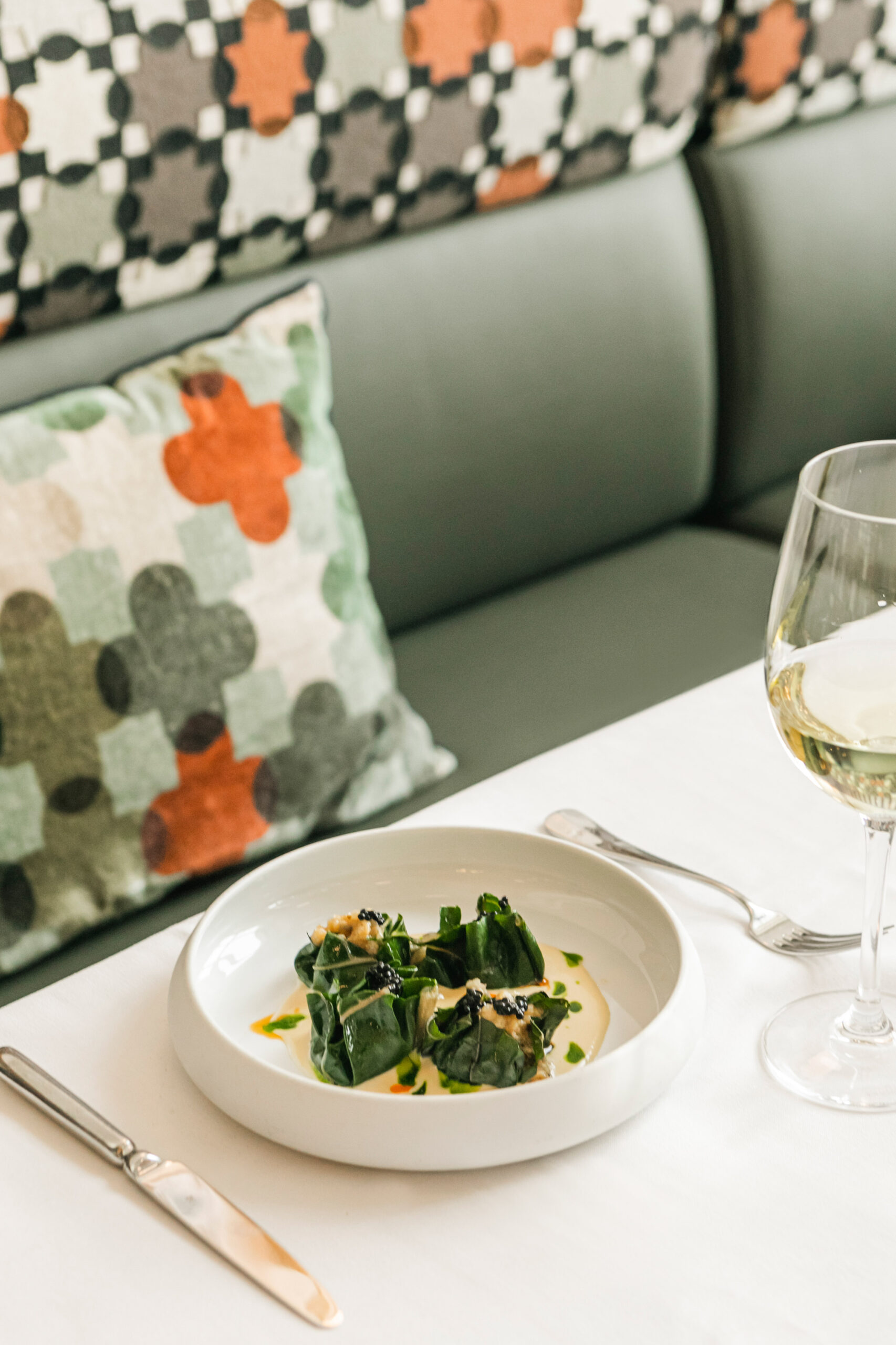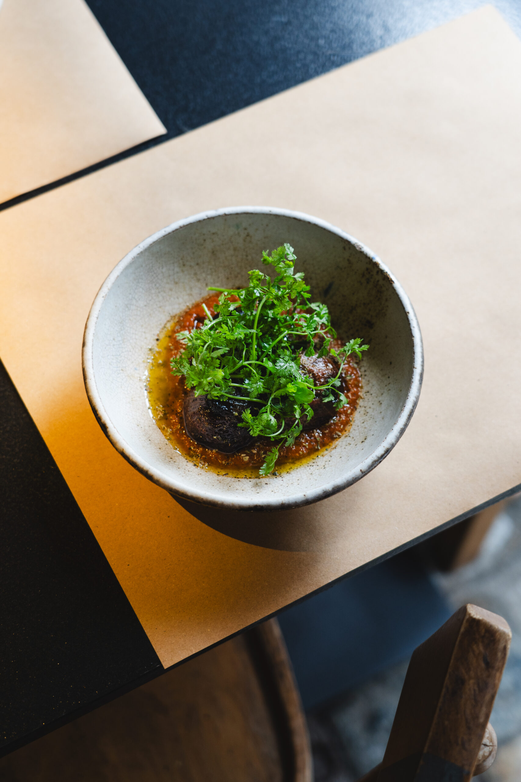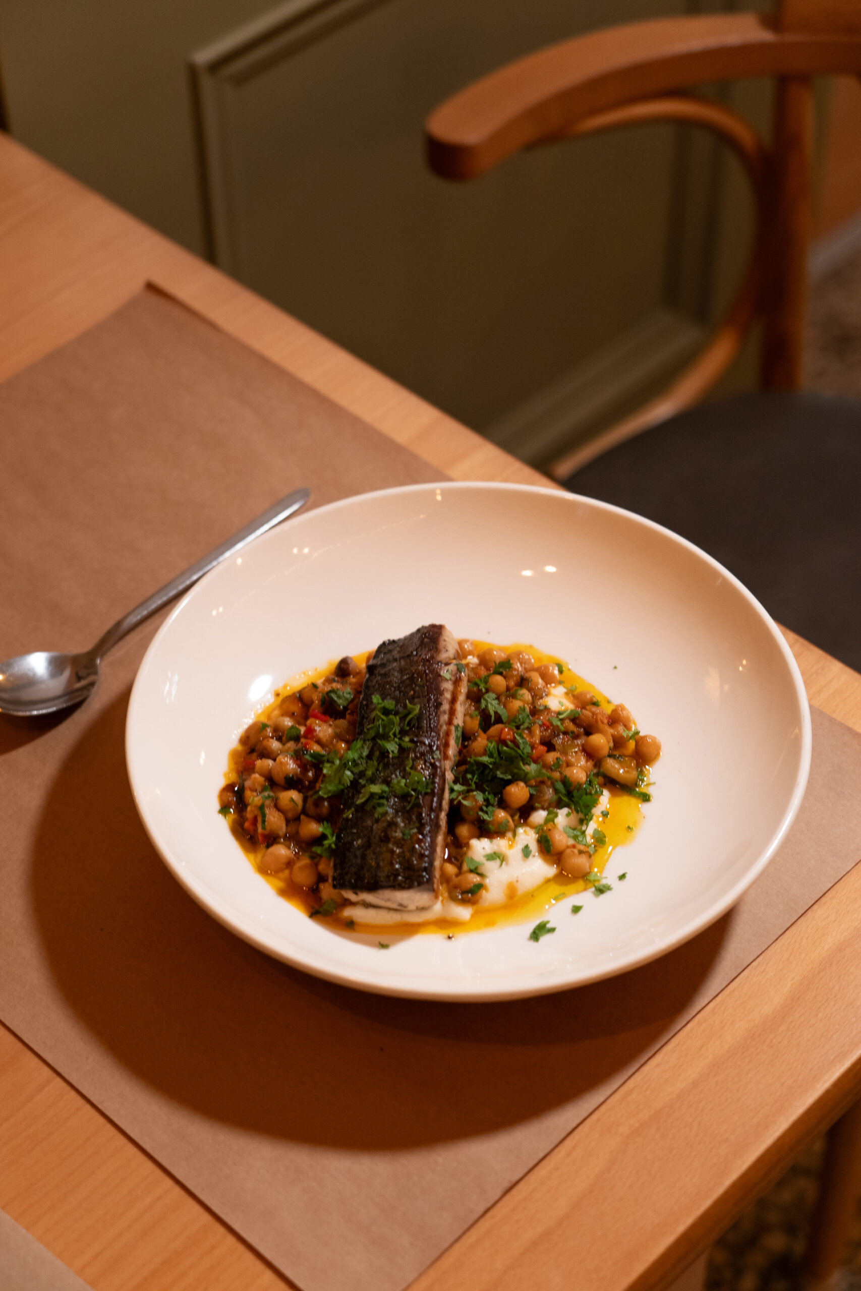Kομψότατο στη λιτότητά του bar restaurant, από τον πολυβραβευμένο Βασίλη Μουρατίδη, executive chef σεφ του πολυτελούς ξενοδοχείου «Danai Beach Resort» στη Σιθωνία και εκφραστή μιας συνταρακτικής fine dining γαστρονομίας και τον συνεργάτης του, τον ταλαντούχο σεφ Σοφοκλή Μαραγκουδάκη. Για το δικό τους εστιατόριο, οι σεφ επιλέγουν μια fine comfort μεσογειακή κουζίνα με επιρροές από Ιταλία, Γαλλία και Ελλάδα, μεγάλη προσοχή στις πρώτες ύλες από τοπικούς παραγωγούς της Θεσσαλονίκης και της Χαλκιδικής και μικρό κατάλογο που διευρύνεται με πιάτα ημέρας. Πιάτο εξαίσιο, οι παπαρδέλες με μπουτάκια πάπιας ραγού, κατσικίσιο τυρί και βούτυρο λευκής τρούφας. Το ψητό λάχανο, κρουστό και φίνο, με ντελικάτη, αρωματική κρέμα από πορτοκάλι, σάλτσα βουτύρου και τηγανητό kale γαρνίρεται όμορφα με χαβιάρι πέστροφας (σαν brick αλλά λίγο πιο μικρό).