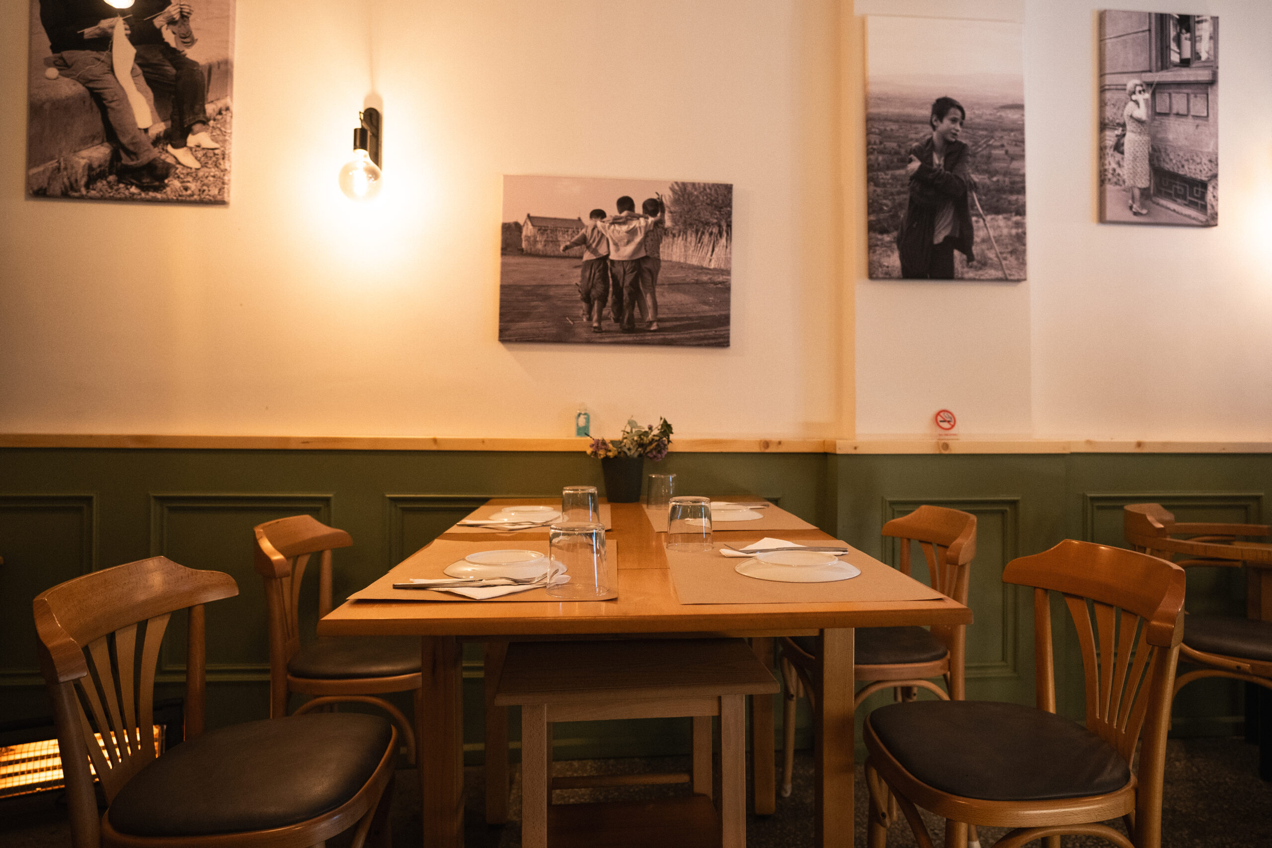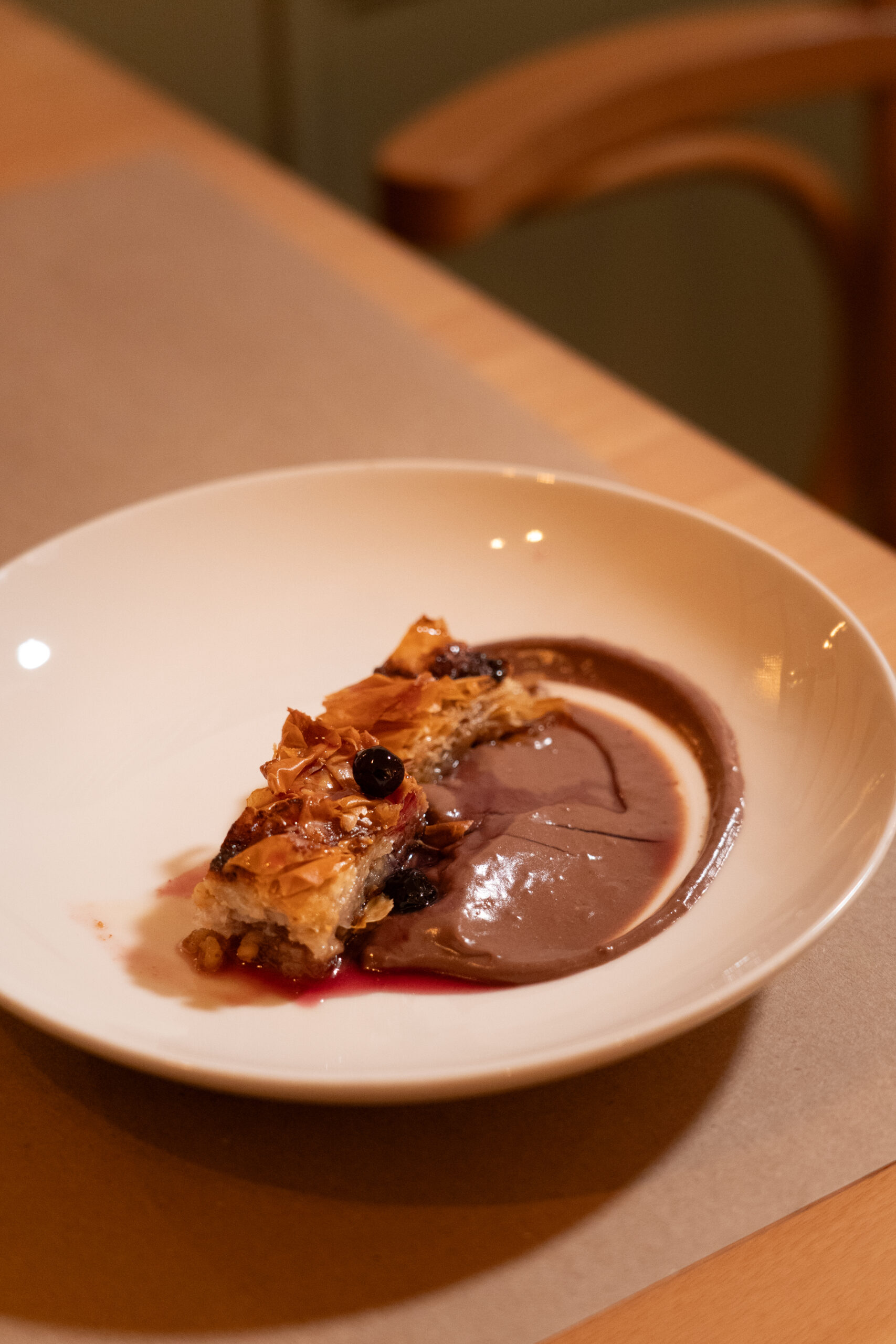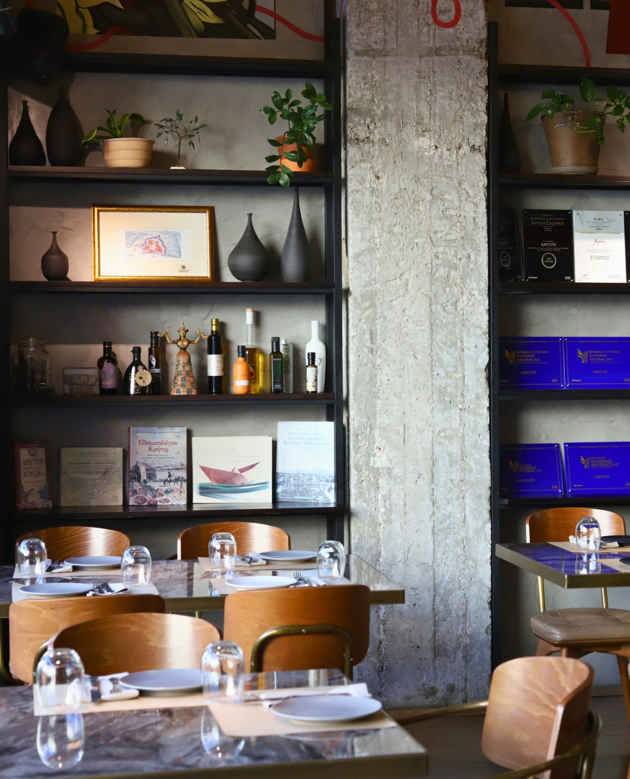 Όσον αφορά τα dumplings με γίδα στο ζωμό της συν teriyaki σως και γαρνιτούρα λαχανάκια Βρυξελλών και μανιτάρια σιμέτζι, στο ίδιο μοτίβο της «ελευθεριάκης» θα λέγαμε συνύπαρξης των υλικών, τα καταχωρήσαμε στη λίστα των πιάτων για τα οποία θα ξαναπάμε στο εστιατόριο. Ως επιδόρπιο, ένας περίεργος χειροποίητος μπακλαβάς με κρέμα σοκολάτας και γλυκό του κουταλιού μύρτιλο που σε κάνει να τρως άλλη μια και μετά άλλη μια μπουκιά ώσπου να καταλάβεις τι είναι αυτό που σε κάνει να σου αρέσει τόσο πολύ. Η κουζίνα είναι μικρή, το μωσαϊκό στο πάτωμα και τα ρετρό σερβίτσια εγκαλούν μια νοσταλγία για το παλιό και κάνουν ενδιαφέρουσα αντίστιξη με τις ανατρεπτικές γεύσεις. Λίγα τραπεζάκια έξω και ουρά για ένα τραπέζι μέσα.