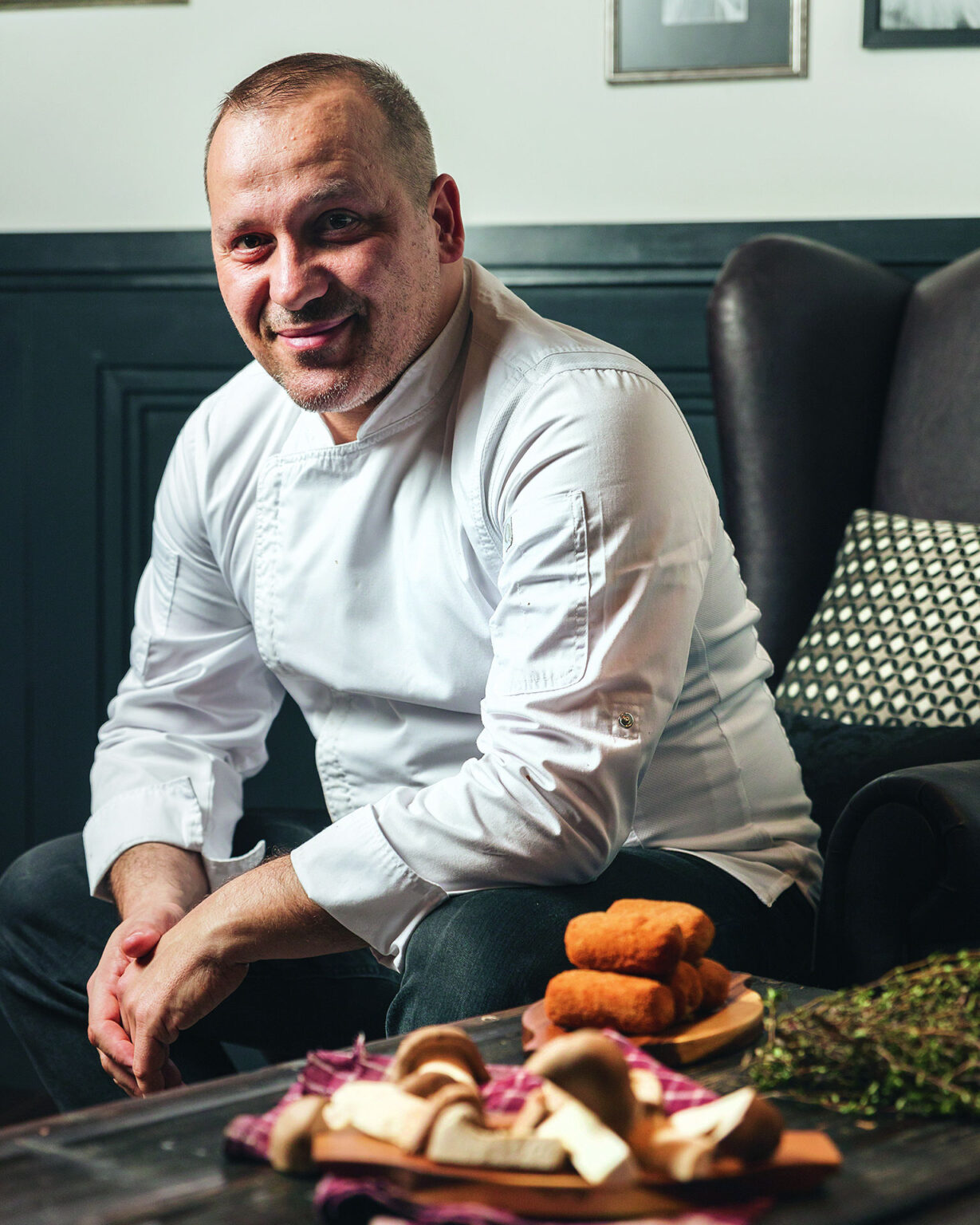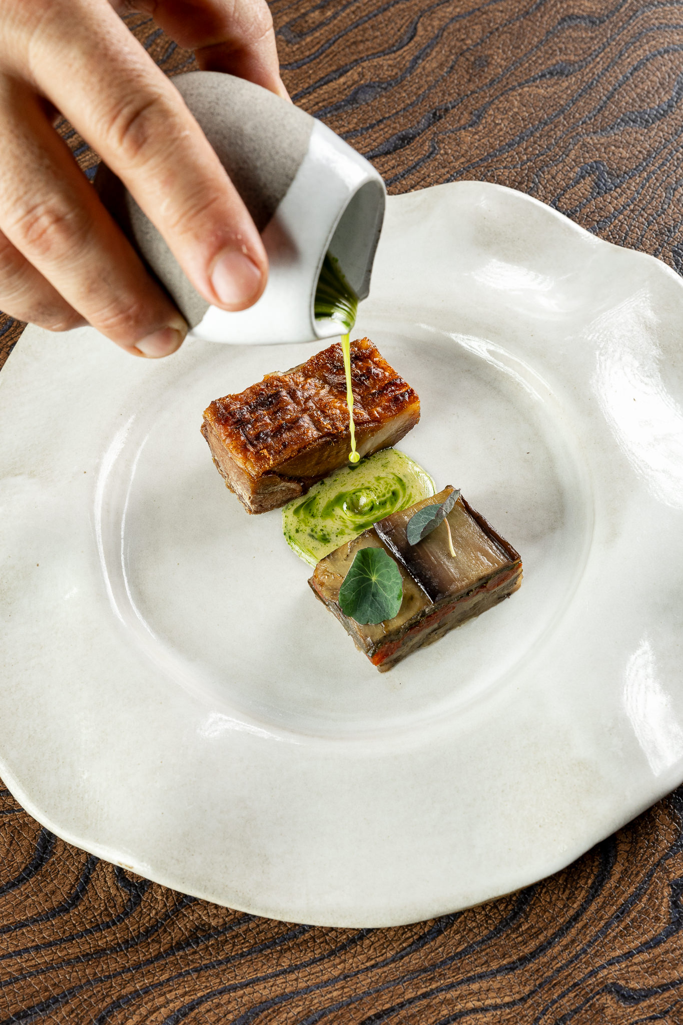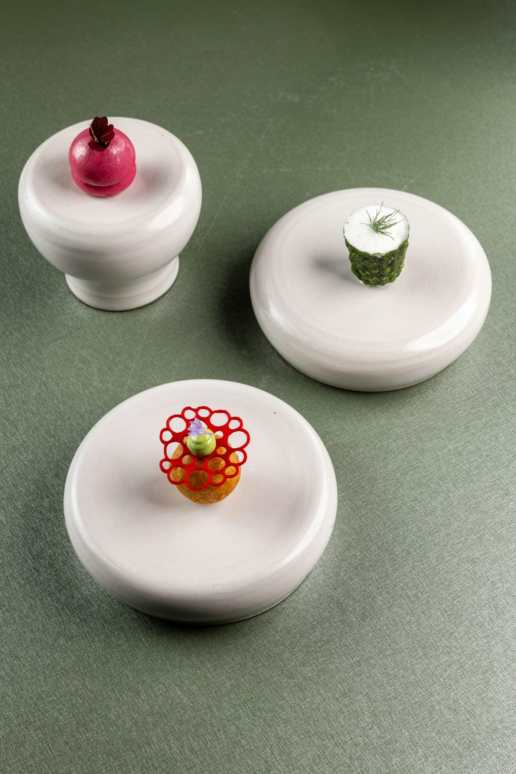 Ο σεφ αγαπάει να δουλεύει τα υλικά του σε διαφορετικές υφές επιτυγχάνοντας πολύ εκλεπτυσμένα αποτελέσματα. Και τα δύο πιάτα, κρατούν ακέραια τη σφριγηλότητα και τη βοτανικότητα της πρώτης ύλης. Η «Αγέλαστος Πέτρα» προτείνει ένα μακαρόν από παντζάρι γεμιστό με τυρί «Κυανόν» (το πρώτο μπλε ελληνικό τυρί από το τυροκομείο Αρβανίτης στη Μακεδονία) και κρέμα από κόκκινα φρούτα. Απροσδόκητος συνδυασμός, όπου παρεΐζουν όμορφα, η γλυκιά, η αλμυρή και η όξινη γεύση.