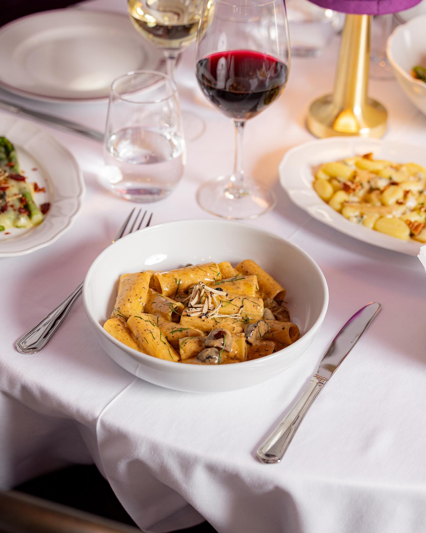 Τα ριγκατόν, με φρέσκια τρούφα και ποικιλία μανιταριών, έχουν πλούσια γεύση και διακριτική παρουσία της τρούφας. Εξαιρετικό πιάτο, τα Νιόκι parisienne (από τον βραδινό κατάλογο) με αχλάδι, ροκφόρ και σος με κρέμα γάλακτος. Πιάτο που δεν τσιγκουνεύεται σε γεύσεις και υφές. Η Εntrecote Sauce de Paris διεκδίκησε και πήρε την πρωταγωνιστική θέση. Ήρθε ζουμερή και λαχταριστή με sauce Café de Paris και ψητά σπαράγγια, τόσο άψογα και νόστιμα, που απέδειξαν, για άλλη μια φορά, ότι η λεπτομέρεια κάνει τη διαφορά. Εντυπωσιακό το mille feuille-υπερπαραγωγή, με γαρνιτούρα καραμέλα βουτύρου, αλλά σίγουρα προτιμάμε τη φίνα crème brûlée με βανίλια Μαδαγασκάρης και βατόμουρα για το τέλος ενός τόσο μεγαλοπρεπούς γεύματος.