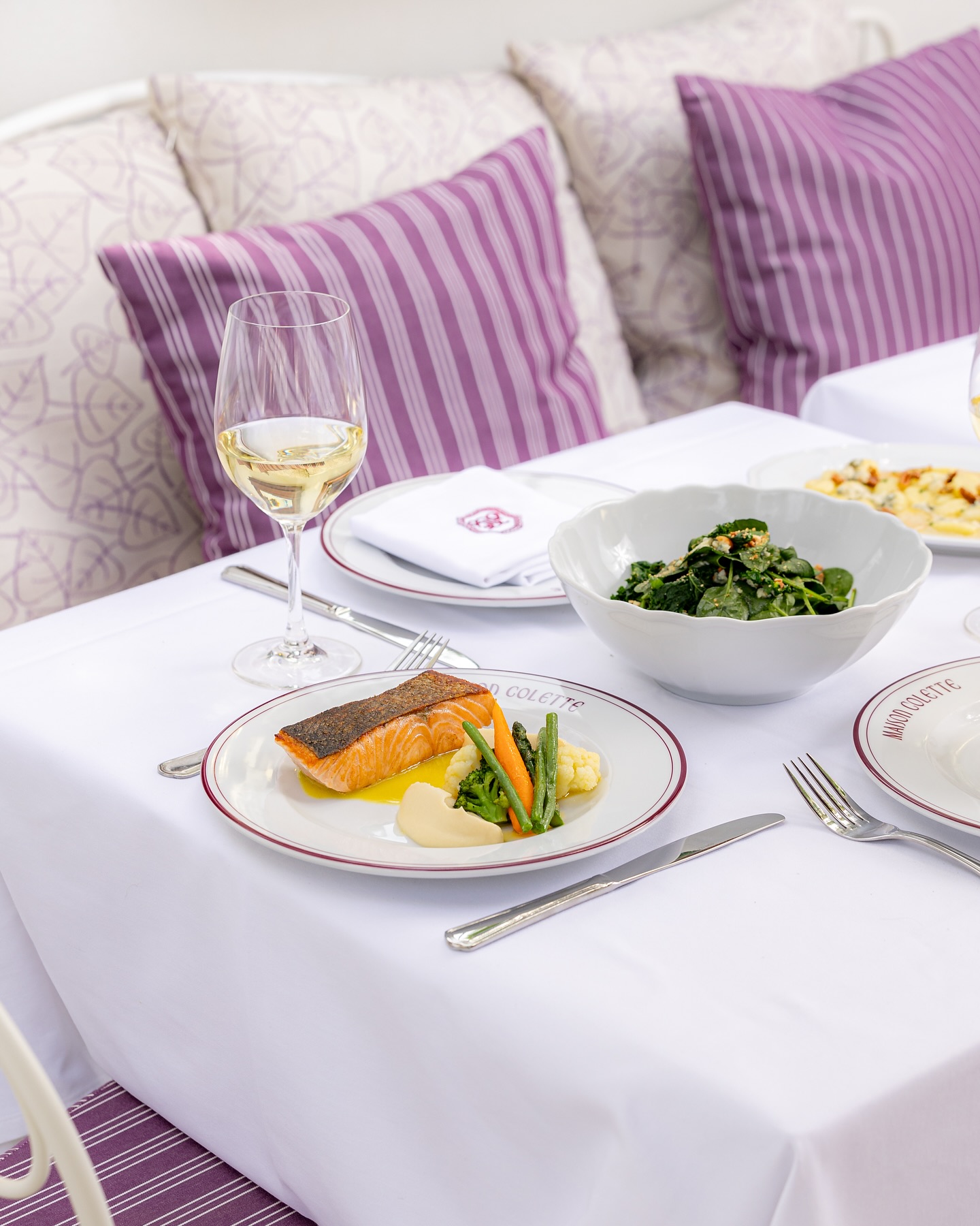 Η δράση στο εστιατόριο ξεκινάει από το πρωί με ξεχωριστή κάρτα για το breakfast, συνεχίζει με κατάλογο πιο απλό για το μεσημέρι και προχωράει σε πιο σύνθετες προτάσεις για το βράδυ. Executive Chef του ομίλου είναι ο Δημήτρης Σταμούδης και pastry chef ο αδελφός του Θανάσης Σταμούδης. Chef de cuisine στο La Maison Colette, o Γιώργος Καλλίθρακας. Το μενού προσφέρει πολλά από τα κλασικά της γαλλικής κουζίνας, συν ιταλικής έμπνευσης πιάτα, κυρίως πάστα, και ορισμένες εμπνευσμένες σαλάτες. Wine list με περισσότερες από 100 ετικέτες από τον διεθνή αμπελώνα, σαμπάνιες, λίστα cocktails και ανάμεσά τους cocktails σαμπάνιας Ξεκινήσαμε με τη σαλάτα Roquefort με σπανάκι, kale (λαχανίδα), comfit μανταρινιού, ψητά κάσιους και βινεγκρέτ λεμονιού, μια ευχάριστη παρέα του αλμυρού και του όξινου και συνεχίσαμε με το ενδιαφέρον μοσχαρίσιο ταρτάρ με κρεμμυδάκια, μουστάρδα ντιζόν και κάπαρη. To ψητό καμαμπέρ (camembert au four) με μαρμελάδα βατόμουρο και φιστίκι, έχει ωραία λεπτή κρουστίτσα και το Croque Madame, το διάσημο γαλλικό σάντουϊτς και γεύμα από μόνο του, καθώς συνοδεύεται από ανάμεικτη σαλάτα είναι βόμβα νοστιμιάς με την καλοφτιαγμένη sauce Mornay (μια μπεσαμέλ εμπλουτισμένη με τυρί) και ένα φρέσκο βιολογικό αυγό.