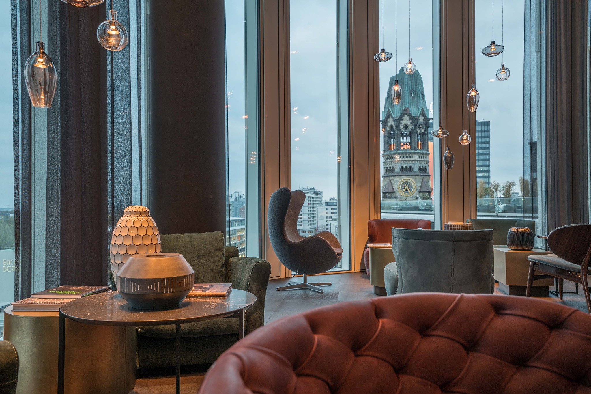 Πιείτε το cocktail σας είτε στο ζεστό, γκρίζων τόνων εσωτερικό, είτε στη βεράντα ατενίζοντας τον ήλιο να δύει πάνω από το απέραντο πάρκο Tiergarten, κάνοντας τη στήλη Siegessäule να λάμπει ακόμη περισσότερο. Όσο για το τοπόσημο της περιοχής, τη μισογκρεμισμένη εκκλησία Kaiser-Wilhelm-Gedächtniskirche που οι Βερολινέζοι αποκαλούν χαϊδευτικά «Κούφιο δόντι», βρίσκεται τόσο κοντά που κυριολεκτικά θα νομίζετε ότι μπορείτε να την αγγίξετε.