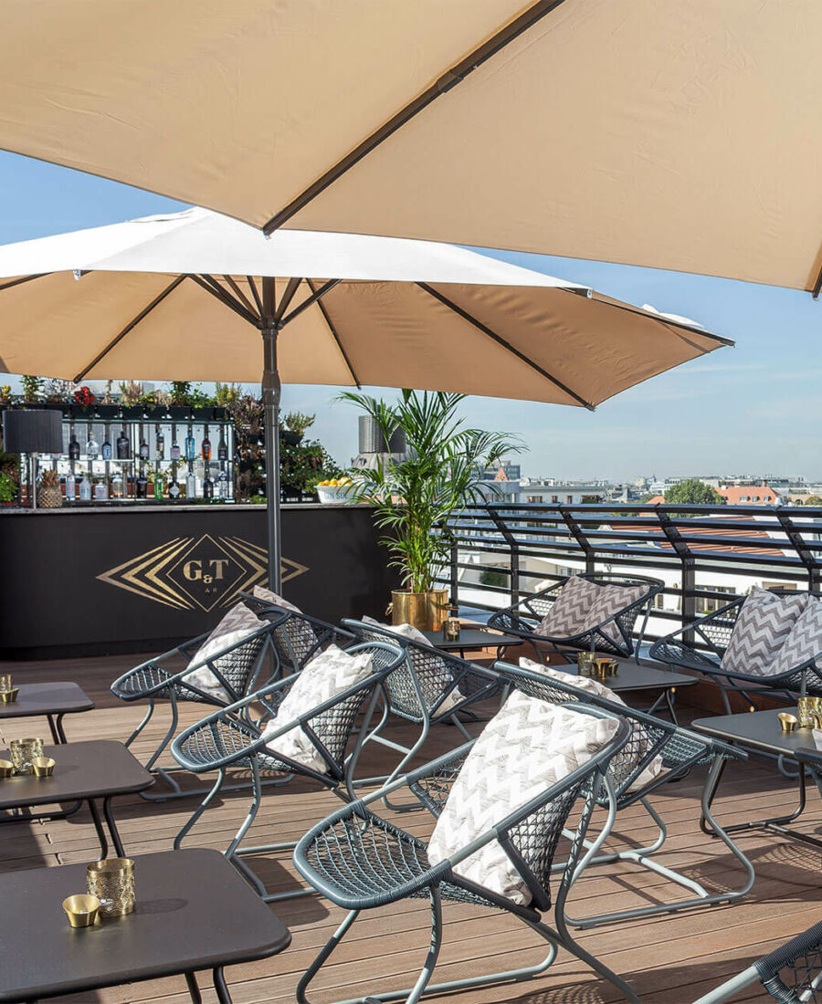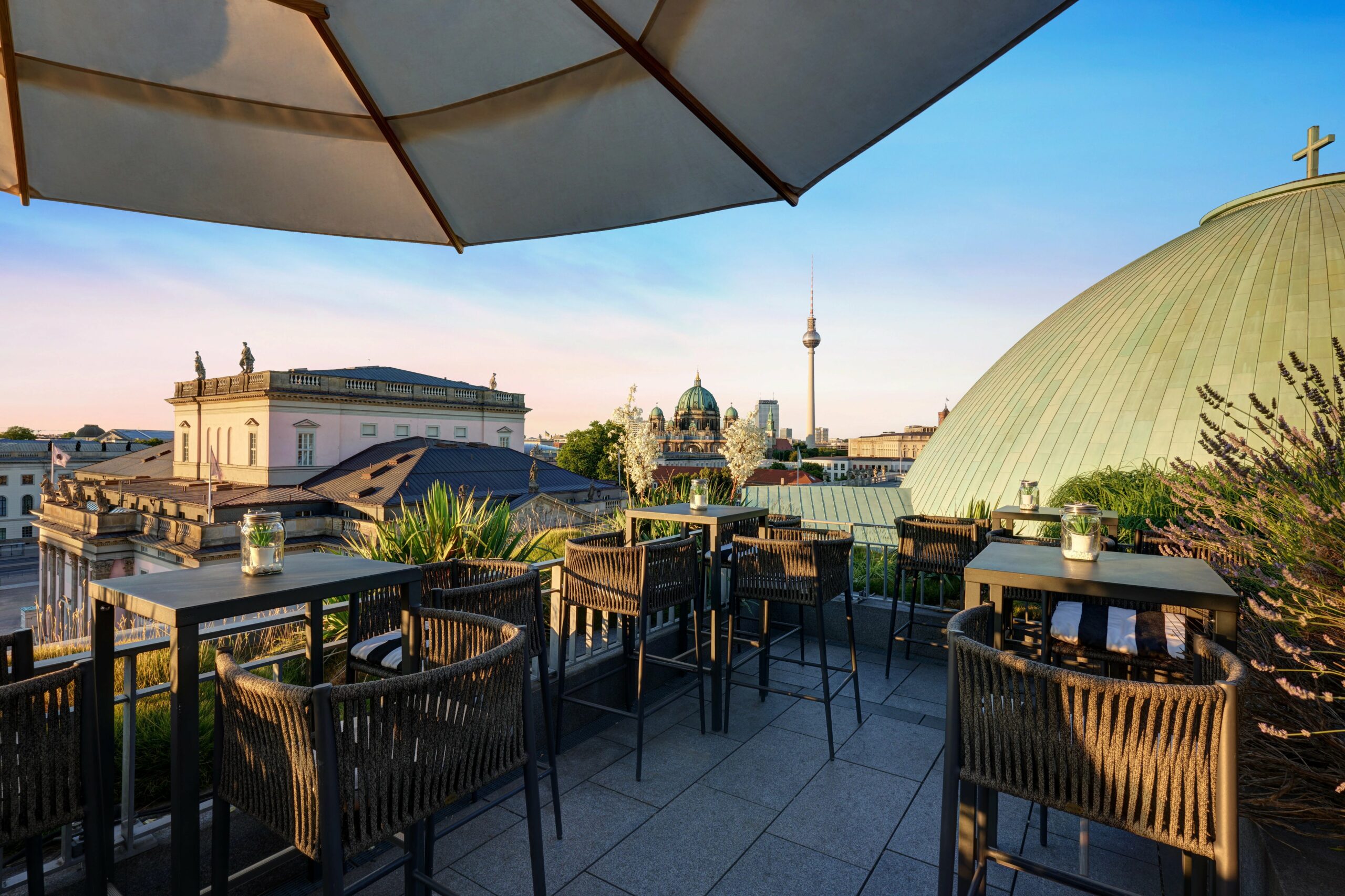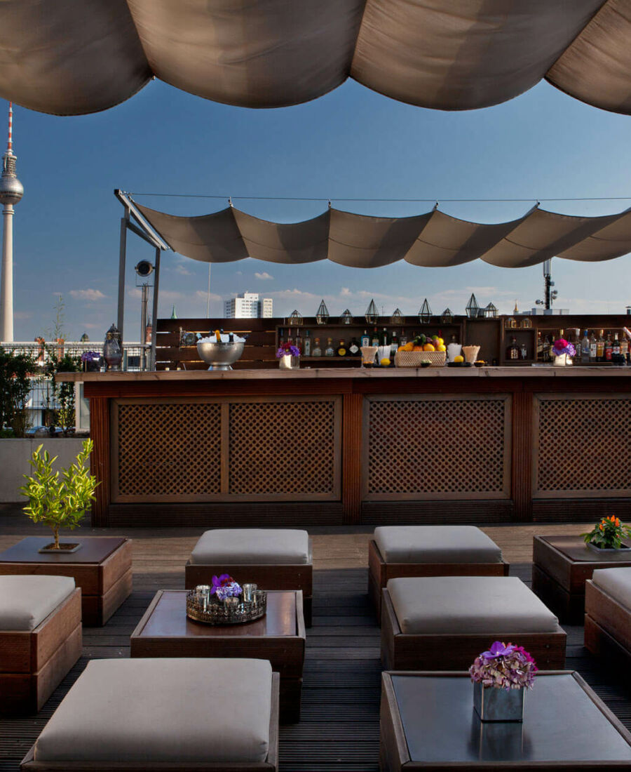 Τα cocktail σαμπάνιας ρέουν άφθονα και στην ταράτσα του πολυτελούς Hotel de Rome και ταιριάζουν πολύ, τόσο με το εκλεπτυσμένο περιβάλλον όσο και με τη συγκλονιστική θέα στην καρδιά του ιστορικού κέντρου της πόλης. Η ευρύχωρη ταράτσα με τα Dedon έπιπλα διασκορπισμένα ανάμεσα σε λεβάντες που μοσχοβολούν και εξωτικά μπαμπού, σου δίνει την αίσθηση ότι κυριολεκτικά να μπορείς τα αγγίξεις τα αξιοθέατα της Babelplatz όπου βρίσκεται το De Rome, ένα από τα κορυφαία ξενοδοχεία του Βερολίνου.