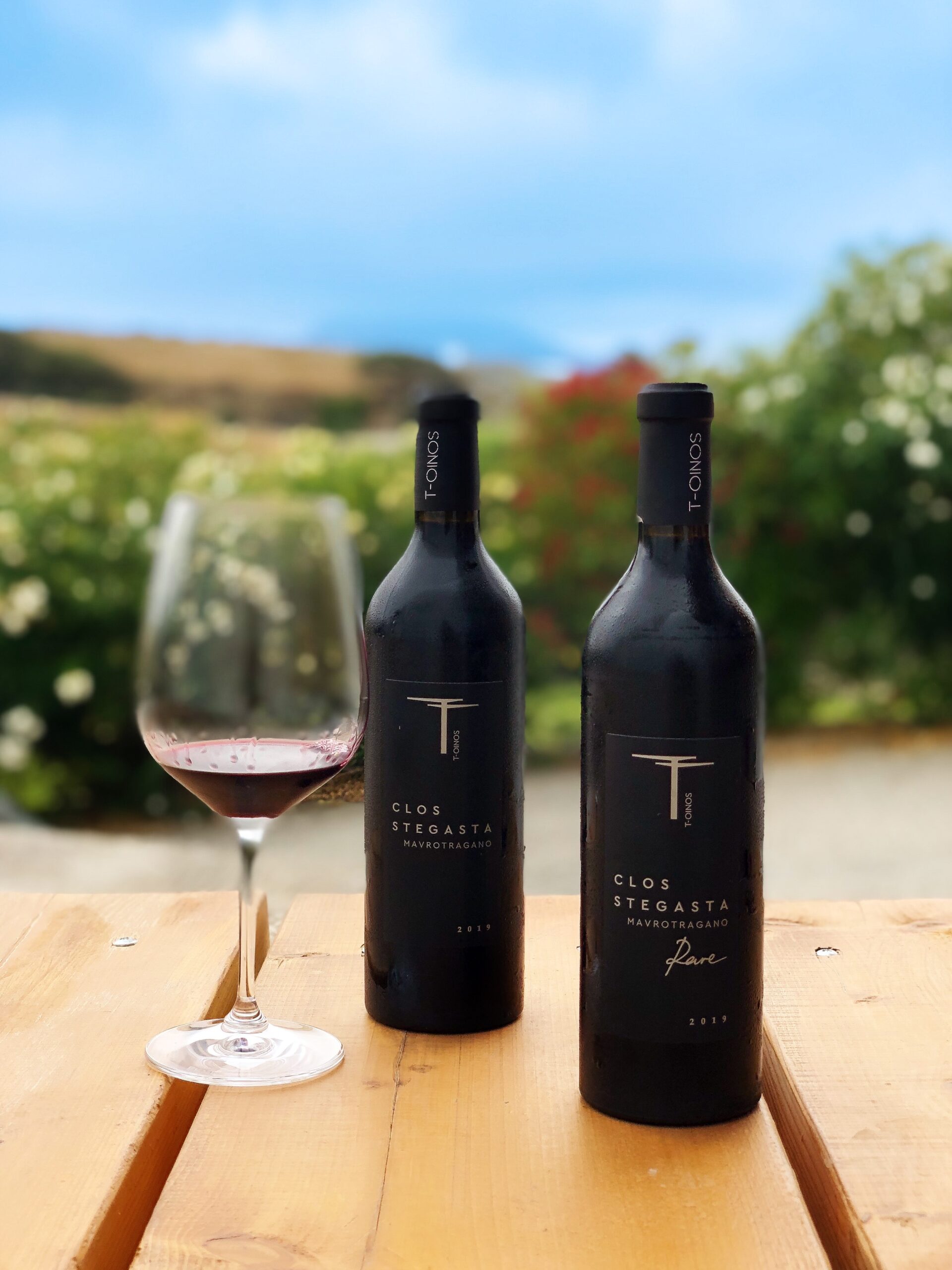 Η κατεύθυνση των γραμμών των φυτών είναι βορινή, όπως και οι άνεμοι του νησιού, με στόχο να περνάει ο αέρας ανάμεσά τους χωρίς να τραυματίζει τους βλαστούς. Όλα τα αμπέλια είναι βιολογικά ενώ το οινοποιείο εφαρμόζει και στοιχεία βιοδυναμικής καλλιέργειας, όπως η χλωρή λίπανση – φυτεύουν μεταξύ των γραμμών κριθάρι και βίκο το φθινόπωρο και, μετά τις πρώτες ζέστες, τα ανακατεύουν στο έδαφος, εμπλουτίζοντάς το φυσικά σε άζωτο. Το T-Oinos προσφέρει πέντε ετικέτες εξαίσιων κρασιών με στιβαρό χαρακτήρα και ξεκάθαρη ταυτότητα. Εκτός από το Mavrose, ένα ροζέ κρασί με απαλά αρώματα κόκκινων φρούτων φτιαγμένο από ποικιλίες Αυγουστιάτη και Μαυροτράγανου από το αμπέλι του Αγίου Δημητρίου, οι υπόλοιπες 4 ετικέτες είναι μονοποικιλιακές και συμπεριλαμβάνουν το Clos Stegasta Asyrtiko, το Clos Stegasta Mavrotragano και τις αντίστοιχες Rare εκφράσεις τους. Η ονομασία Clos Stegasta προέρχεται από το περιτοιχισμένο αμπέλι (Clos) και τα Στεγαστά, την περιοχή όπου βρίσκονται τα αμπέλια. Το Clos Stegasta Asyrtiko Rare είναι ένα κρασί με γεμάτο σώμα και αρώματα από ροδάκινο, ανανά και άργιλο. Προέρχεται από συγκεκριμένο αμπελοτόπι στα Στεγαστά, του οποίου το έδαφος έχει περισσότερο πηλό. Η, δε, παλαίωση του γίνεται σε δεξαμενή και κιούπια, ο συνδυασμός των οποίων προσφέρει στο κρασί πολυπλοκότητα και καθαρότητα φρούτου. Το Clos Stegasta Mavrotragano Rare, προέρχεται από αμπελοτόπια του Ράσωνα. Παλαιώνει για έναν περίπου χρόνο σε γαλλικά δρύινα βαρέλια και είναι ένα κρασί σύνθετο αλλά συνάμα απόλυτα ισορροπημένο. Κυριαρχούν τα μαύρα φρούτα, όπως βύσσινο και μύρτιλα, σε συνδυασμό με νότες σοκολάτας και βανίλιας. Στο στόμα είναι ιδιαιτέρως πλούσιο με έντονες αλλά ραφινάτες τανίνες, γεγονός που το κάνει να πίνεται εξαίσια τώρα καθώς και ύστερα από παλαίωση. Από τον Μάρτιο μέχρι τον Οκτώβρη, το οινοποιείο προσφέρει ξενάγηση στους αμπελώνες του και δυνατότητα δοκιμής των εκπληκτικών κρασιών του. Το T-Oinos έχει, απόλυτα άξια, γνωρίσει μεγάλη επιτυχία. Συνεχίζει να αναπτύσσεται, στοχεύοντας να φτάσει τα 170 στρέμματα μέχρι το 2025, και σχεδιάζει να μεταφερθεί σύντομα σε έναν ολοκαίνουργιο χώρο έξω από τον Φαλατάδο.