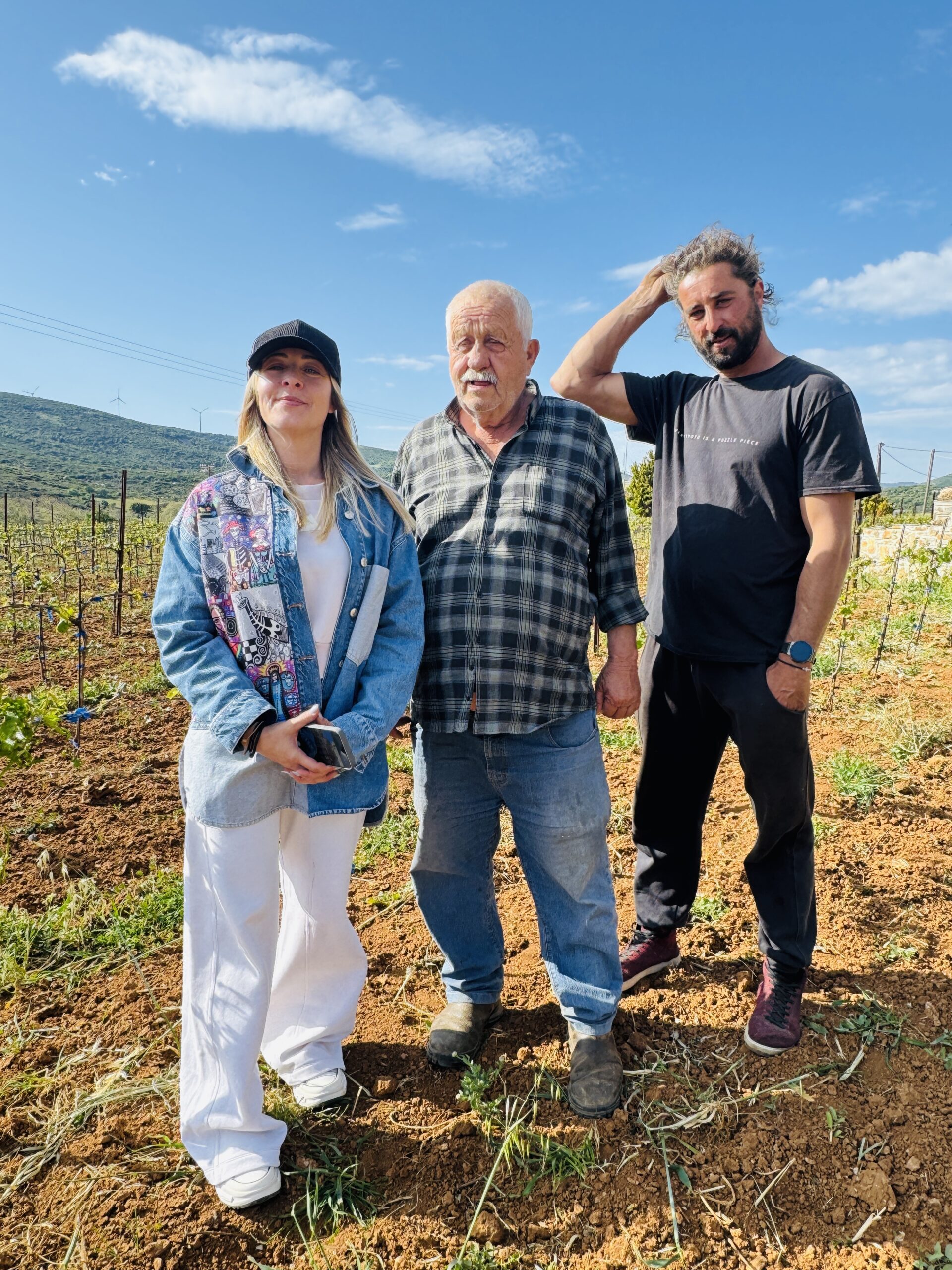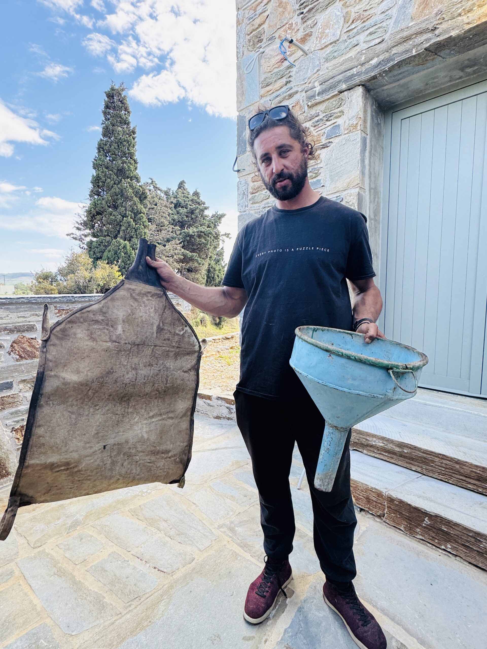 Φτάσαμε την ώρα που ο ήλιος γλύκανε και φώτιζε μαγικά τους καινούριους βλαστούς του αμπελιού, που φυτεύτηκε δίπλα στο οινοποιείο. Ο κύριος Γιάννης, ο πατέρας της οικογένειας, μας υποδέχθηκε και άρχισε την ξενάγηση από το πατητήρι. Οι κουβέντες του, κανονικό ταξίδι σε εικόνες αλλά και λέξεις μιας άλλης εποχής. «Τα ζώα έφερναν εδώ τις κόφες (κοφίνια) φορτωμένες με σταφύλια. Τα άδειαζαν και τα πατάγαμε, ώστε να ξεμουστιάσουν καλά. Ο μούστος συγκεντρωνόταν σε αυτό το πιθουλάκι (λινός) και με τη σέγκια (μεταλλικός κάδος που χωρούσε 8 οκάδες μούστο) τον τραβούσαμε πάνω.