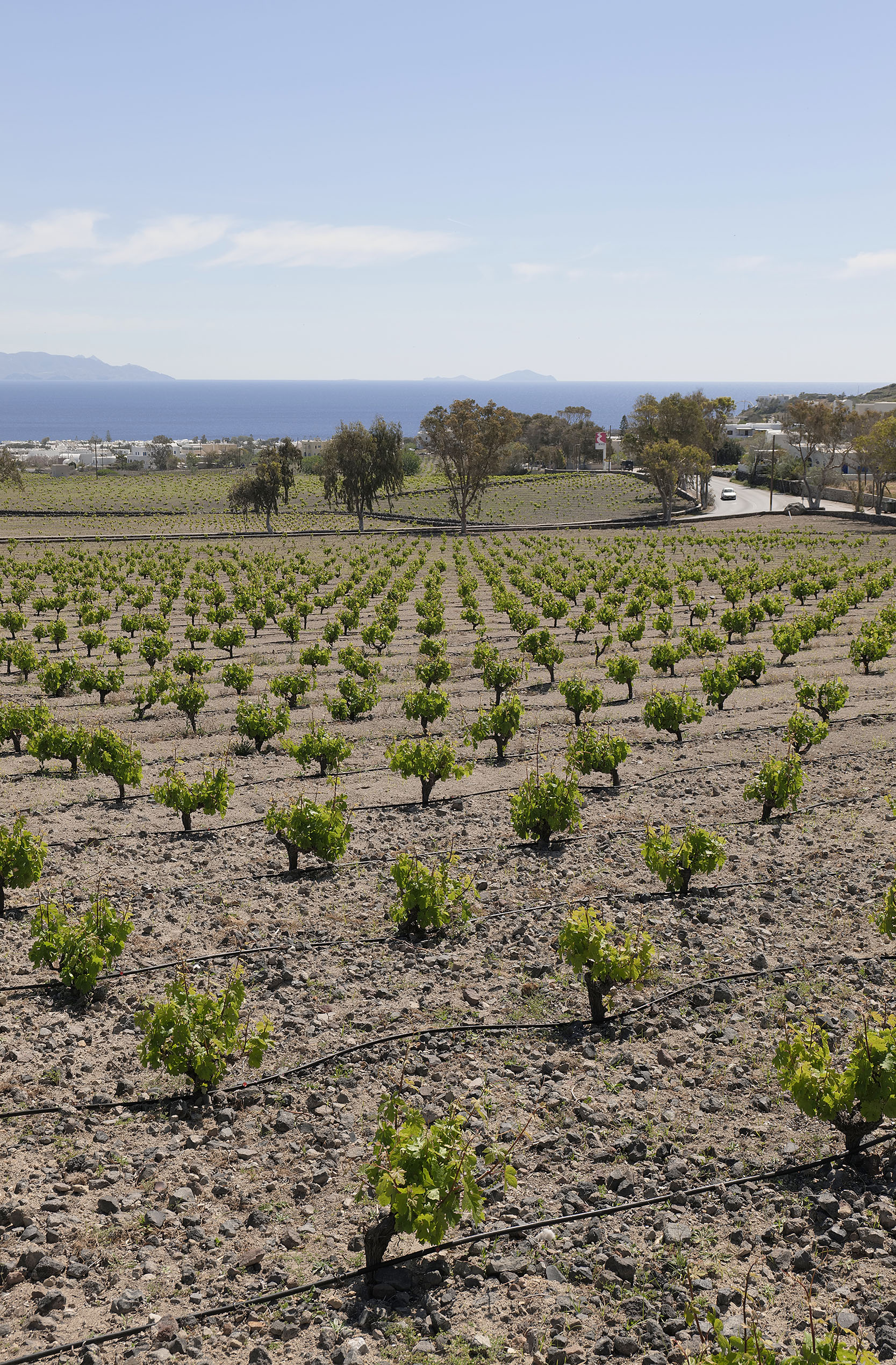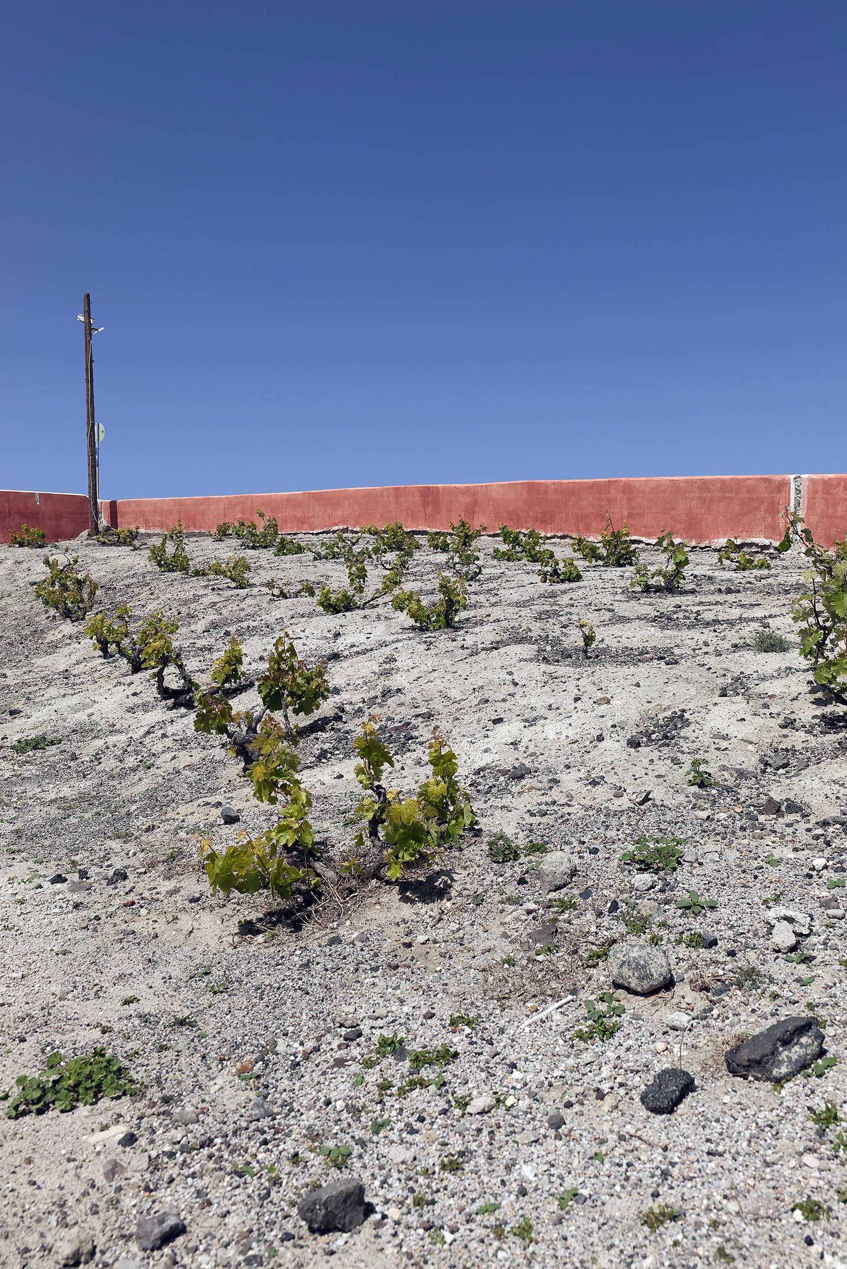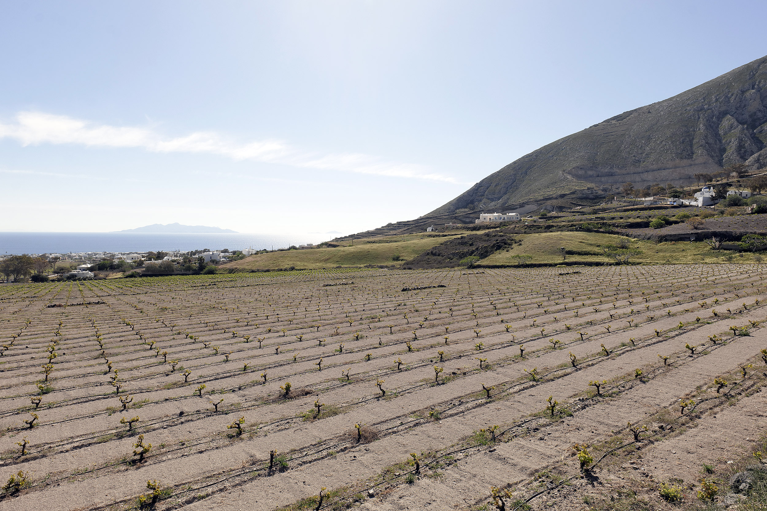 Η θέα από τις καμάρες στο προαύλιο του κτιρίου προς την ανατολή, γεμίζει την εικόνα με ευθείες γραμμές τέλειων φυτών, το φως του πρωινού ήλιου να καίει την επιφάνεια της θάλασσας και την αχνή σιλουέτα της Ανάφης στο βάθος. Ο Δημήτρης μου εξηγεί με απλό και εντελώς κατανοητό τρόπο το σύστημα της «κουλούρας», του φυτού που αναπτύσσεται στρογγυλά επάνω στο ηφαιστειακό χώμα προστατεύοντας τον καρπό μέσα της από τον ήλιο, τον υπερβολικό, μερικές φορές, άνεμο αλλά διατηρώντας και μια υγρασία μέσα στον κλειστό χώρο της μετά το φαινόμενο της «ανεδοσιάς», της φυσικής υγρασίας.