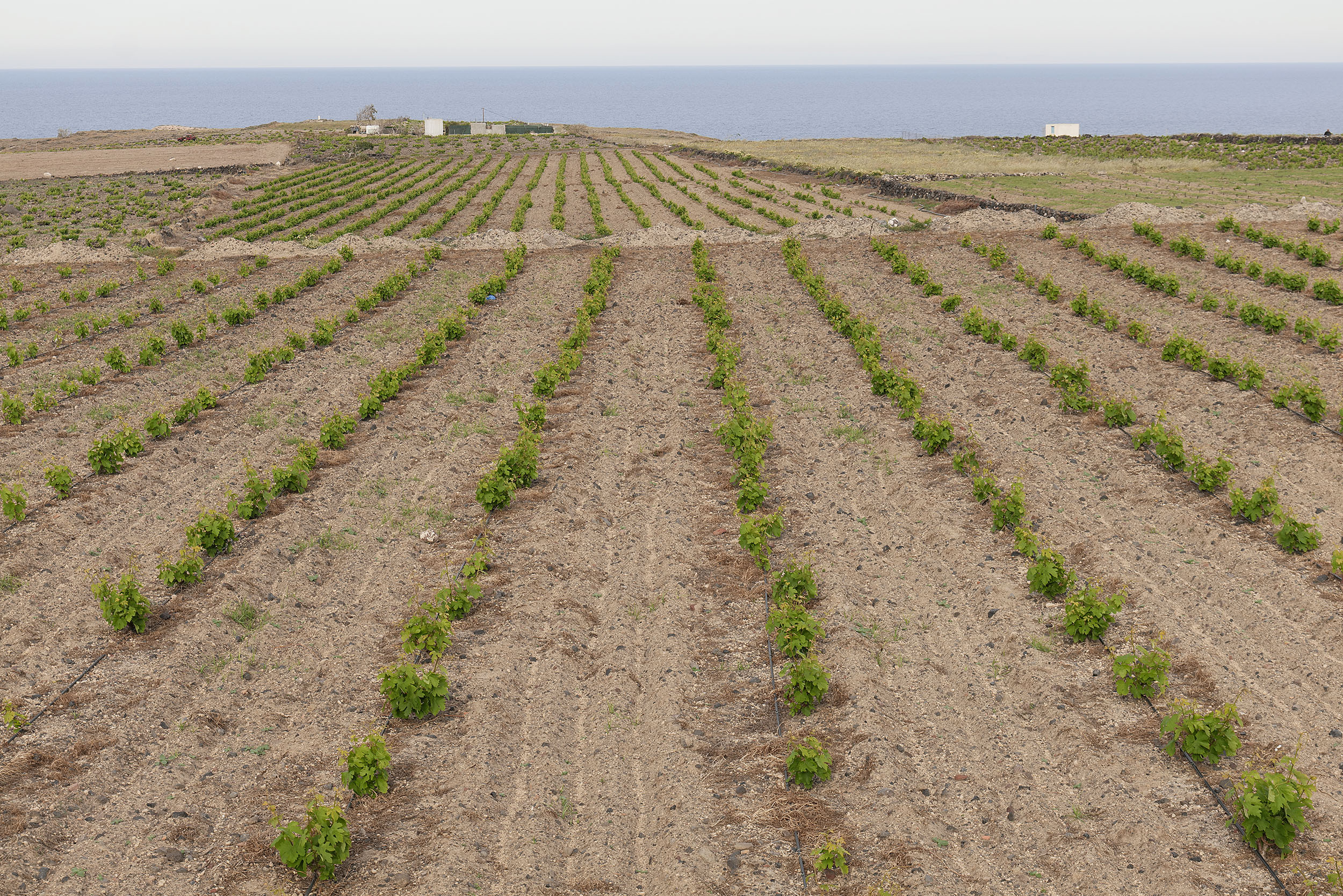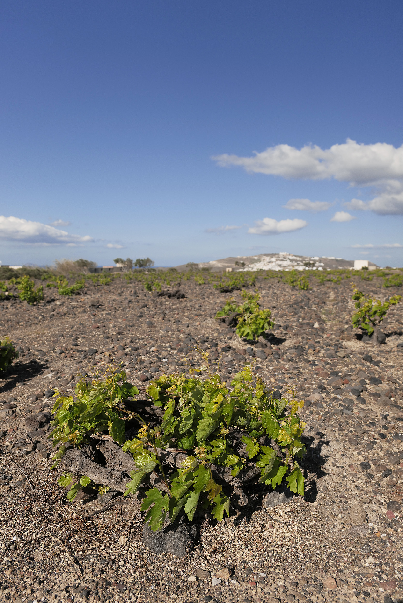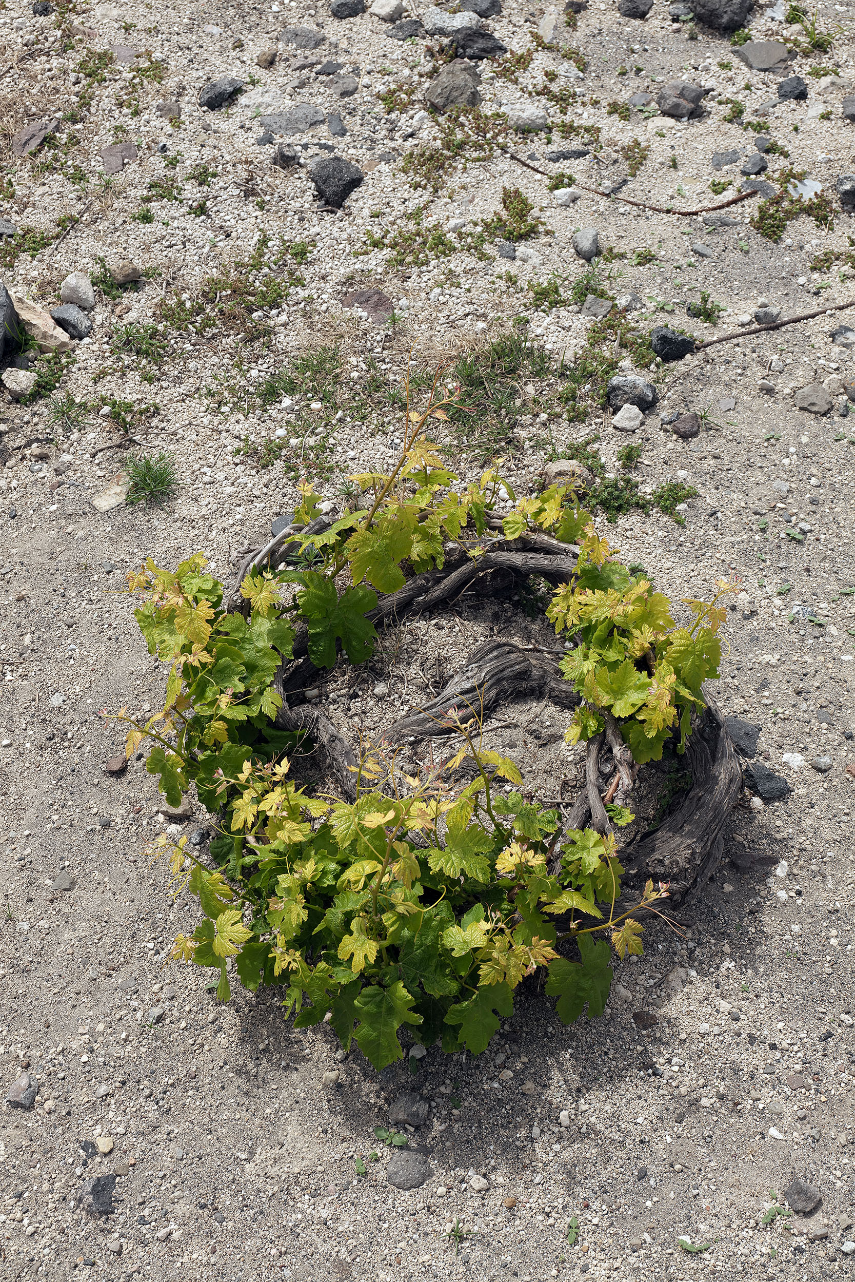 Η θέα από τις καμάρες στο προαύλιο του κτιρίου προς την ανατολή, γεμίζει την εικόνα με ευθείες γραμμές τέλειων φυτών, το φως του πρωινού ήλιου να καίει την επιφάνεια της θάλασσας και την αχνή σιλουέτα της Ανάφης στο βάθος. Ο Δημήτρης μου εξηγεί με απλό και εντελώς κατανοητό τρόπο το σύστημα της «κουλούρας», του φυτού που αναπτύσσεται στρογγυλά επάνω στο ηφαιστειακό χώμα προστατεύοντας τον καρπό μέσα της από τον ήλιο, τον υπερβολικό, μερικές φορές, άνεμο αλλά διατηρώντας και μια υγρασία μέσα στον κλειστό χώρο της μετά το φαινόμενο της «ανεδοσιάς», της φυσικής υγρασίας.