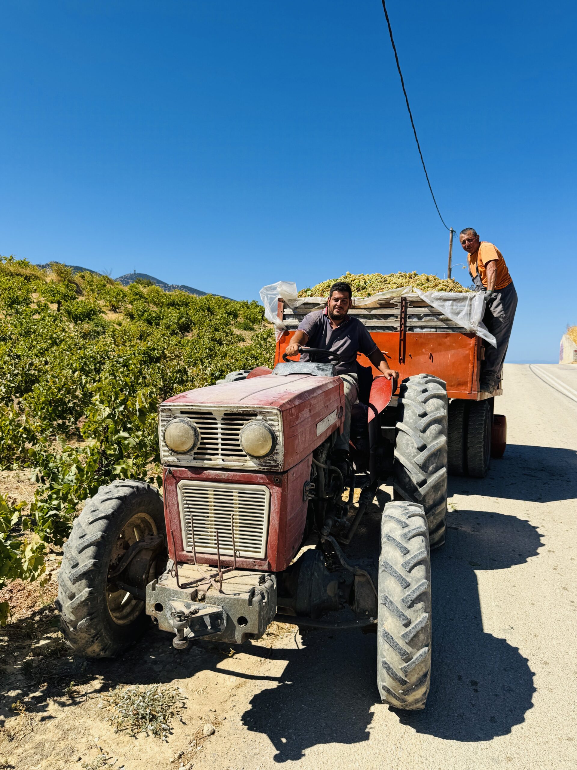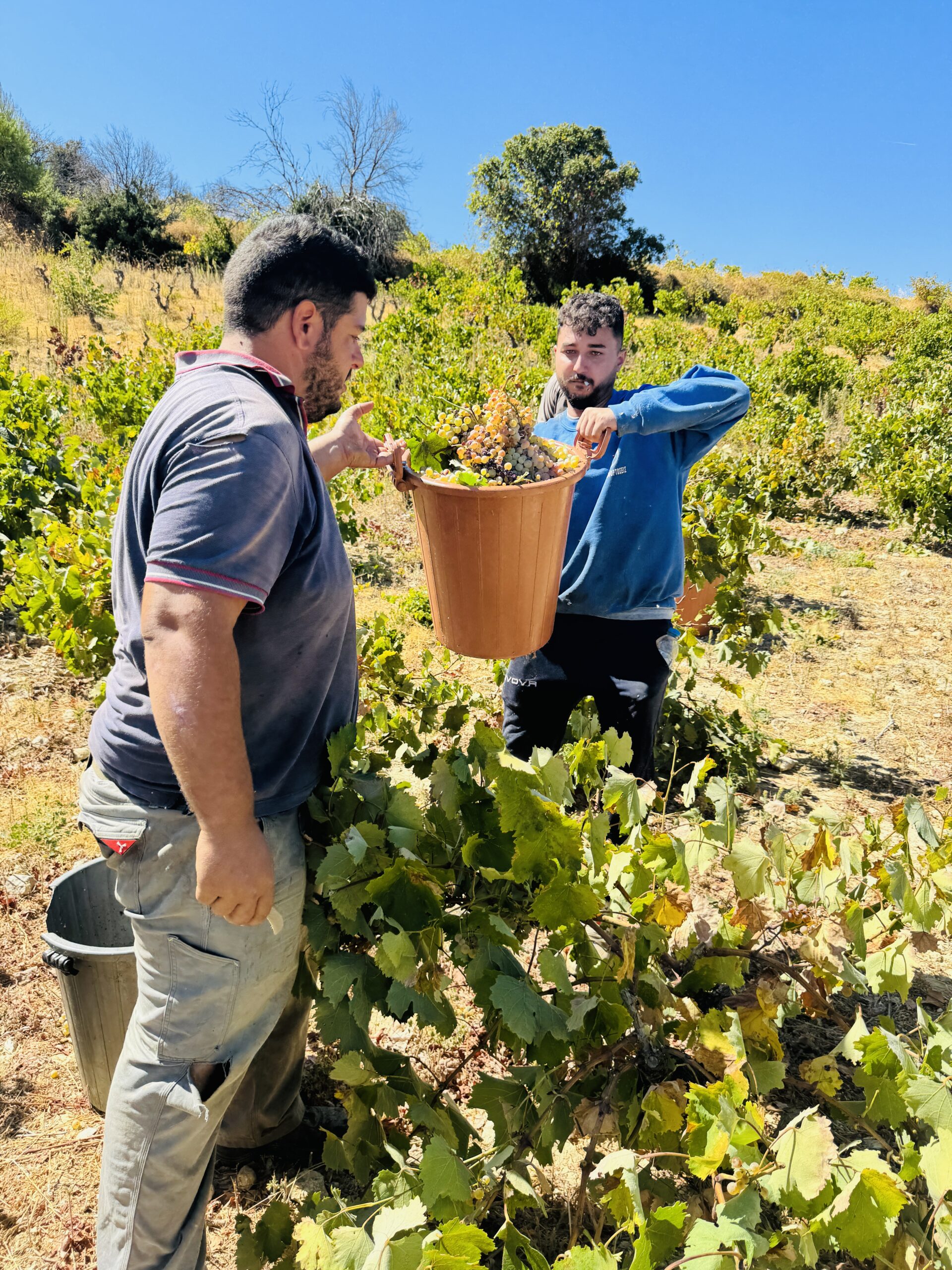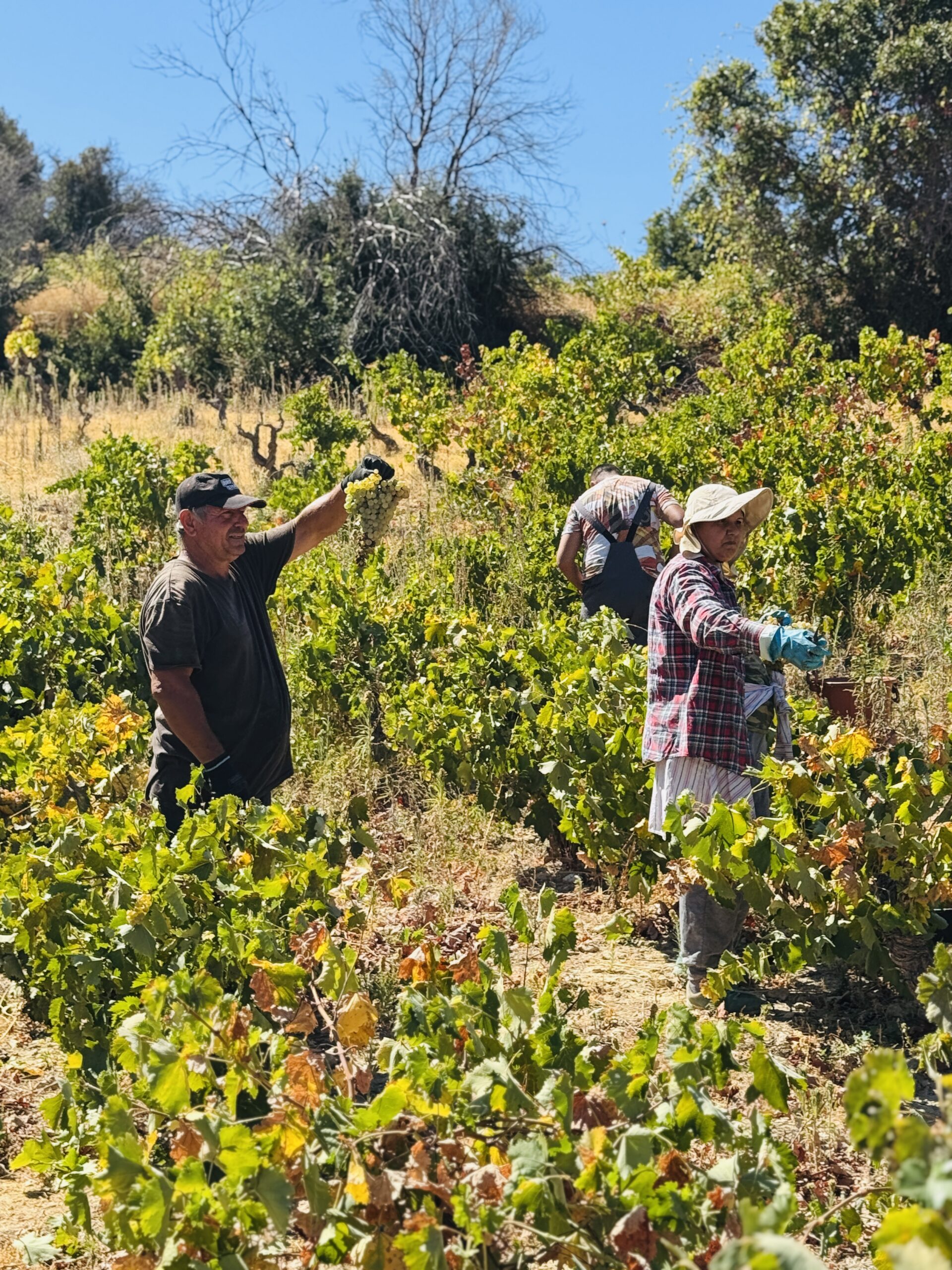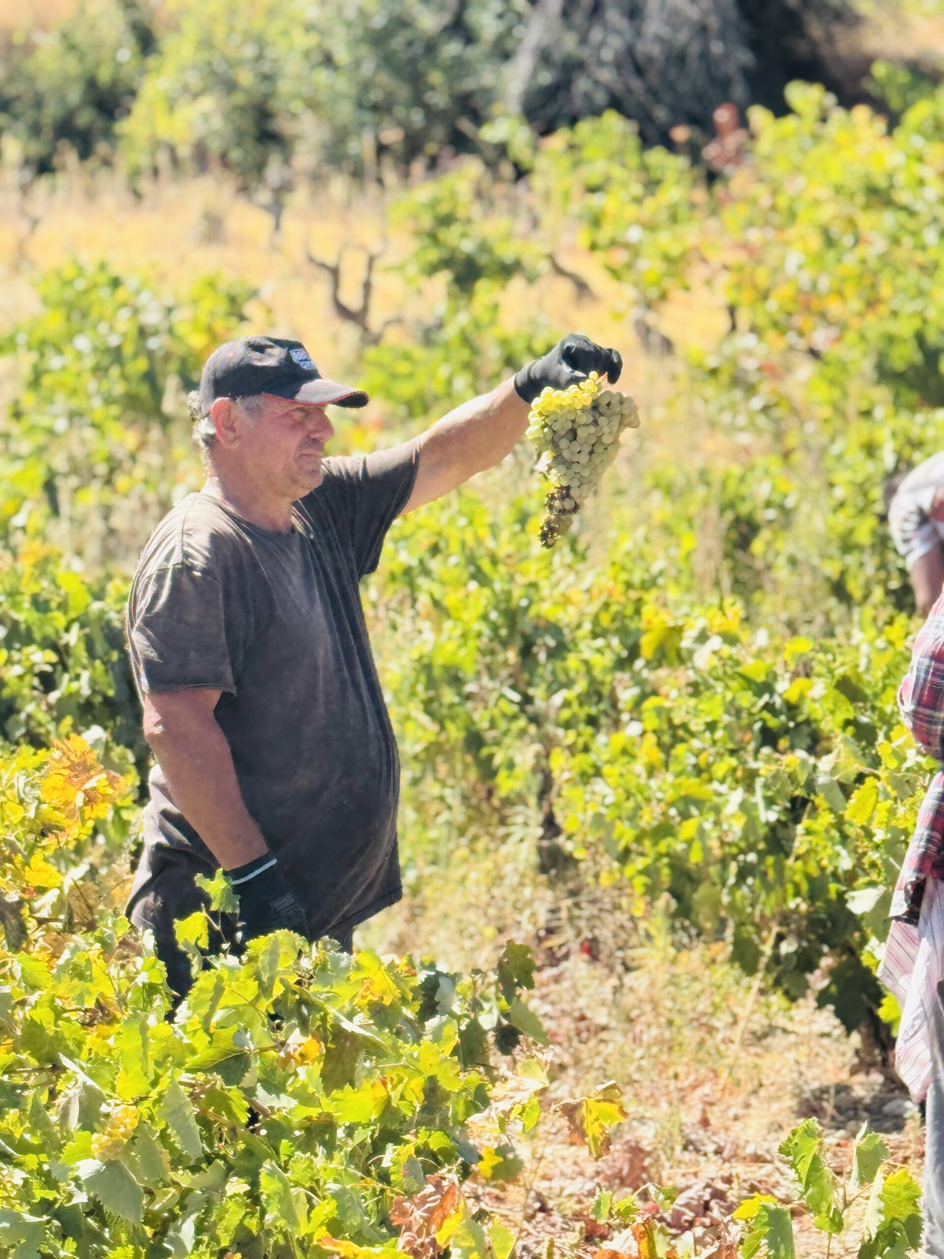 Μια κυρία με μαντίλα στο κεφάλι, για να προστατεύεται από τον ήλιο, μου προσφέρει ένα τσαμπί φρεσκοκομμένο σταφύλι. «Δοκιμάστε», λέει με ζεστό χαμόγελο. «Αυτό είναι το φετινό μας χρυσάφι». Η γεύση είναι απίστευτη, συμπυκνωμένη, γεμάτη ήλιο και ιστορία.