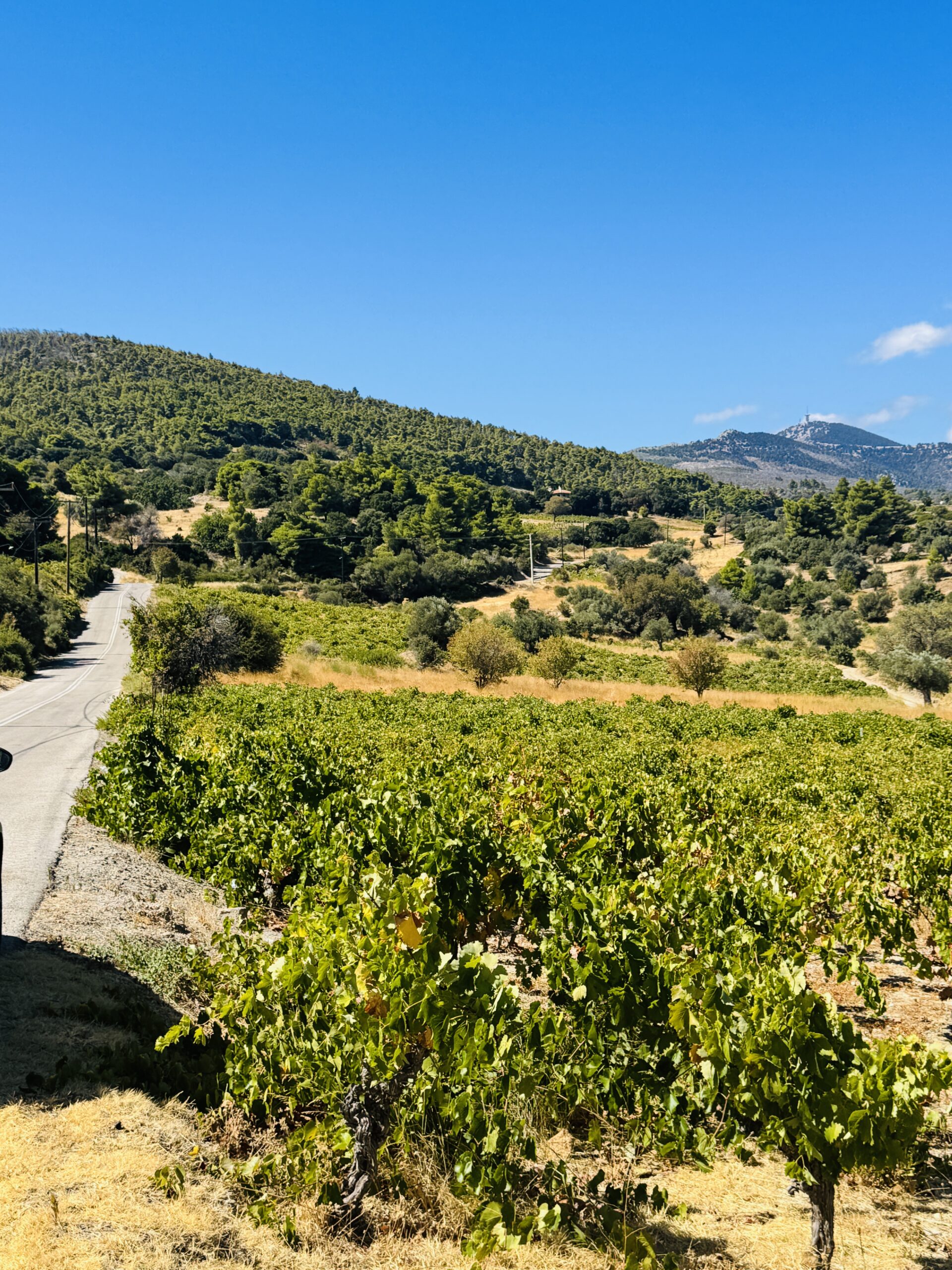 Καθώς φτάνουμε στην καρδιά του αμπελώνα, ο Σπύρος μου δείχνει τις διαφορετικές ποικιλίες. «Αυτό εδώ είναι Σαββατιανό», λέει, δείχνοντας μια σειρά με πιο ανοιχτόχρωμα φυλλώματα. «Καλύπτει το 80% του αττικού αμπελώνα. Από αυτό φτιάχνουμε τη ρετσίνα, αλλά και εξαιρετικά λευκά κρασιά όταν κρατάμε χαμηλές τις αποδόσεις».