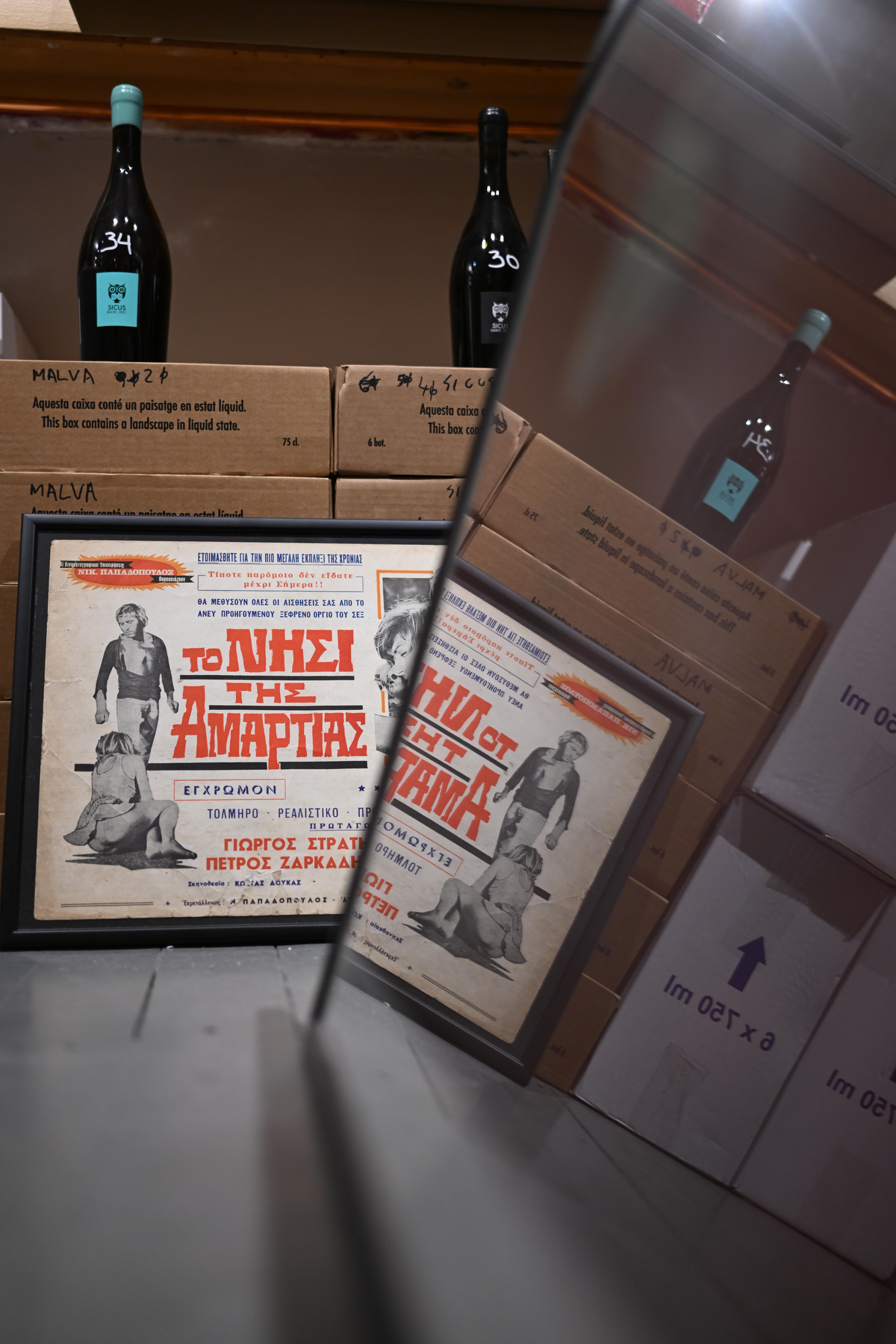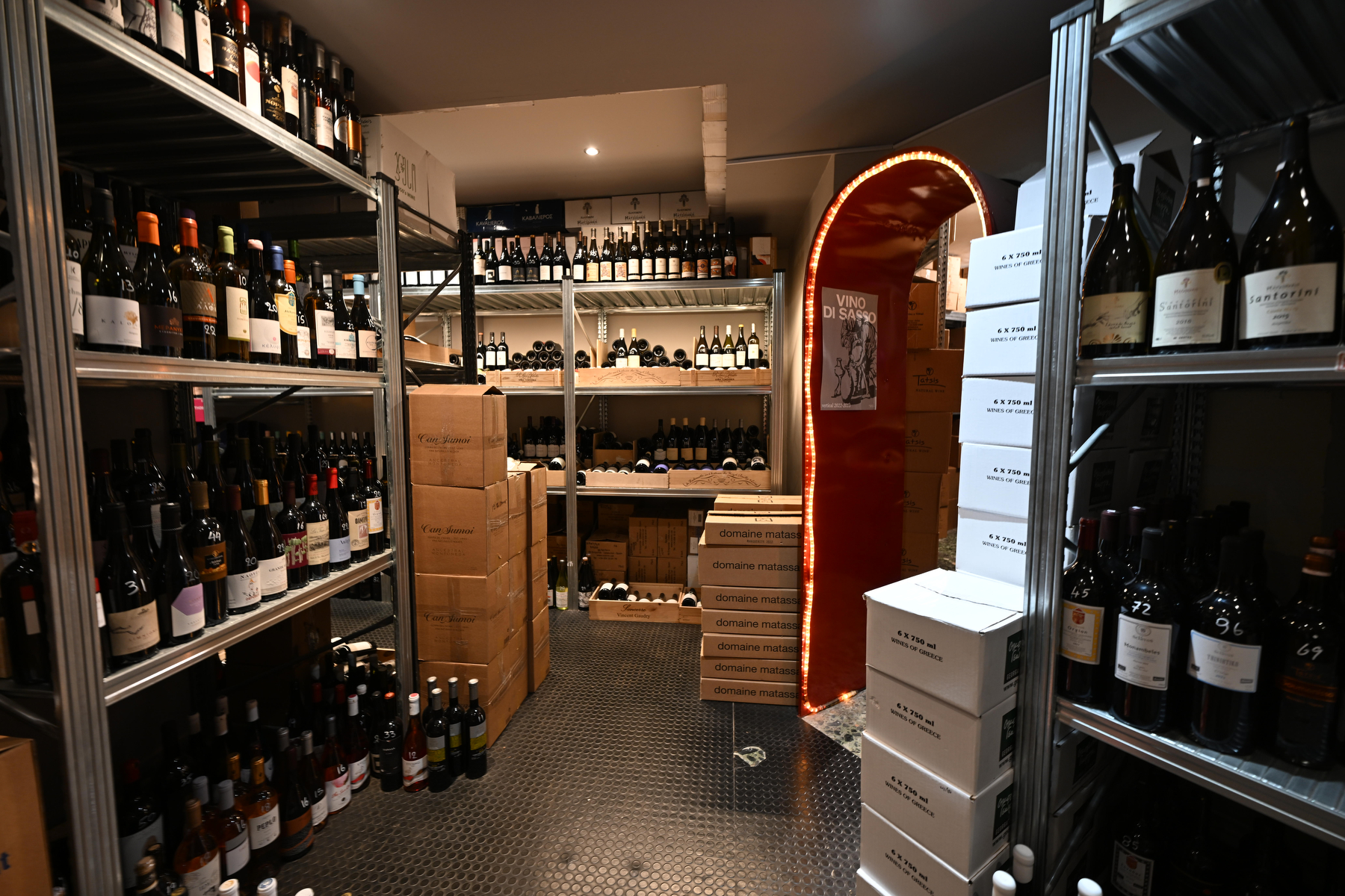 «Εδώ έχουμε κάποια από τα τελευταία κρασιά του Χαρίδημου Χατζηδάκη», μας λέει δείχνοντας μια συγκεκριμένη συλλογή του εκλιπόντος οινοποιού από τη Σαντορίνη. «Η οικογένειά του συνεχίζει το έργο του, διατηρώντας τη φιλοσοφία και την ποιότητα που τον έκαναν θρύλο». Ο χώρος διατηρείται σε σταθερή θερμοκρασία, κάτω από τους 18 βαθμούς Κελσίου -ιδανικές συνθήκες συντήρησης και παλαίωσης. Από το πικάπ στη γωνία ακούγεται διακριτικά τζαζ, μια μουσική υπόκρουση που συμπληρώνει την vintage αισθητική του χώρου, δημιουργώντας μια ατμόσφαιρα που σε προσκαλεί να εξερευνήσεις, να ανακαλύψεις, να γευτείς.