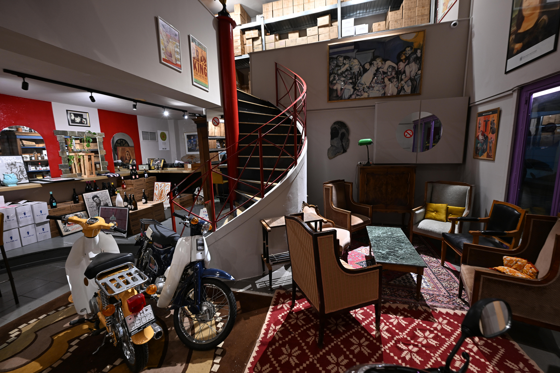«Τι κρύβεται πίσω από αυτή την κόκκινη πόρτα;» ρωτώ, δείχνοντας στο βάθος του χώρου. Ο Πέρι χαμογελά, σαν να περίμενε την ερώτηση. «Αυτή είναι η επόμενη έκπληξη», απαντά και μας οδηγεί προς τα εκεί. Η κόκκινη πόρτα ανοίγει σε έναν δεύτερο χώρο, που αποκαλύπτεται να είναι το διπλανό μαγαζί που κάποτε λειτουργούσε επίσης ως μπαρ. «Όταν έκλεισε, αποφάσισα να το εντάξω κι αυτό στο Wine Kiosk», εξηγεί. «Είναι τώρα ο χώρος γευσιγνωσίας μας». Αυτό που εντυπωσιάζει είναι η διακριτική παρέμβαση του Πέρι στον χώρο. Έχει διατηρήσει σχεδόν άθικτη την προηγούμενη ταυτότητά του, προσθέτοντας απλώς το δικό του αποτύπωμα. Το παλιό μπαρ στέκει ακόμα στη θέση του, αλλά τώρα φιλοξενεί σειρές από ποτήρια γευσιγνωσίας και επιλεγμένες φιάλες. Δύο παλιά μηχανάκια, κλασικά 50άρια «παπάκια», στέκονται σαν γλυπτά στον χώρο, μια αναπάντεχη νότα νοσταλγίας που κάπως ταιριάζει απόλυτα με την ατμόσφαιρα.