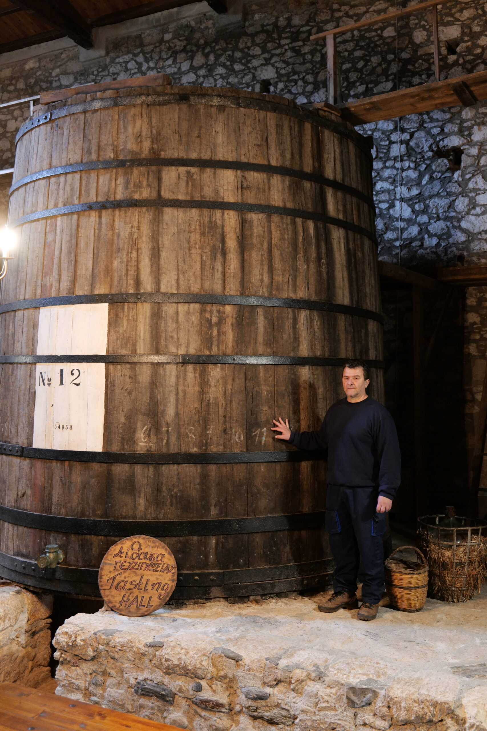 Στην αίθουσα με τα τεράστια, ακλόνητα βαρέλια, μας περιμένει και ο Γιώργος Δαγλής, βαρελοποιός αλλά και συντηρητής βαρελιών για πάνω από 40 χρόνια. Καθώς στέκεται δίπλα σε ένα από ένα από τα δεκάδων τόνων βαρέλια, μοιάζει σαν να αγγίζει το περίβλημα όλης της ιστορίας του κρασιού στη Σάμο. Σήμερα, αυτοί οι γίγαντες απλώς στολίζουν το μουσείο. Το πολύτιμο προϊόν ωριμάζει σε δρύινα βαρέλια από 225 έως 750 λίτρα σε διαφορετική αίθουσα, στο υπόγειο του κτιρίου.