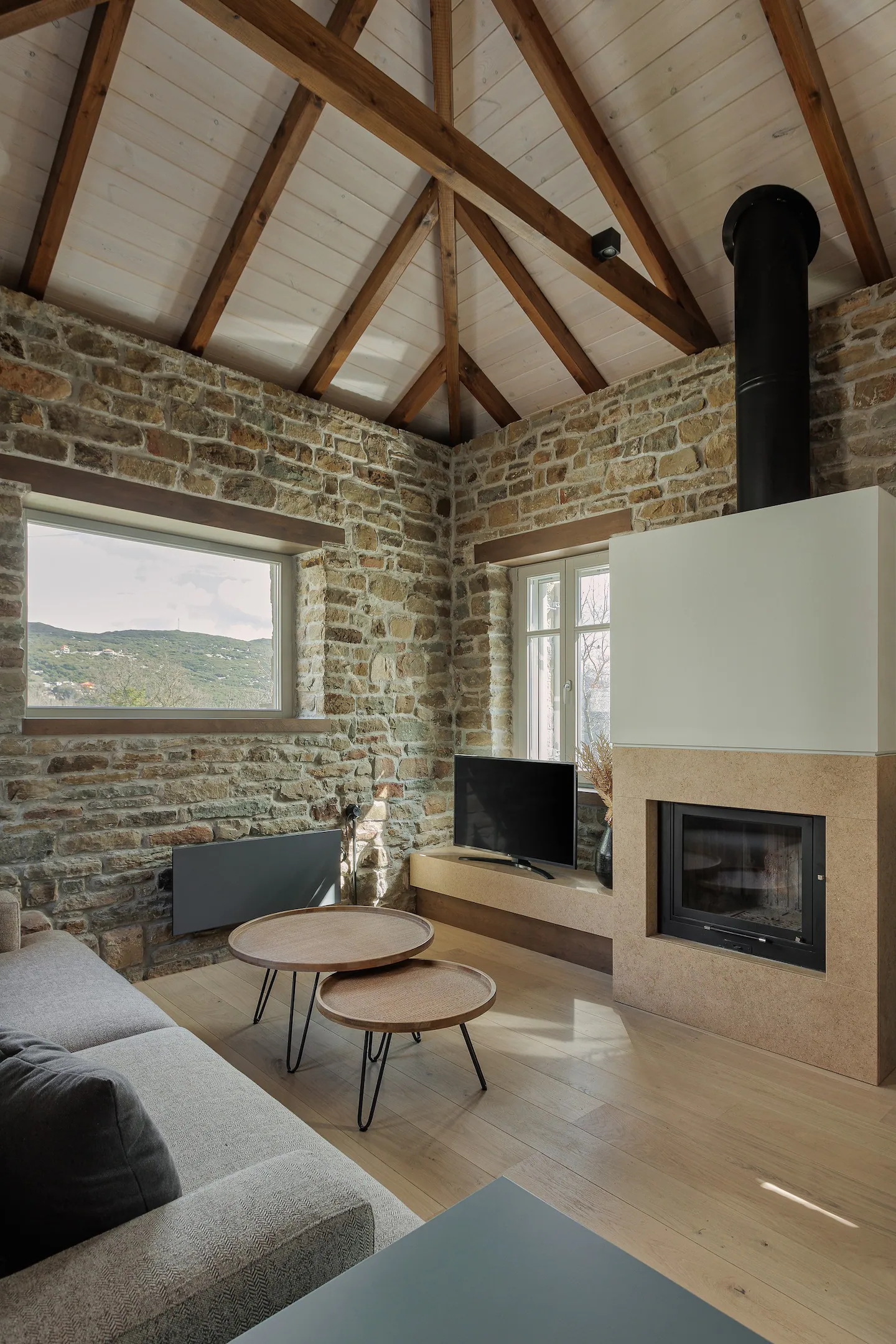 Κάποια δωμάτια εκτείνονται σε δύο διαφορετικούς ορόφους, σαν μικρές μεζονέτες, ενώ το σαλόνι-τραπεζαρία διαθέτει ένα πολύ όμορφο τζάκι.