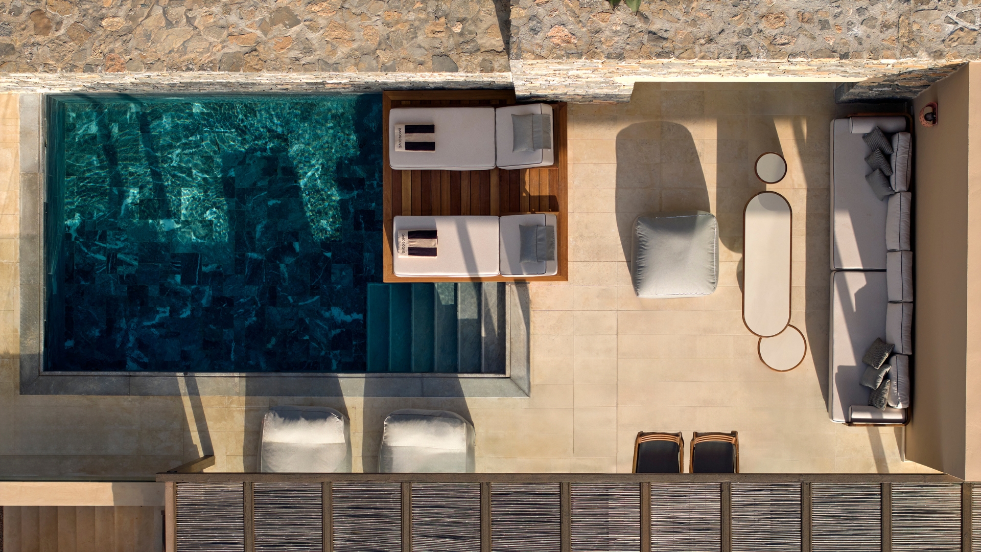 Με εξωτερικό χώρο 76 τ.μ., οι σουίτες διαθέτουν ιδιωτική πισίνα 30 τ.μ., τραπεζαρία και ξαπλώστρες, καθώς και άνετο καθιστικό με καναπέ-κρεβάτι, προσφέροντας ιδανική διαμονή για έως και 5 ενήλικες. Τα δύο υπνοδωμάτια είναι εξαιρετικά επιπλωμένα και εξοπλισμένα με king size ή δίκλινα κρεβάτια, εξασφαλίζοντας έναν ξεκούραστο και αναζωογονητικό ύπνο. Ένα από τα highlights της σουίτας είναι η ντουζιέρα τύπου βροχής, που προσφέρει θέα σε μια ιδιωτική αυλή, δημιουργώντας μια μοναδική εμπειρία χαλάρωσης.